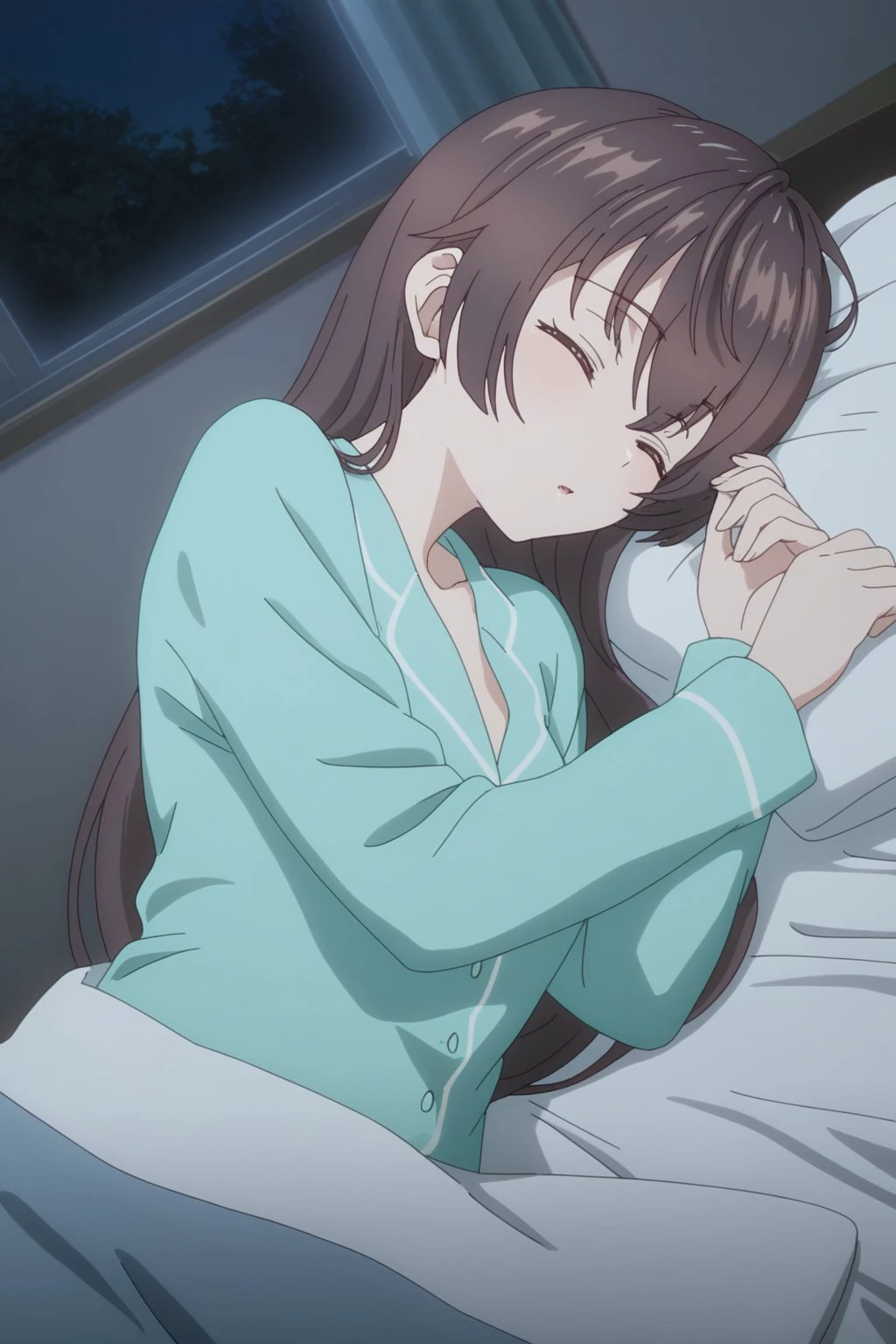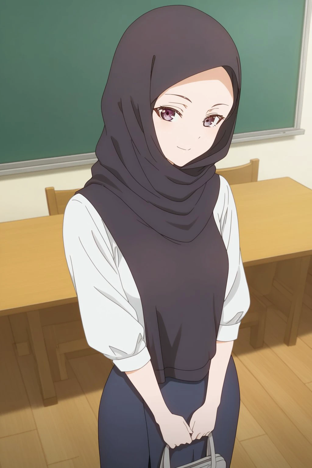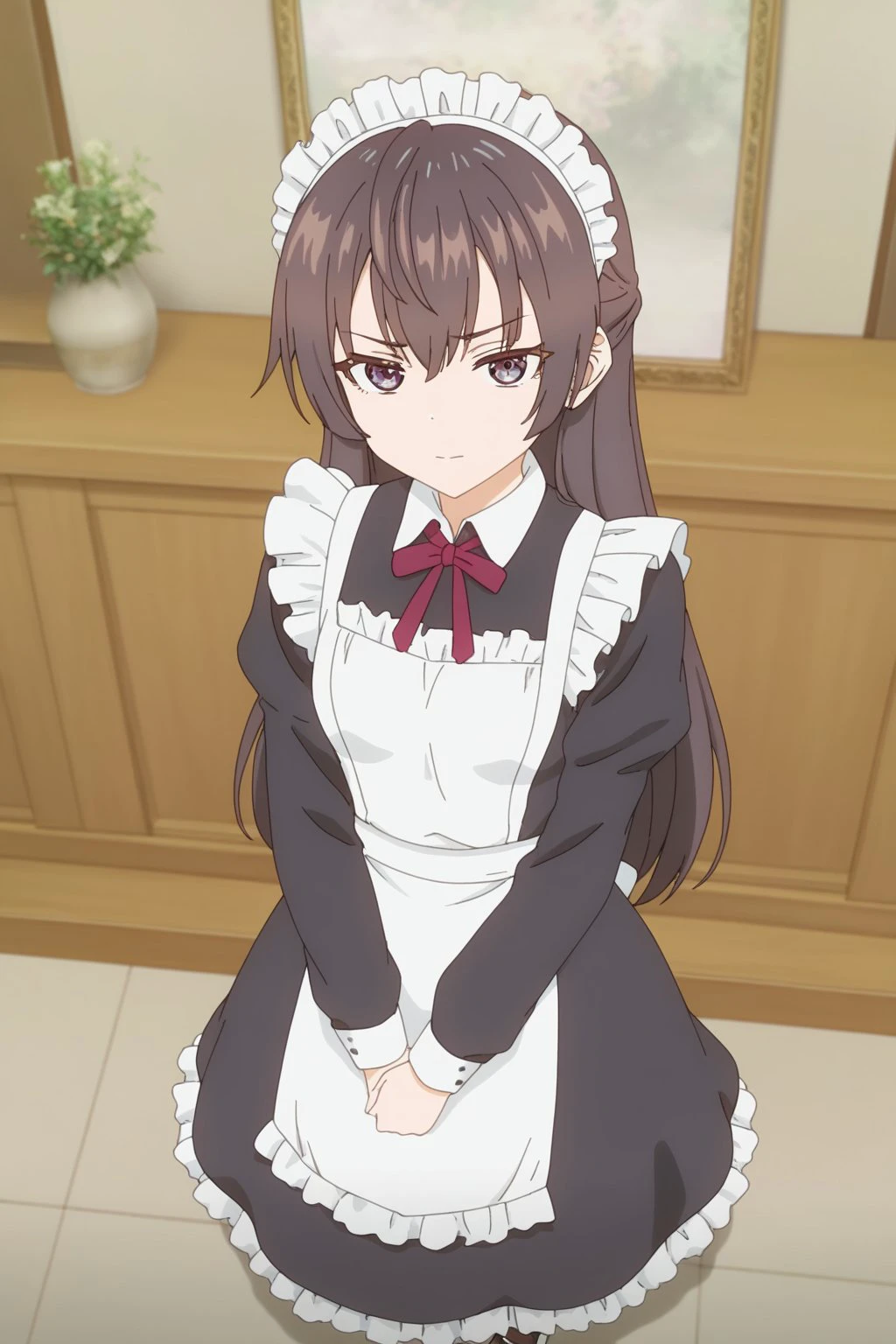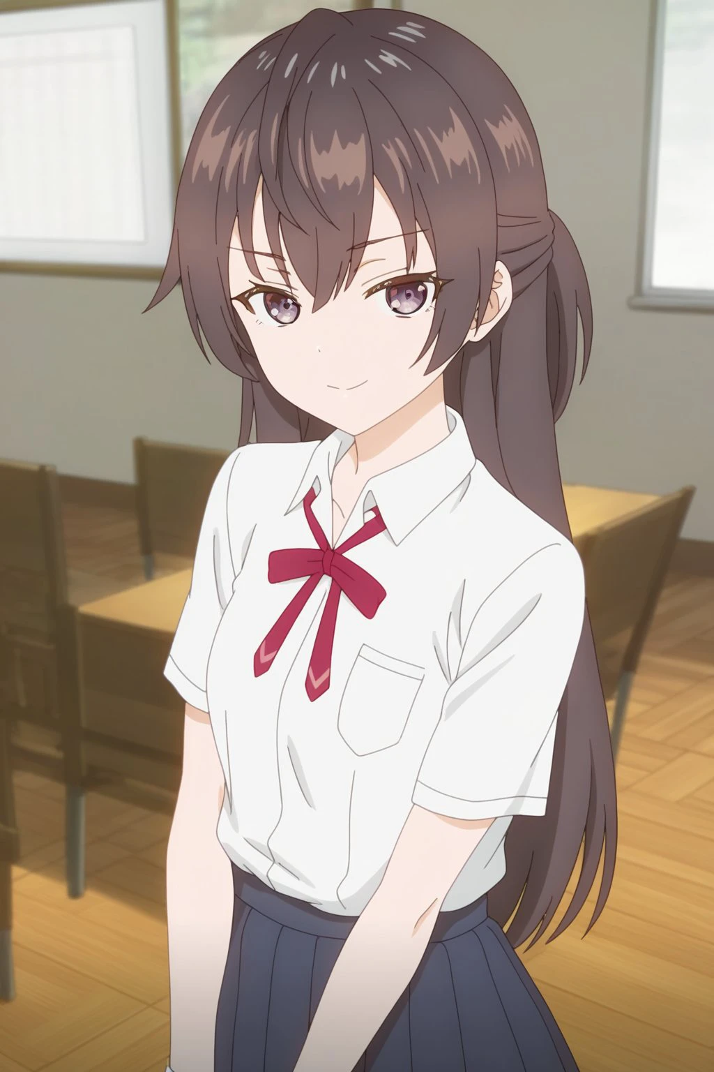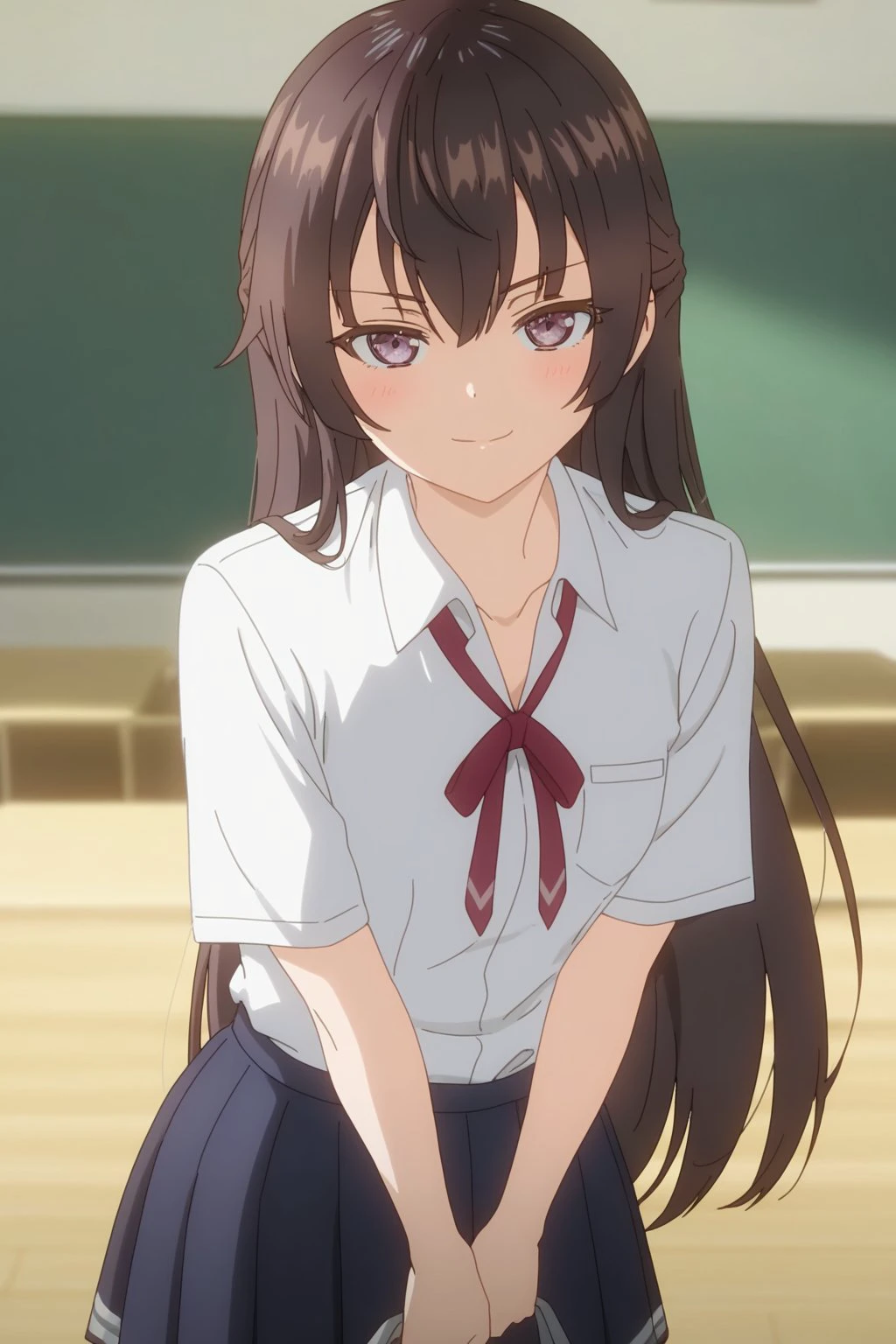 (((((Flat art))))), masterpiece, best quality, score_9up, score_8_up, score_7_up, source_anime, amazing quality, highres, absurdres, newest, fine details, Yuki suou, solo, breasts, small breasts, long hair, brown hair, bangs, (purple eyes),