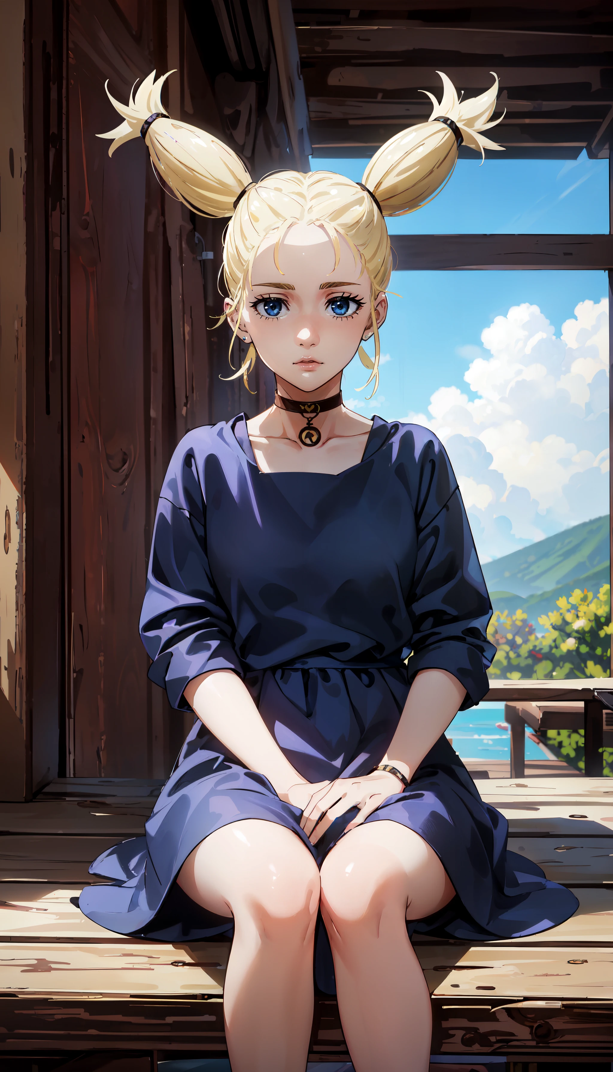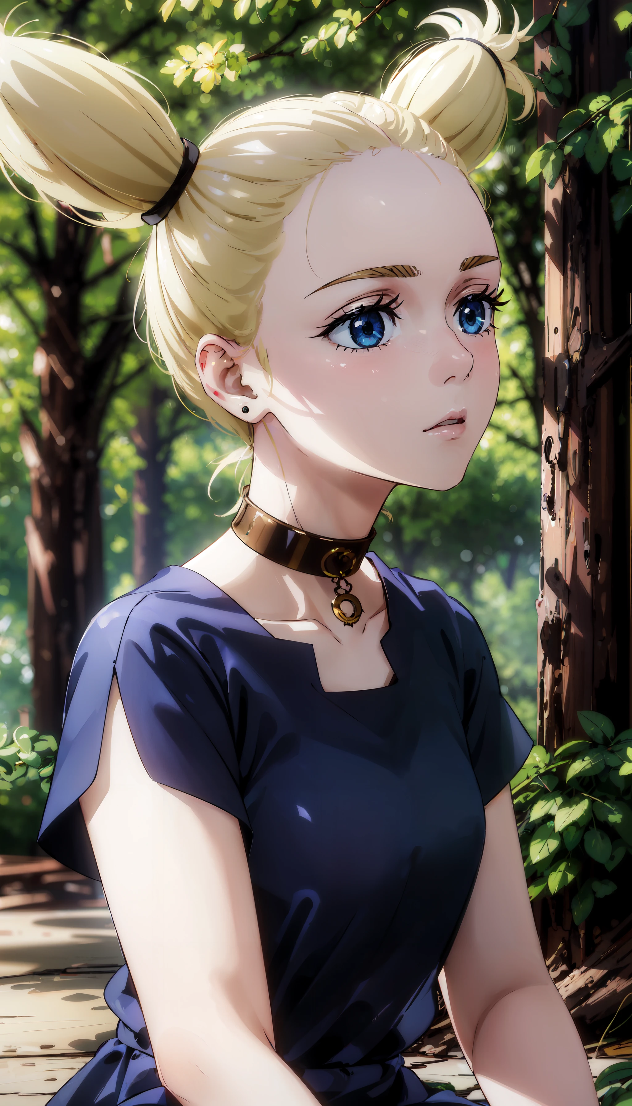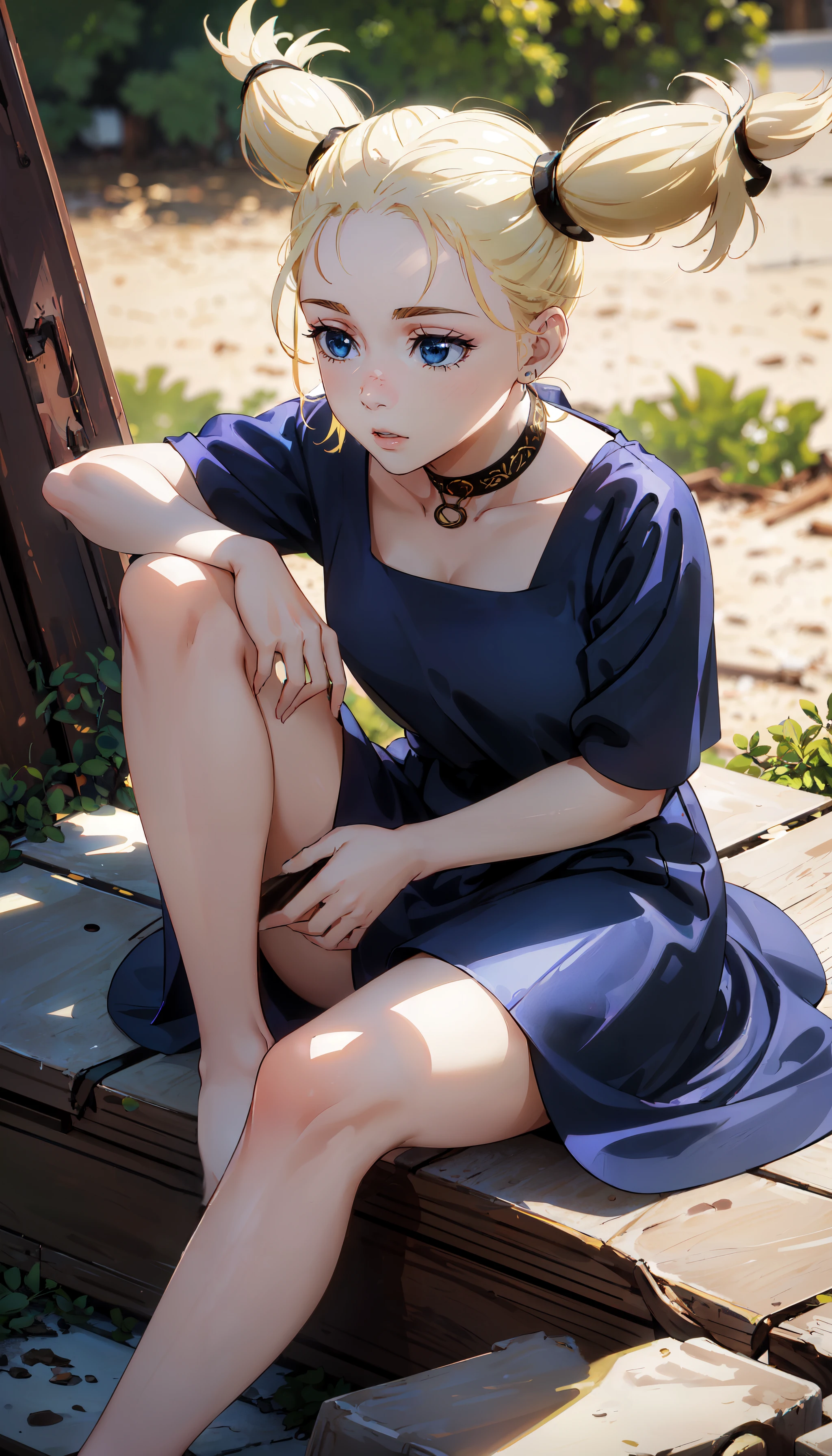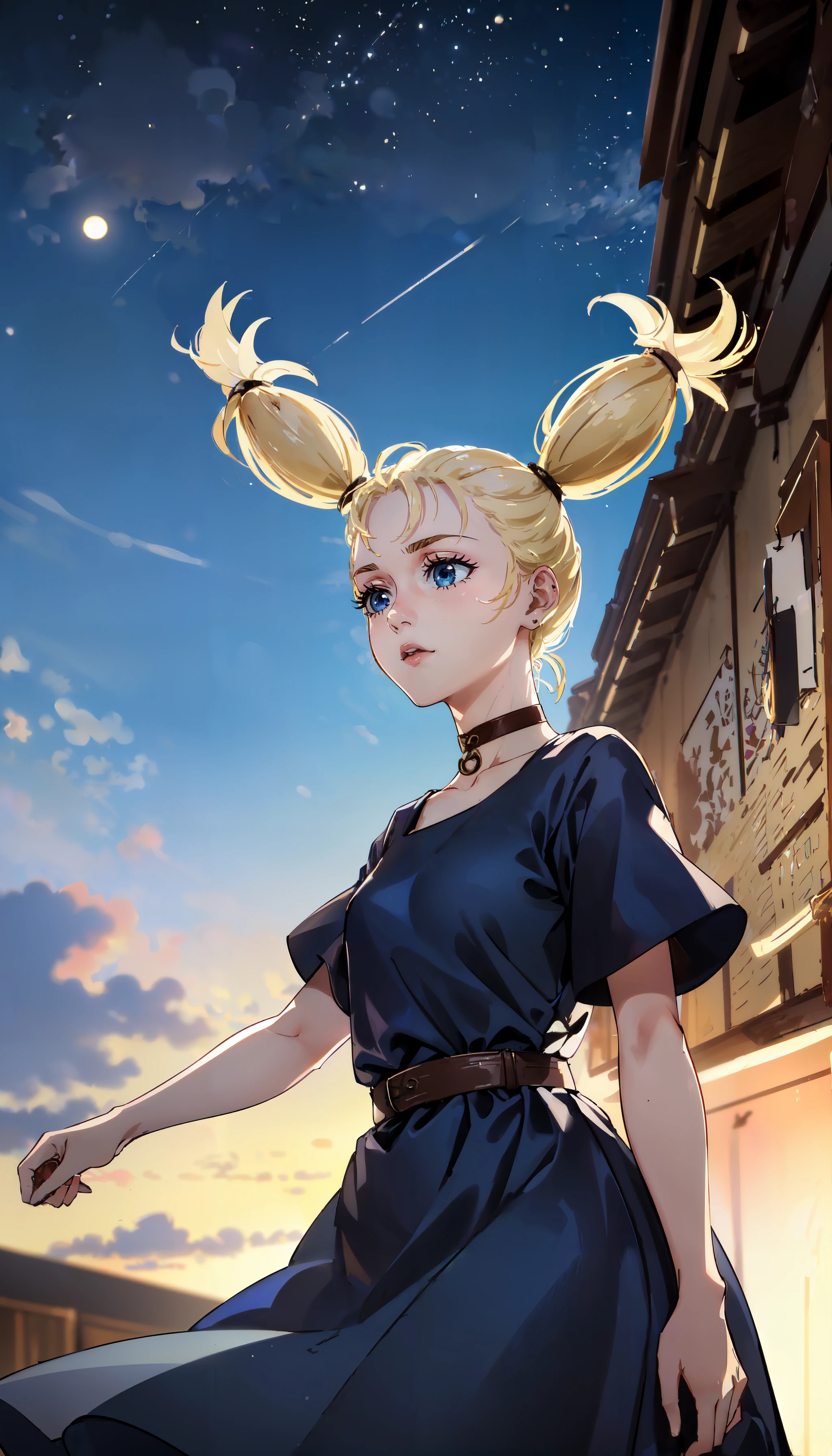 blonde hair, twintails, hair up, blue eyes, choker, blue dress, long dressDescription