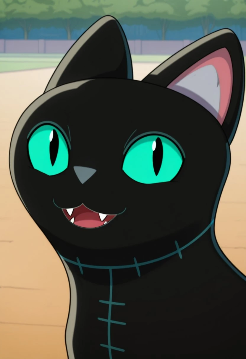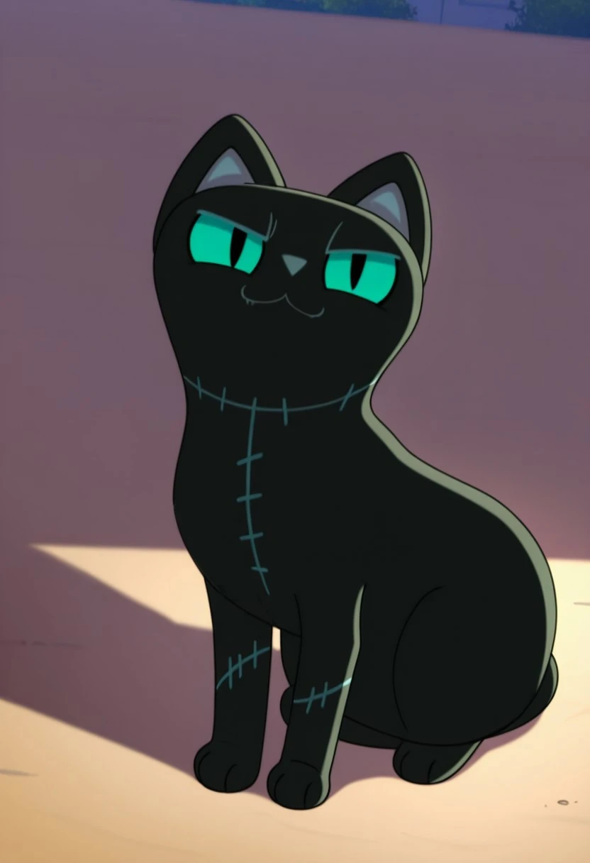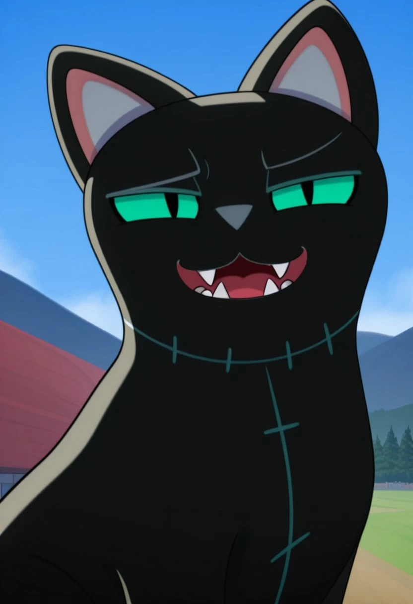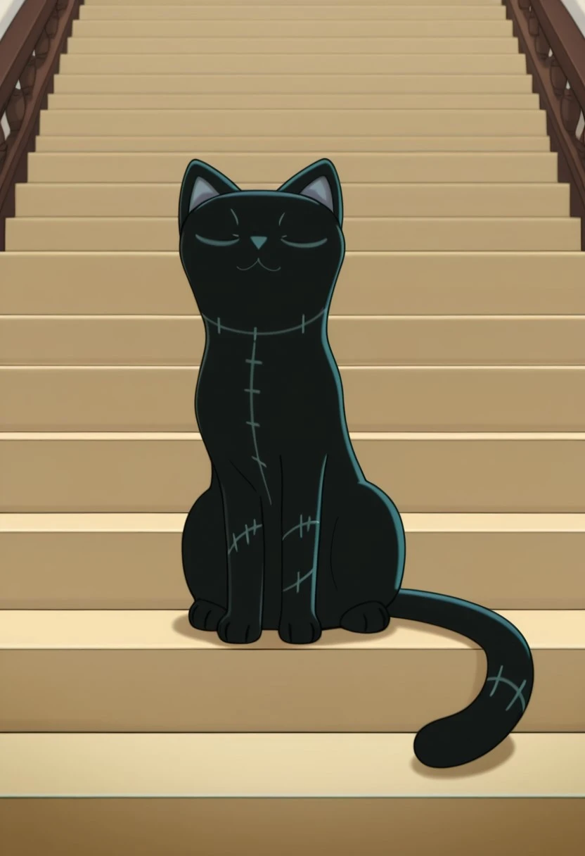 A stitched-up black cat who was formerly owned by a sorceress, now owned by a monster hunter.