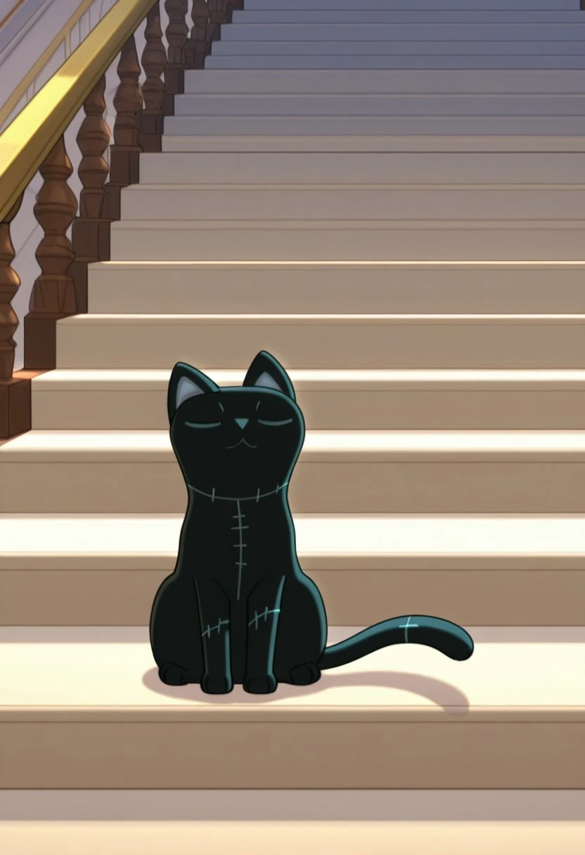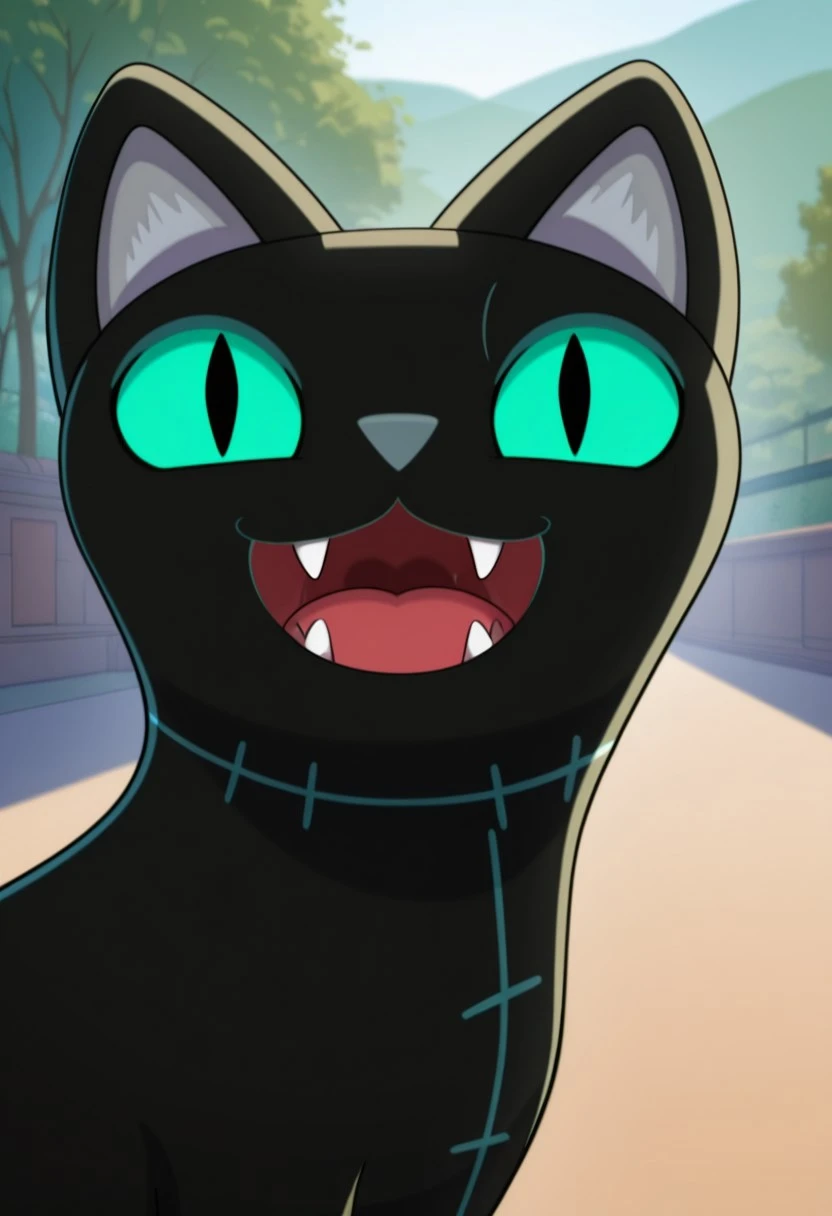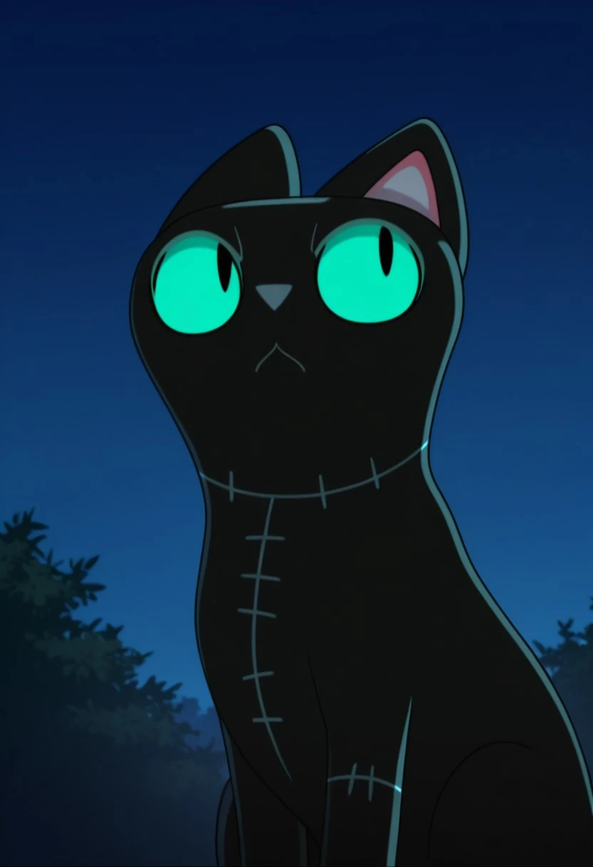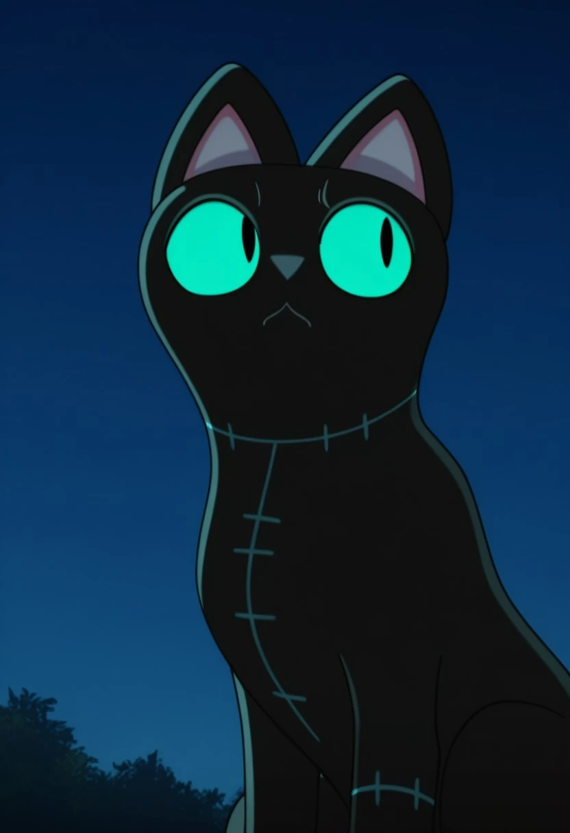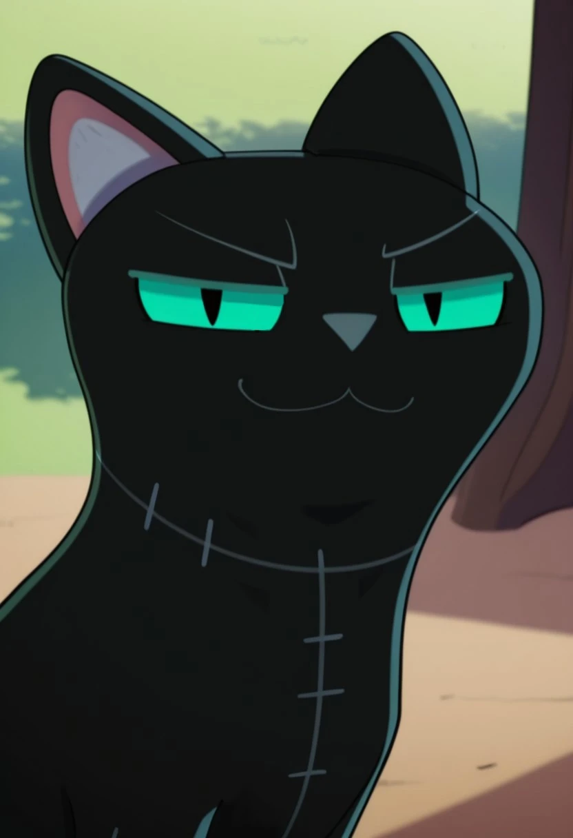 A stitched-up black cat who was formerly owned by a sorceress, now owned by a monster hunter.