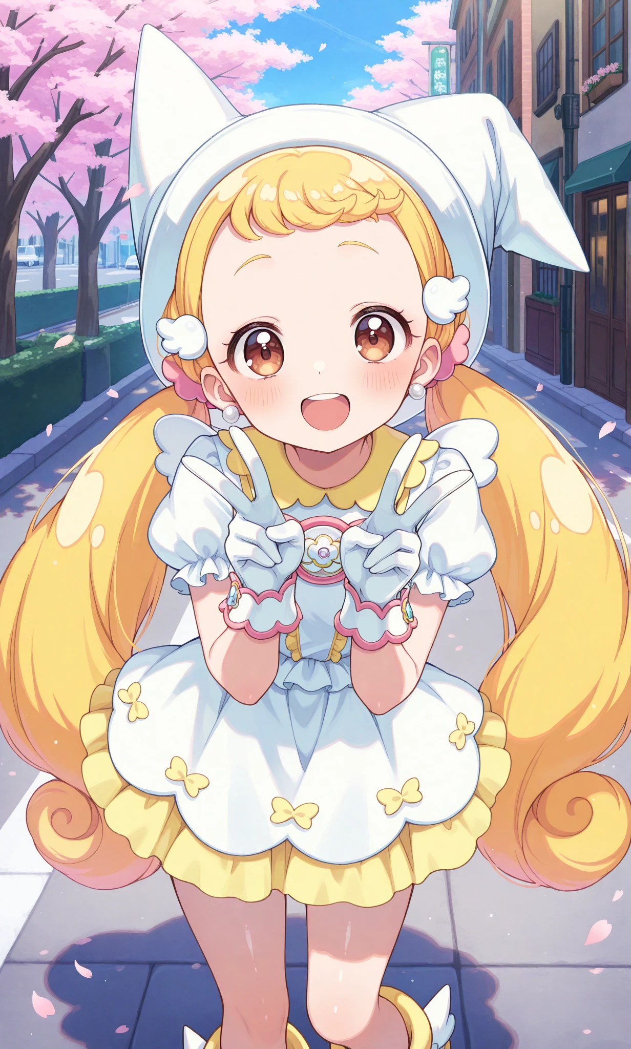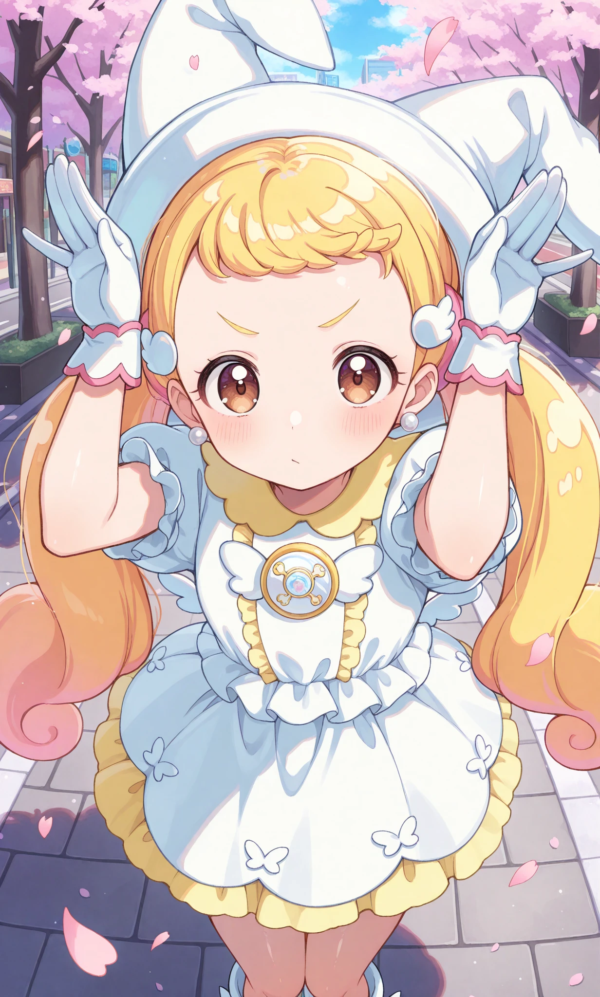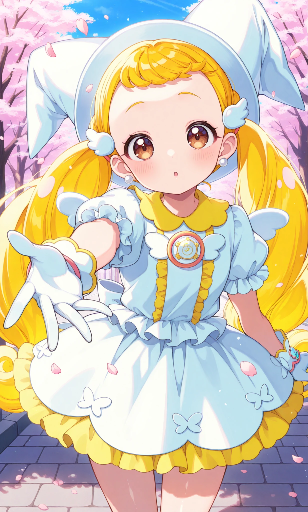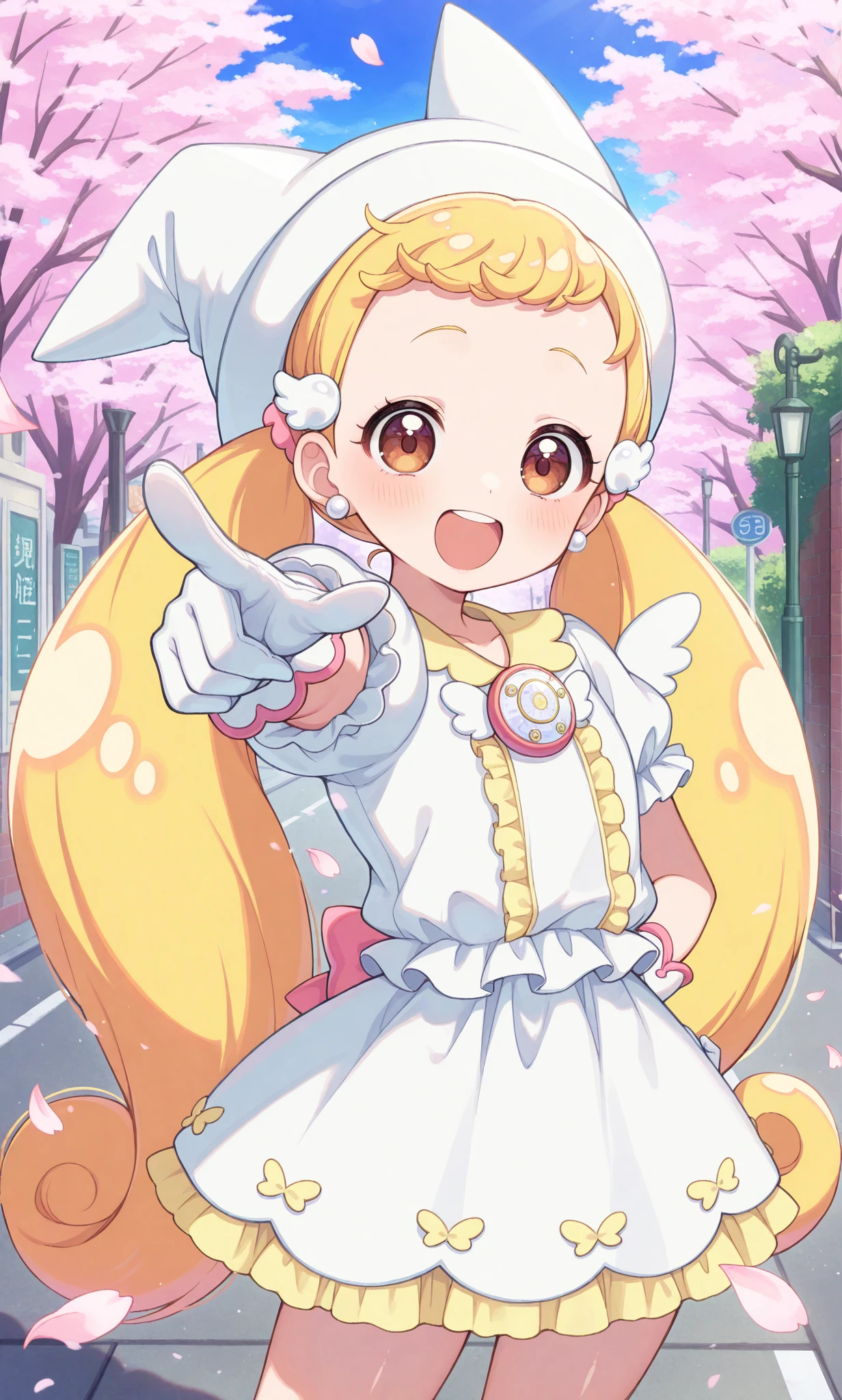 magical girl, pointy hat, white dress, puffy short sleeves, white gloves, pointy footwear, frills, yellow miniskirt, mini wings