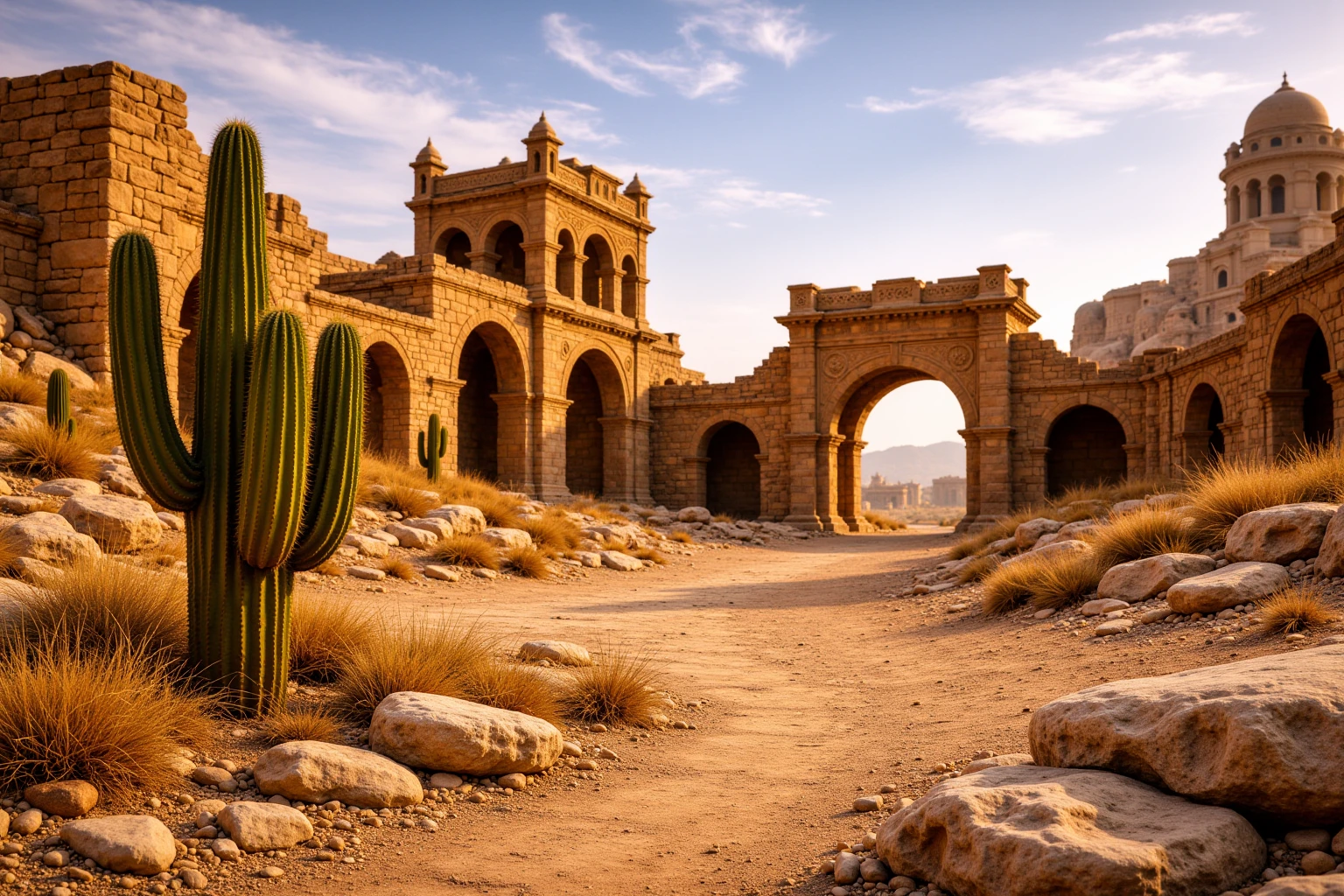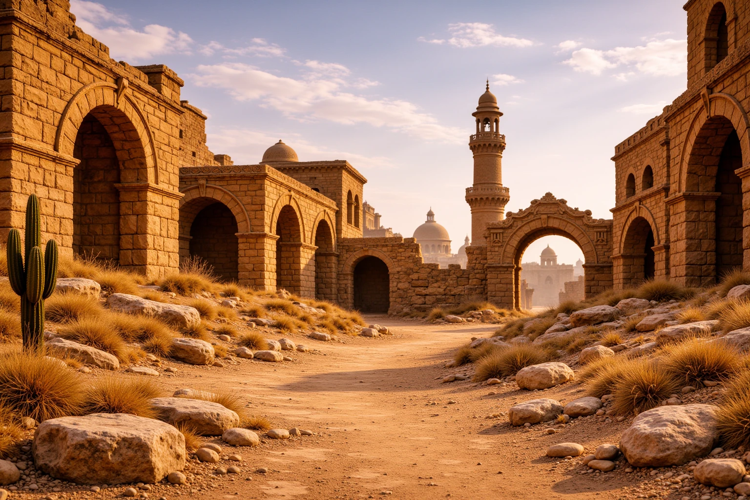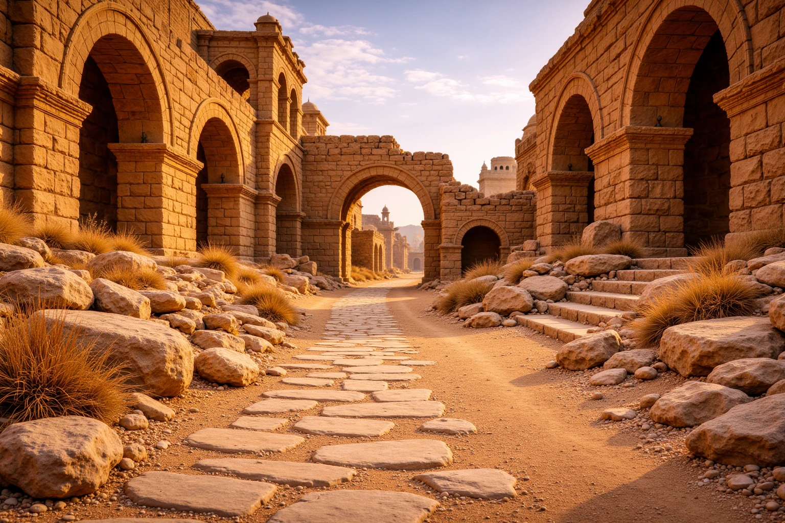 ancient desert ruined city, vast sandstone ruins with arches, domes and minarets, collapsed and eroded stone architecture, sand-covered streets and worn stone pathways, monumental scale, layered city depth, warm golden sunlight, dusty desert atmosphere, soft haze in the istance, eye-level human perspective, cinematic realism, no people, no animals, no modern elements