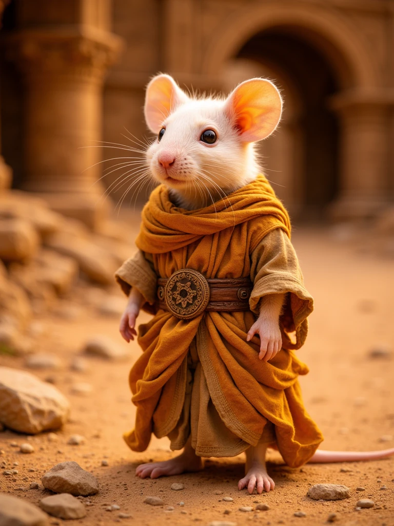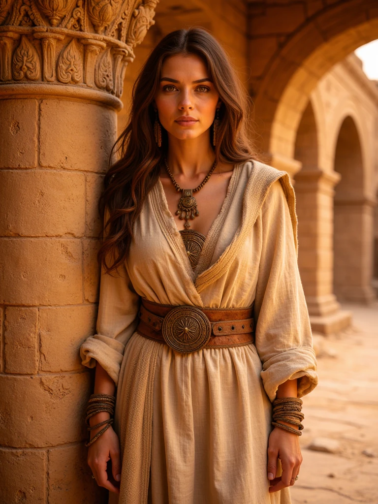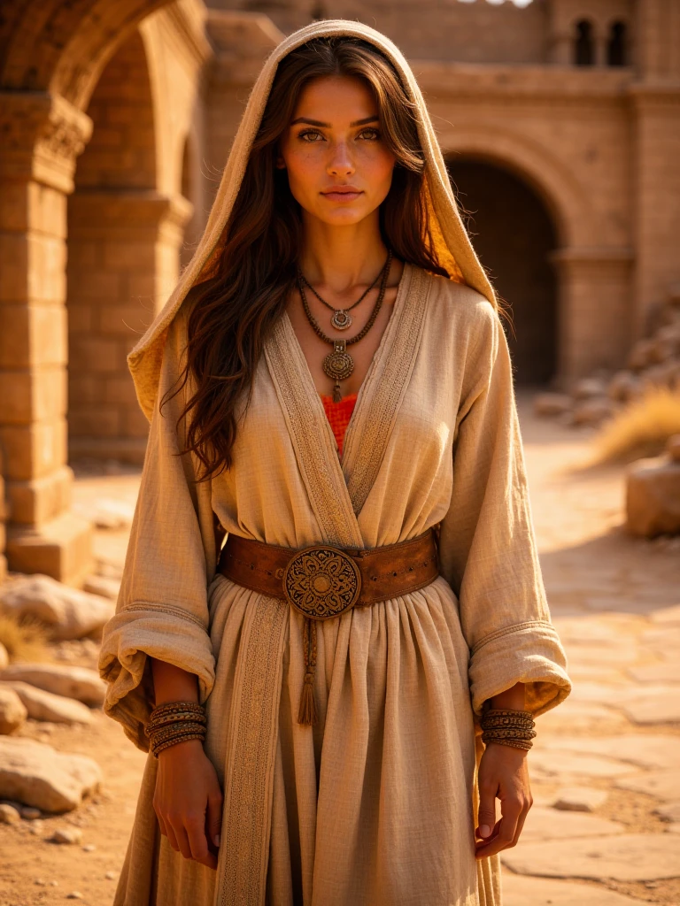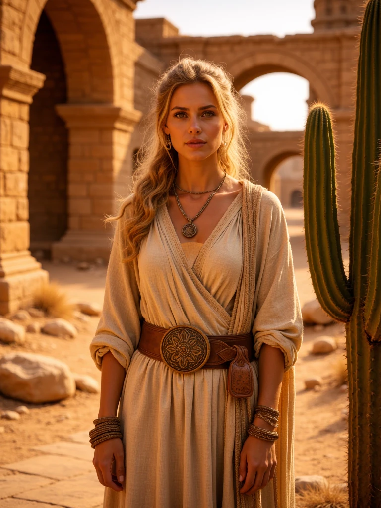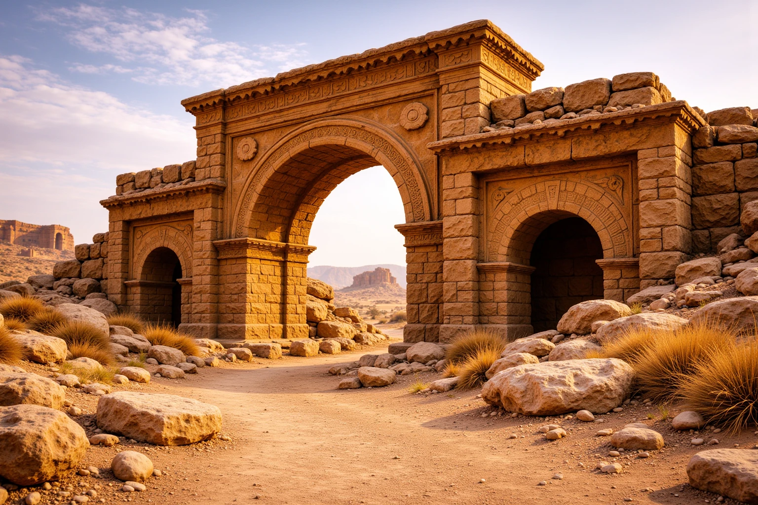 ancient desert ruined city, vast sandstone ruins with arches, domes and minarets, collapsed and eroded stone architecture, sand-covered streets and worn stone pathways, monumental scale, layered city depth, warm golden sunlight, dusty desert atmosphere, soft haze in the istance, eye-level human perspective, cinematic realism, no people, no animals, no modern elements