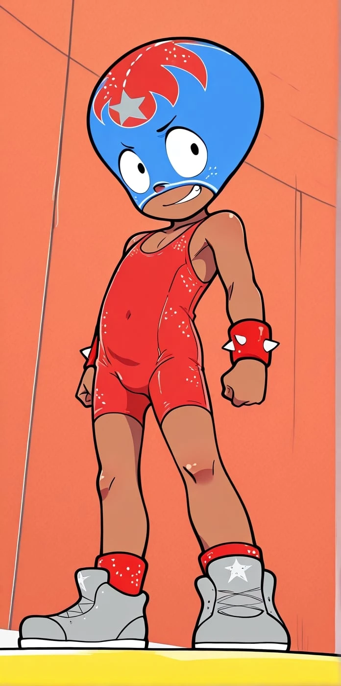 Rikochet, 1boy, short, small body, large head, dark-skinned, black eyes, dot eyes, wrestler, wrestling singlet, Rikochet mask, blue and red mask, thin gray mask outlines, gray star on mask, sleeveless red unitard, red wristbands with spikes, plain gray shoes,