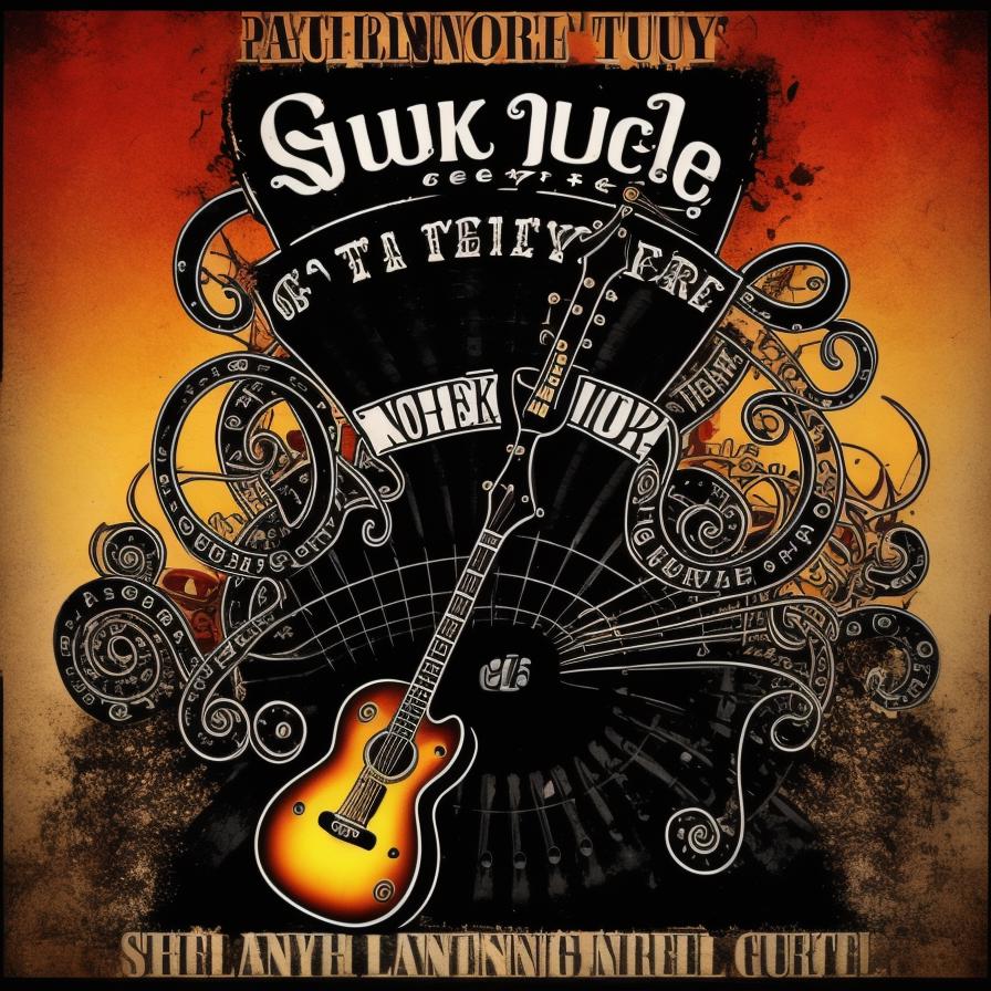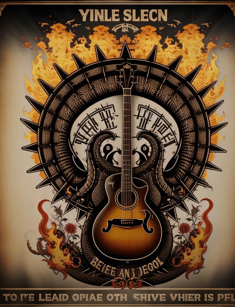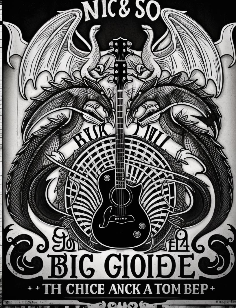 (((poster))), bird, guitar background, big dragon, fire <lora:VintageRock:1>