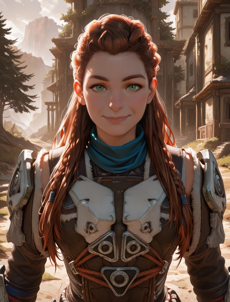 aloy, green eyes, or green pupils, - brown, or dark red hair,- long hair, braid,