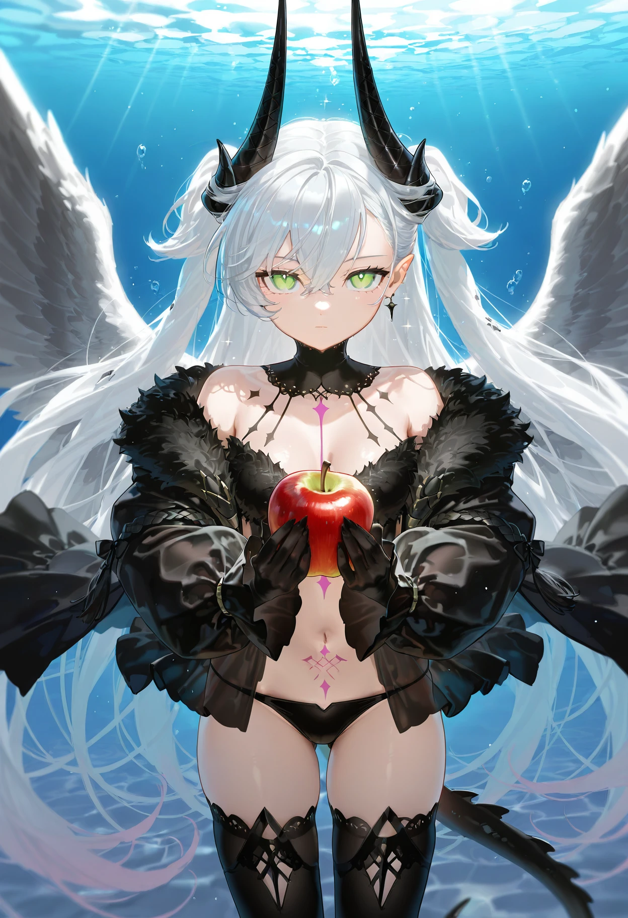 demon horns, demon wings, ear piercing, black hands, medium breasts, black choker, black cloak, open clothes, black panties, black thighhighs, black thigh boots,asc3