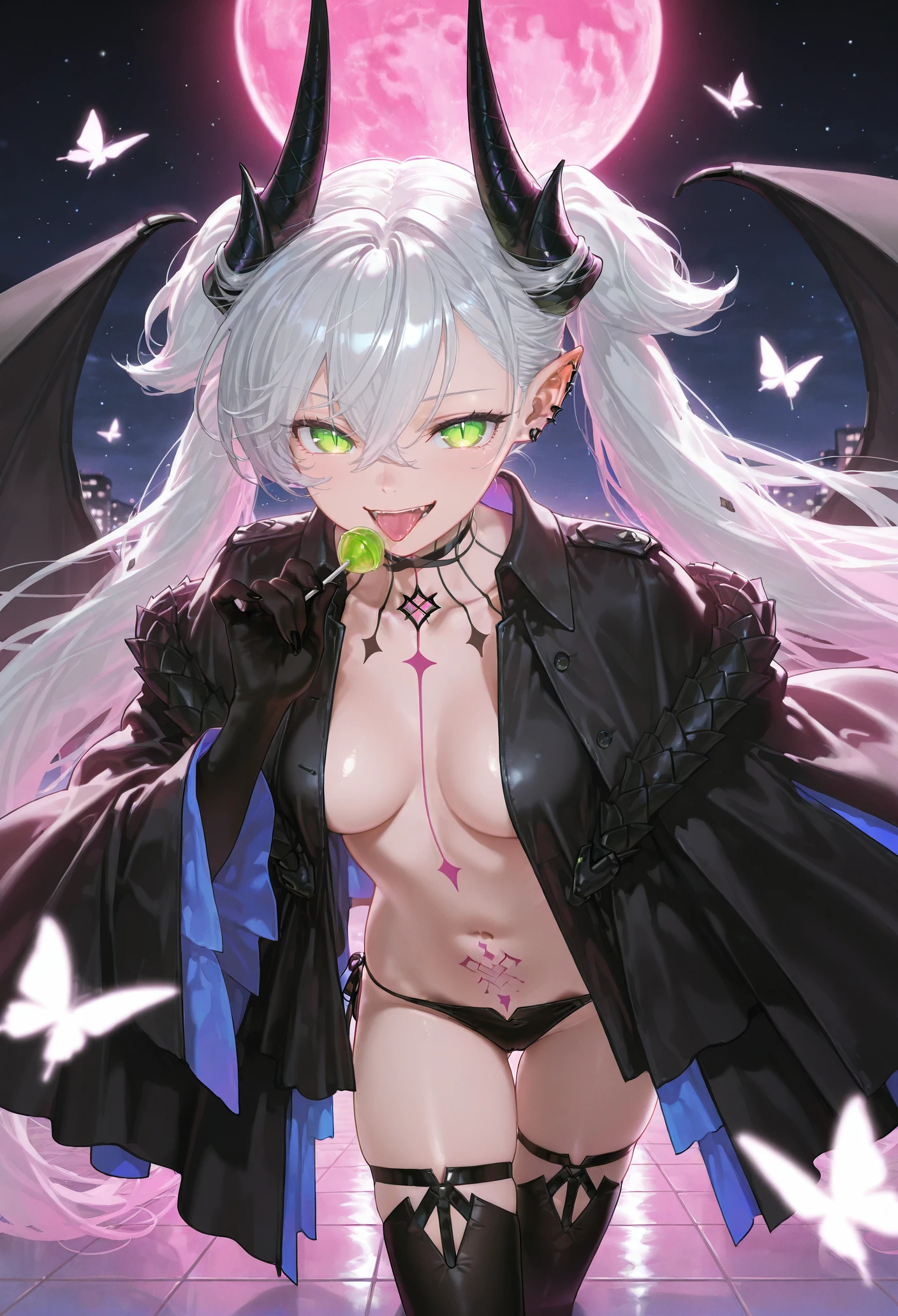 demon horns, demon wings, ear piercing, black hands, medium breasts, black choker, black cloak, open clothes, black panties, black thighhighs, black thigh boots,