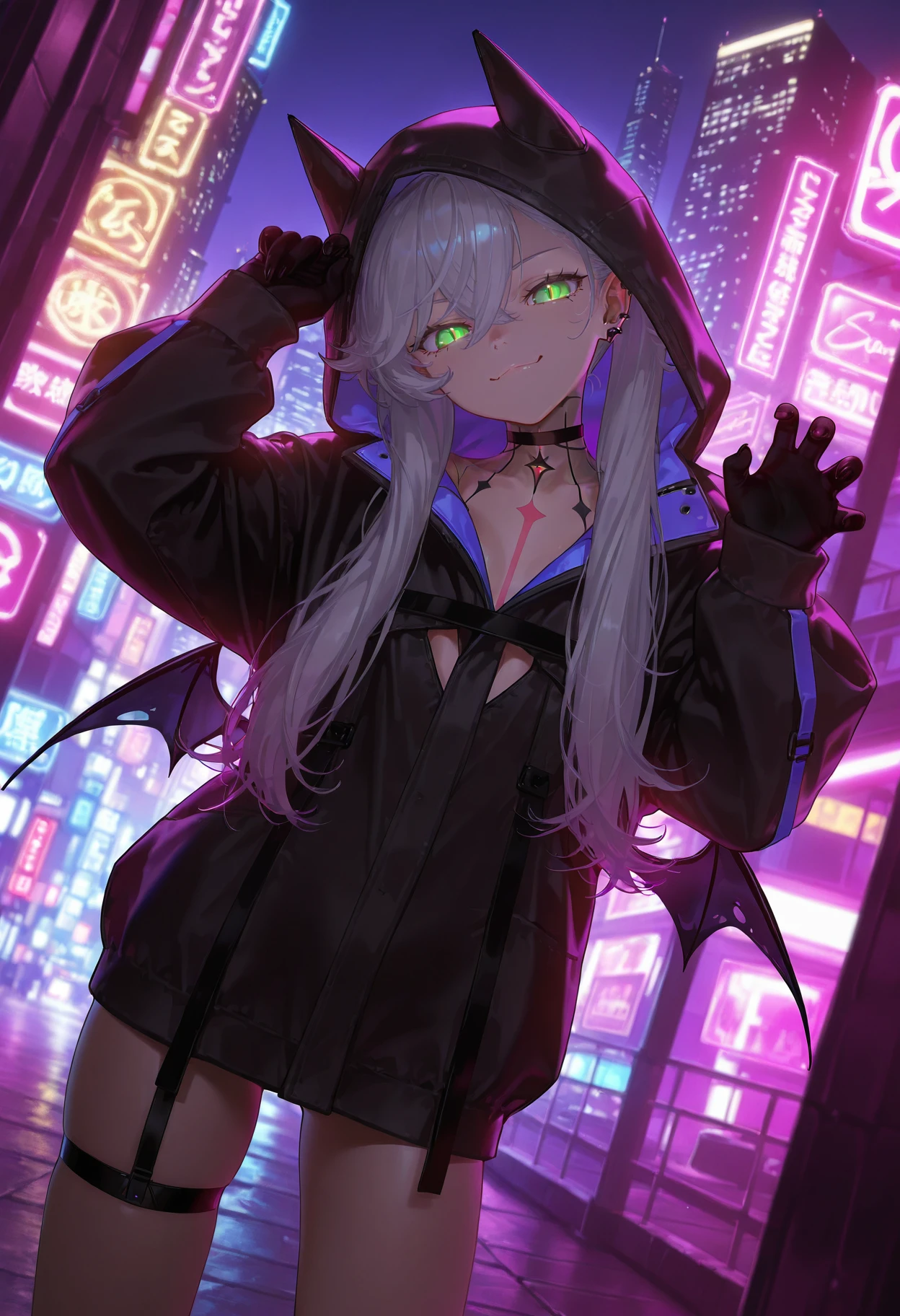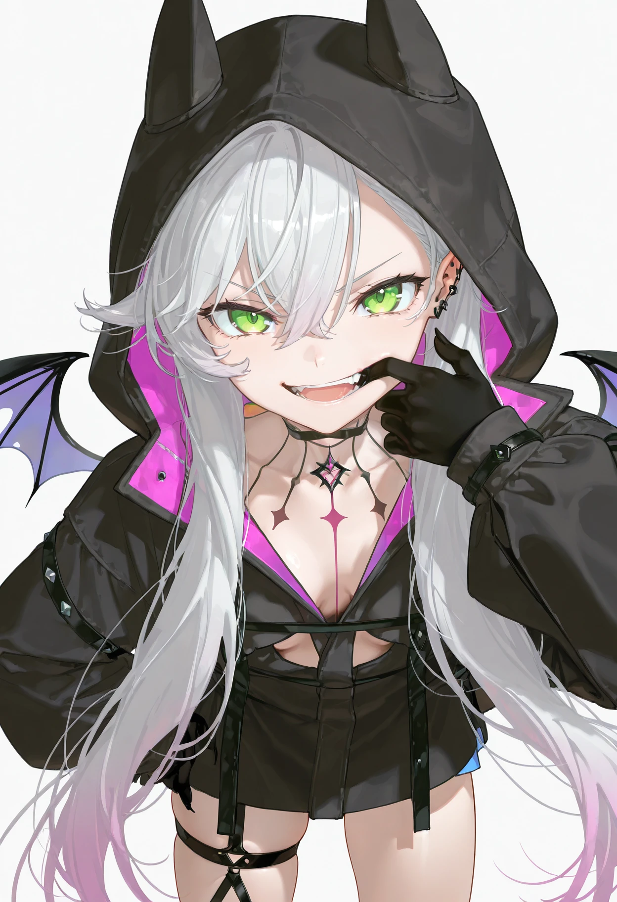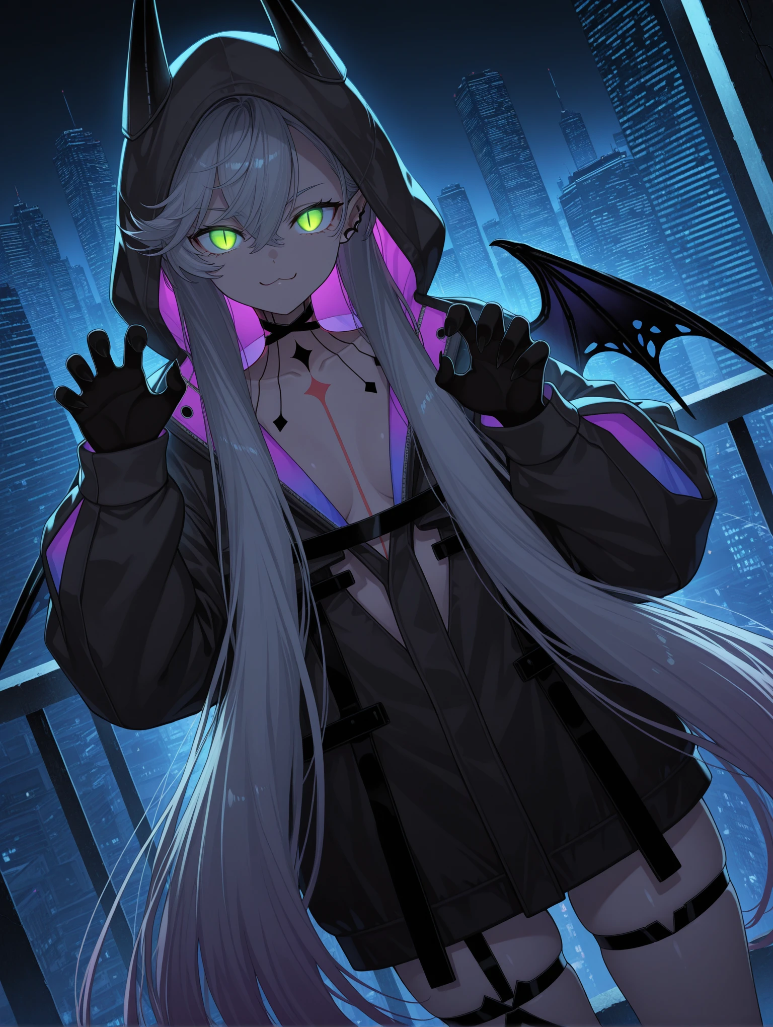 hood, black hoodie, black choker, black hands, mini wings, ear piercing, thigh strap, black shoes,
