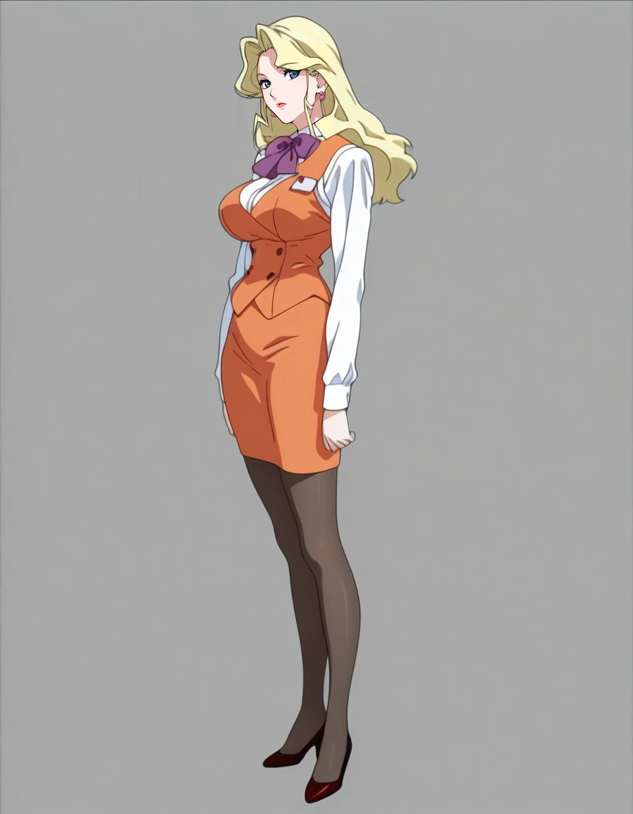 mai_lingeries,m_alice_nonoyama,long_hair,blonde_hair,blue_eyes,large_breasts,red_lips,earrings,shirt,long_sleeves,orange_vest,purple_bow,short_pencil_skirt,black pantyhose,red_high_heelsChisa Sakurai 桜井 千紗