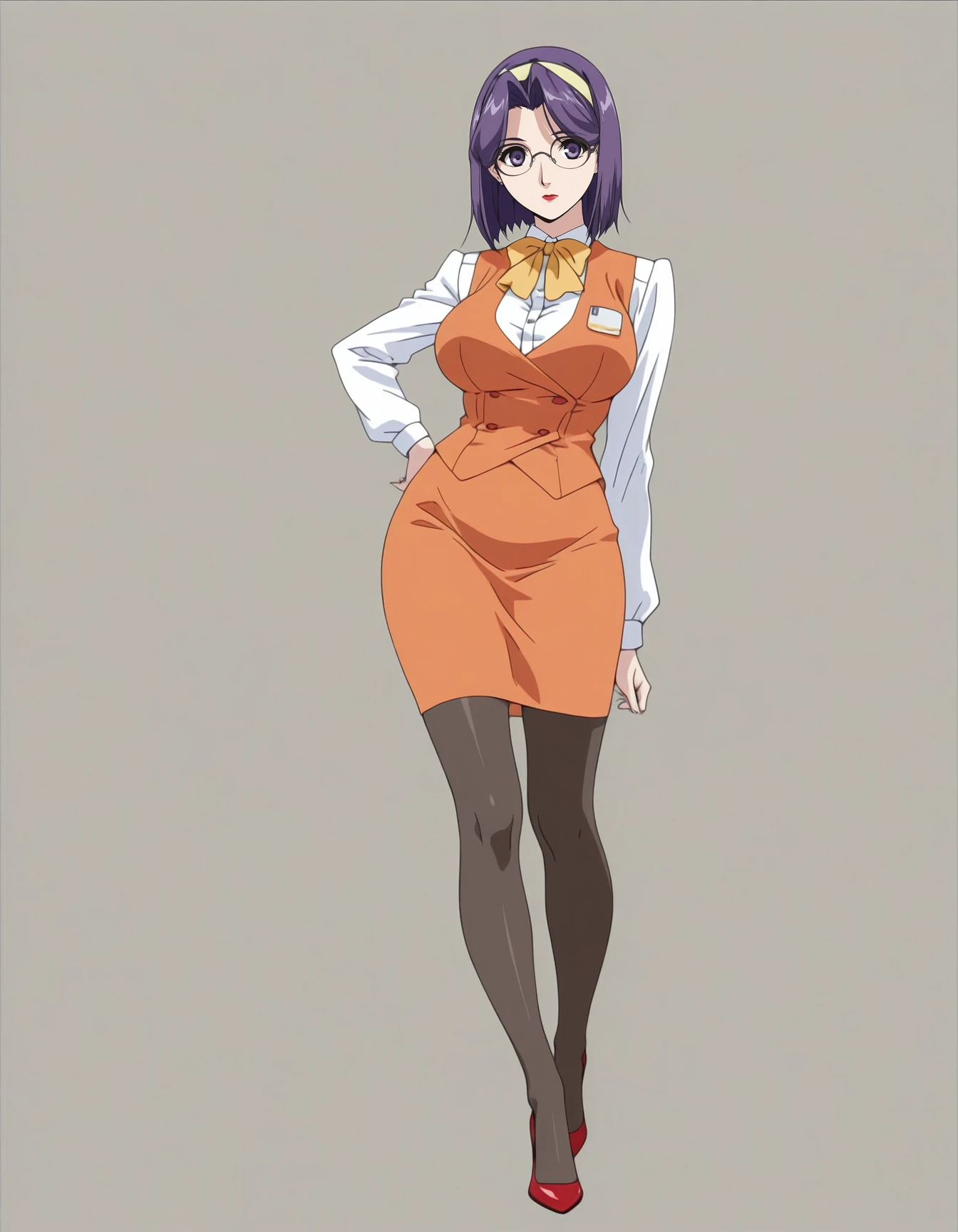 mai_lingeries,mai_chisa_sakurai,short_hair,purple_hair,purple_eyes,lipstick,red_lips,glasses,yellow_hairband,orange_vest,shirt,long_sleeves,yellow_bow,pencil_skirt,black pantyhose,red_high_heels