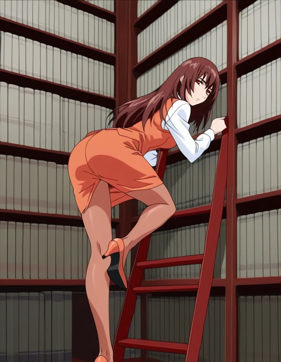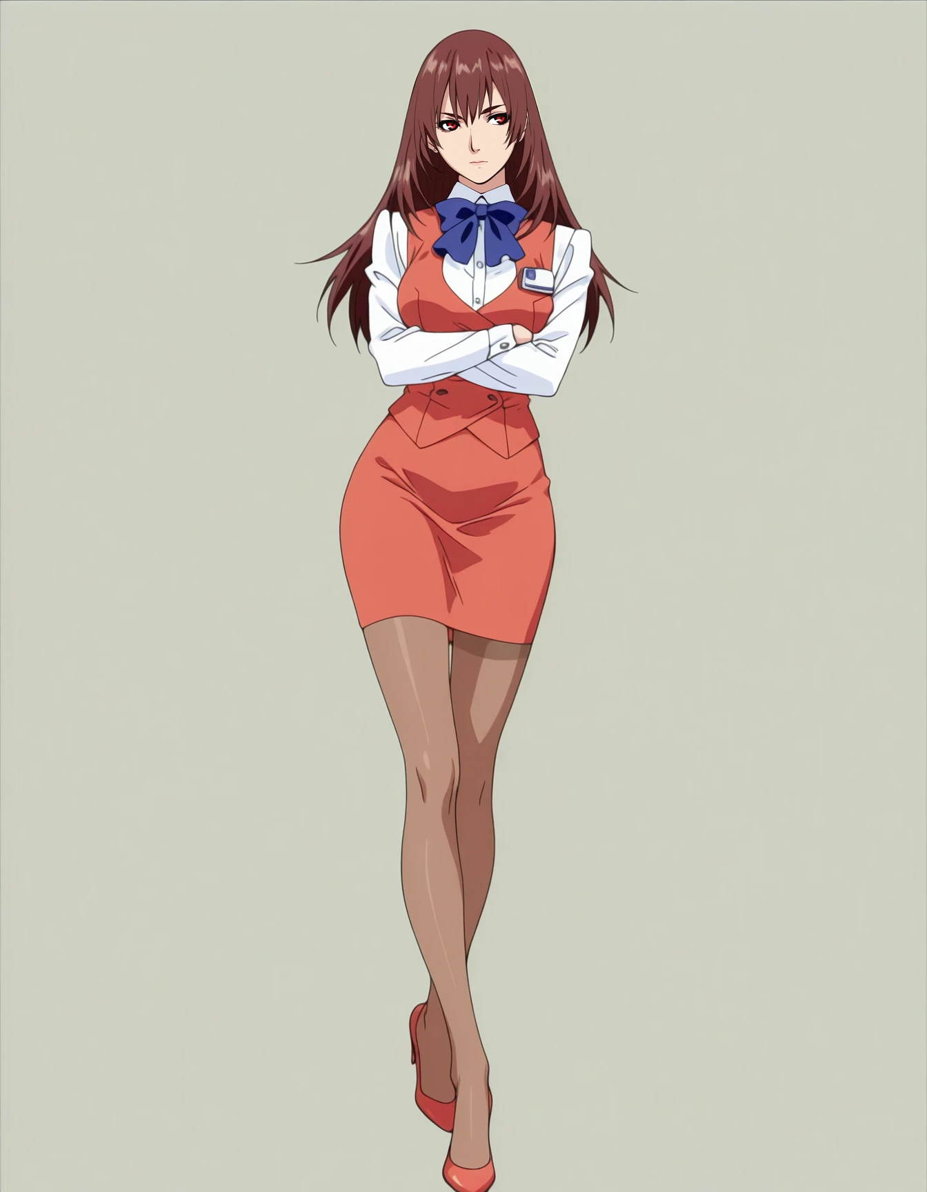 mai_lingeries,mai_rena_asaoka,long_hair,brown_hair,red_eyes,lips,vest,white_shirt,blue_bow,red_vest,short_pencil skirt,pantyhose,red_high_heels