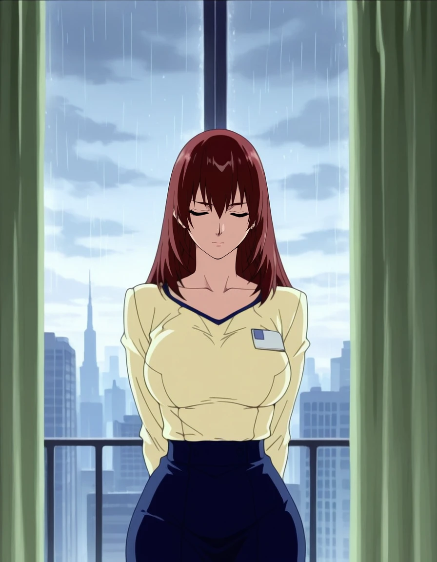 mai_lingeries,mai_chisa_sakurai,short_hair,purple_hair,purple_eyes,lipstick,red_lips,glasses,yellow_hairband,orange_vest,shirt,long_sleeves,yellow_bow,pencil_skirt,black pantyhose,red_high_heelsMayumi Fujiyama 藤山 真優美