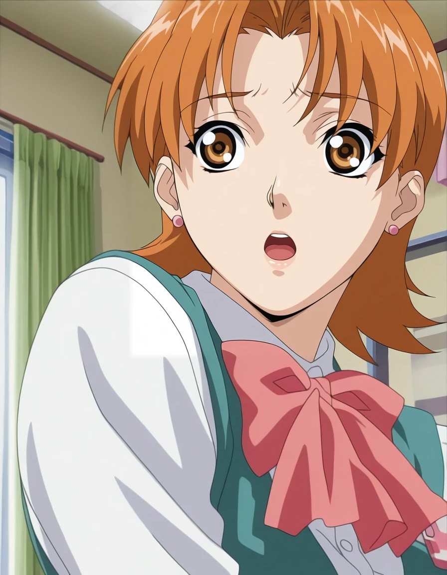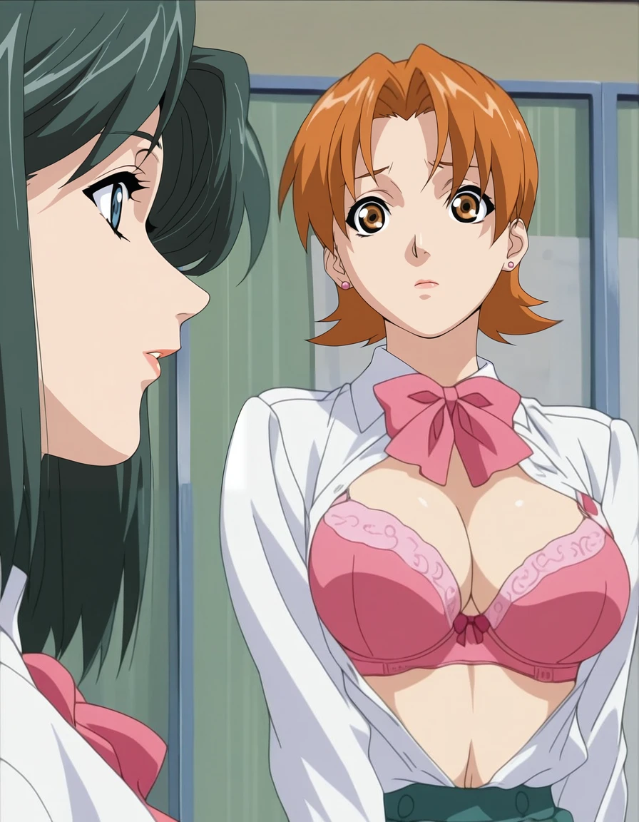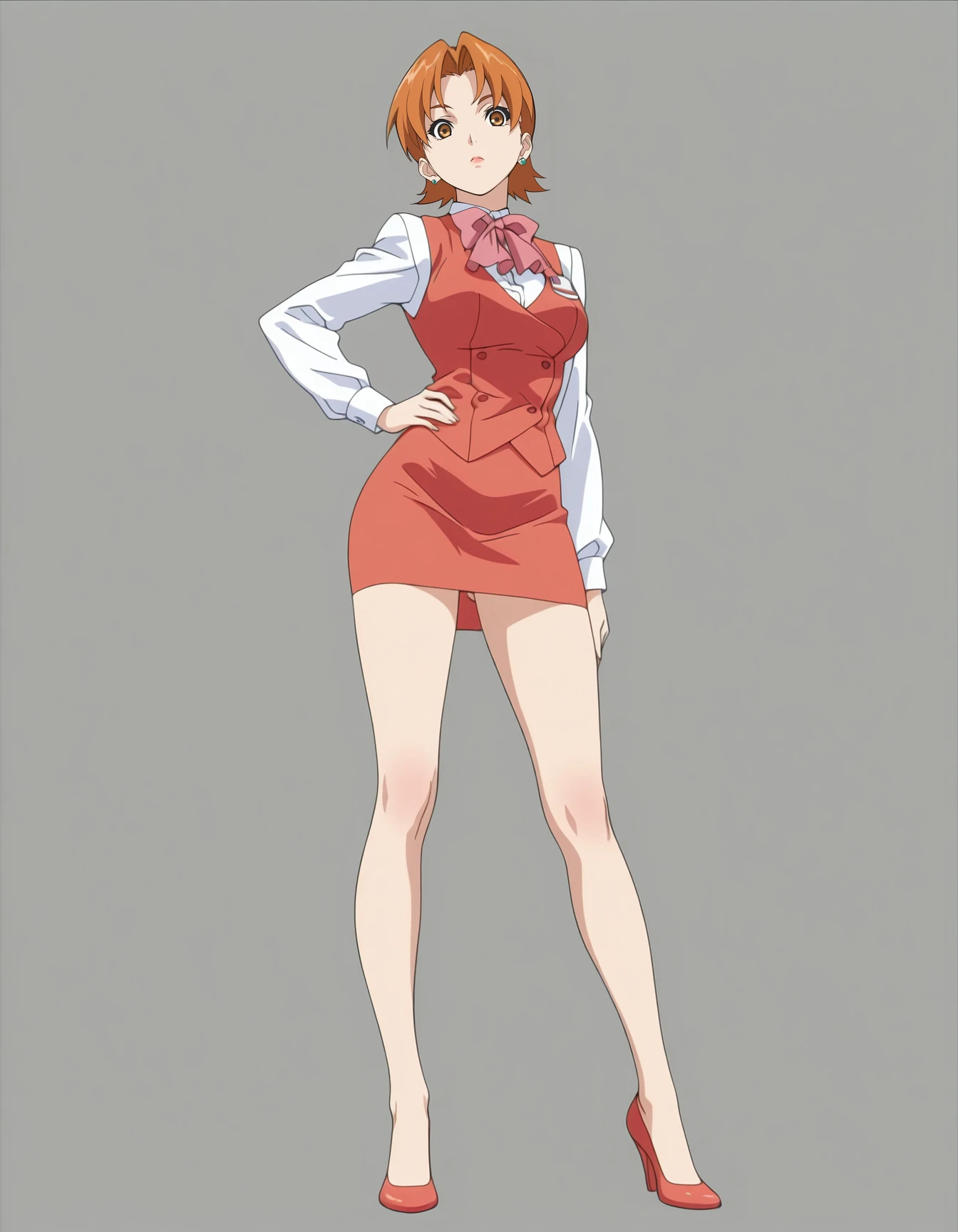mai_lingeries,mai_mayumi_fujiyama,short_hair,orange_hair,brown_eyes,earrings,lipstick,pink_bow,vest,pencil_skirt