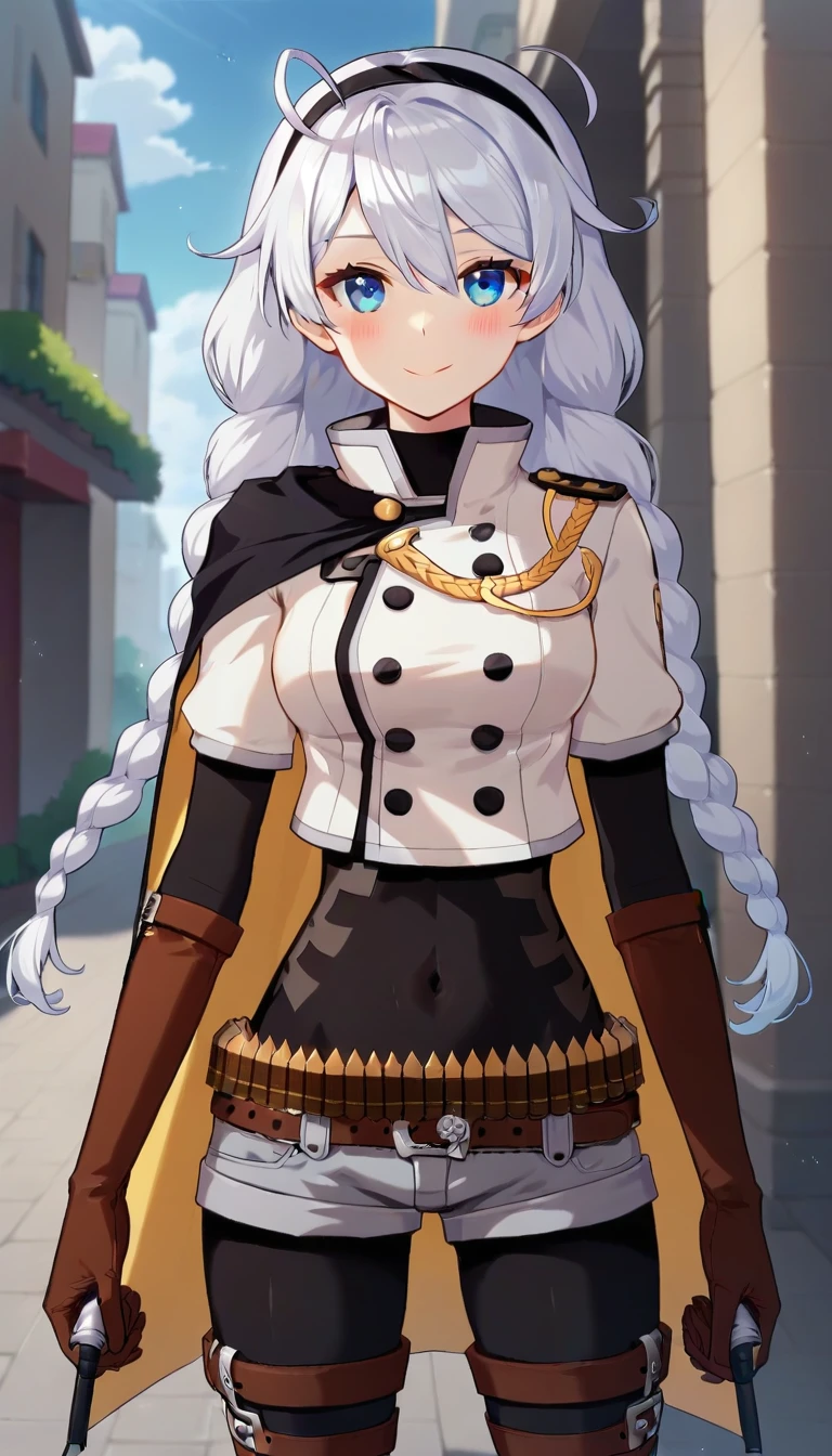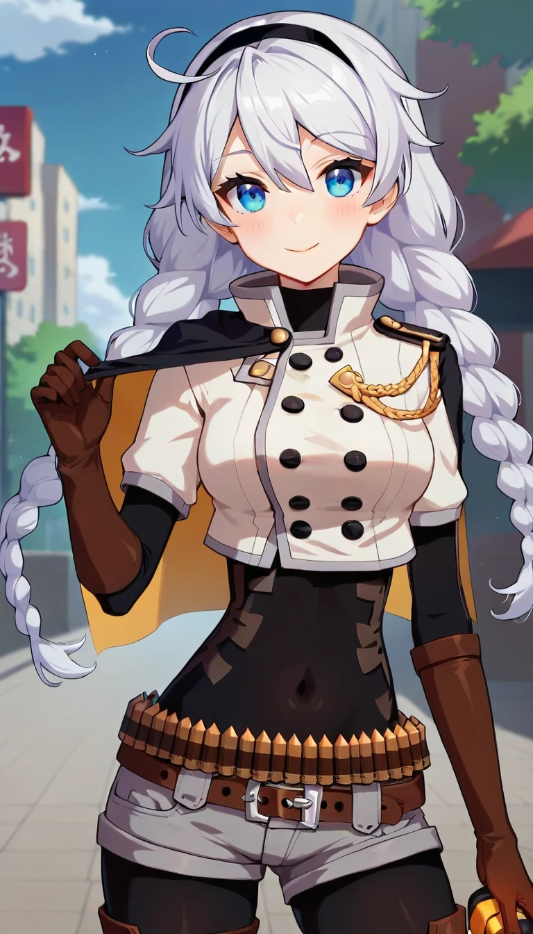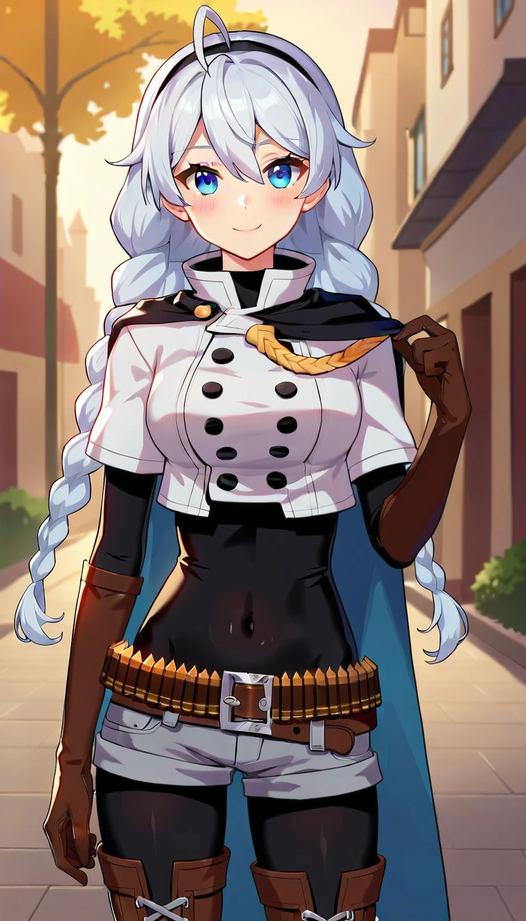 black cape,white jacket,cropped jacket,buttons,bandolier,black bodysuit,covered navel,short sleeves,elbow gloves,brown gloves,medium breasts,belt buckle,ammunition belt,grey shorts,short shorts,black pantyhose,thigh boots,brown footwear