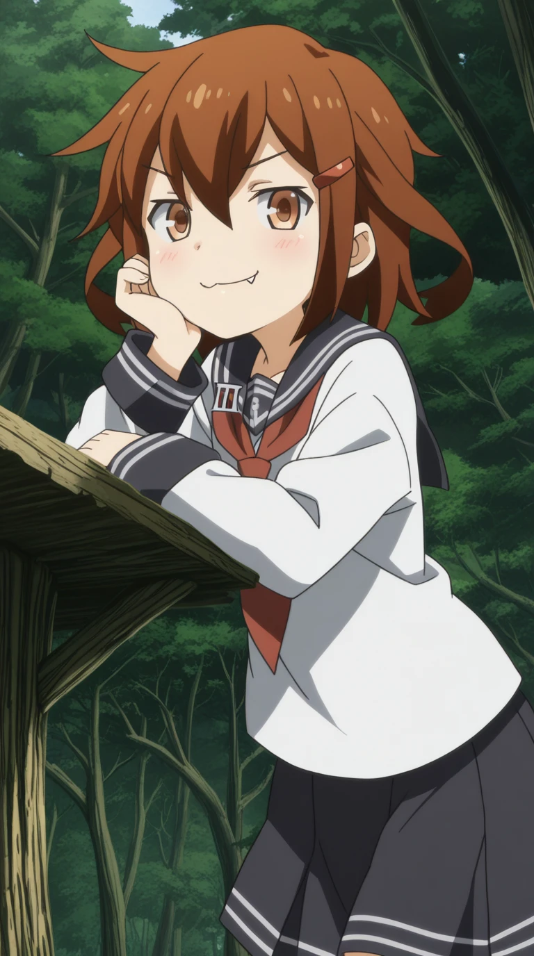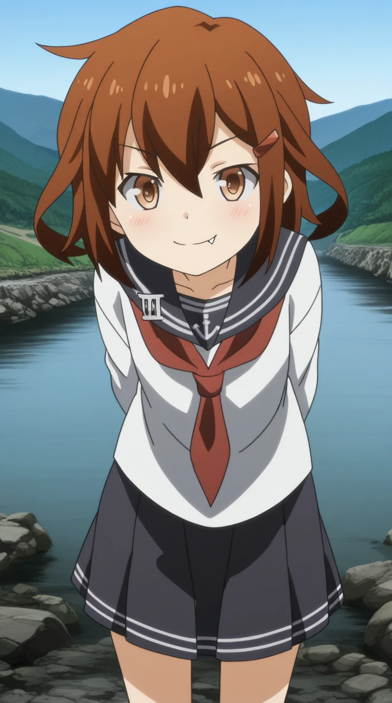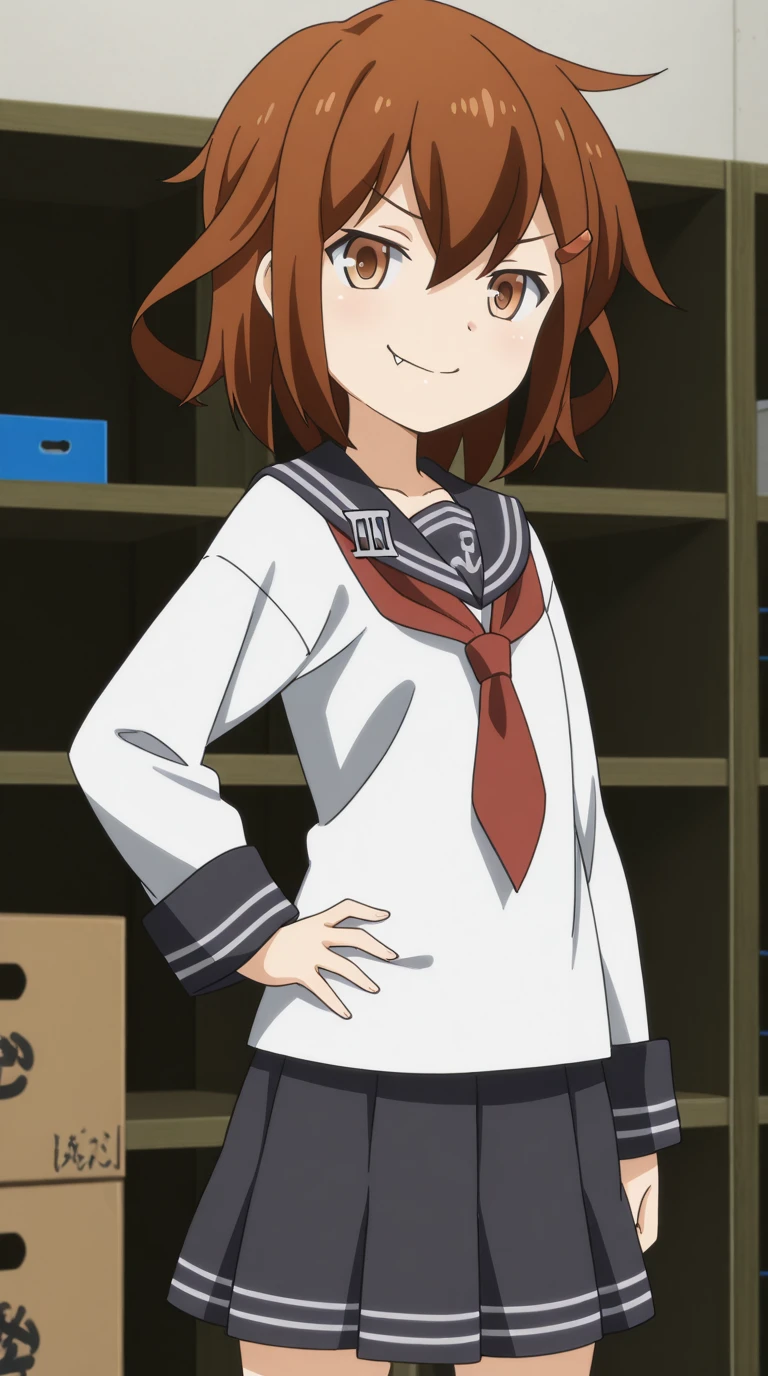 ikazuchi, ikazuchi (kancolle), short hair, brown hair, hair ornament, brown eyes, hairclip, fang, anime screencap
