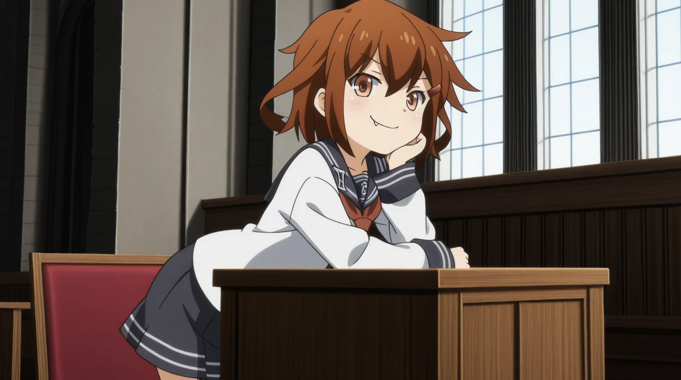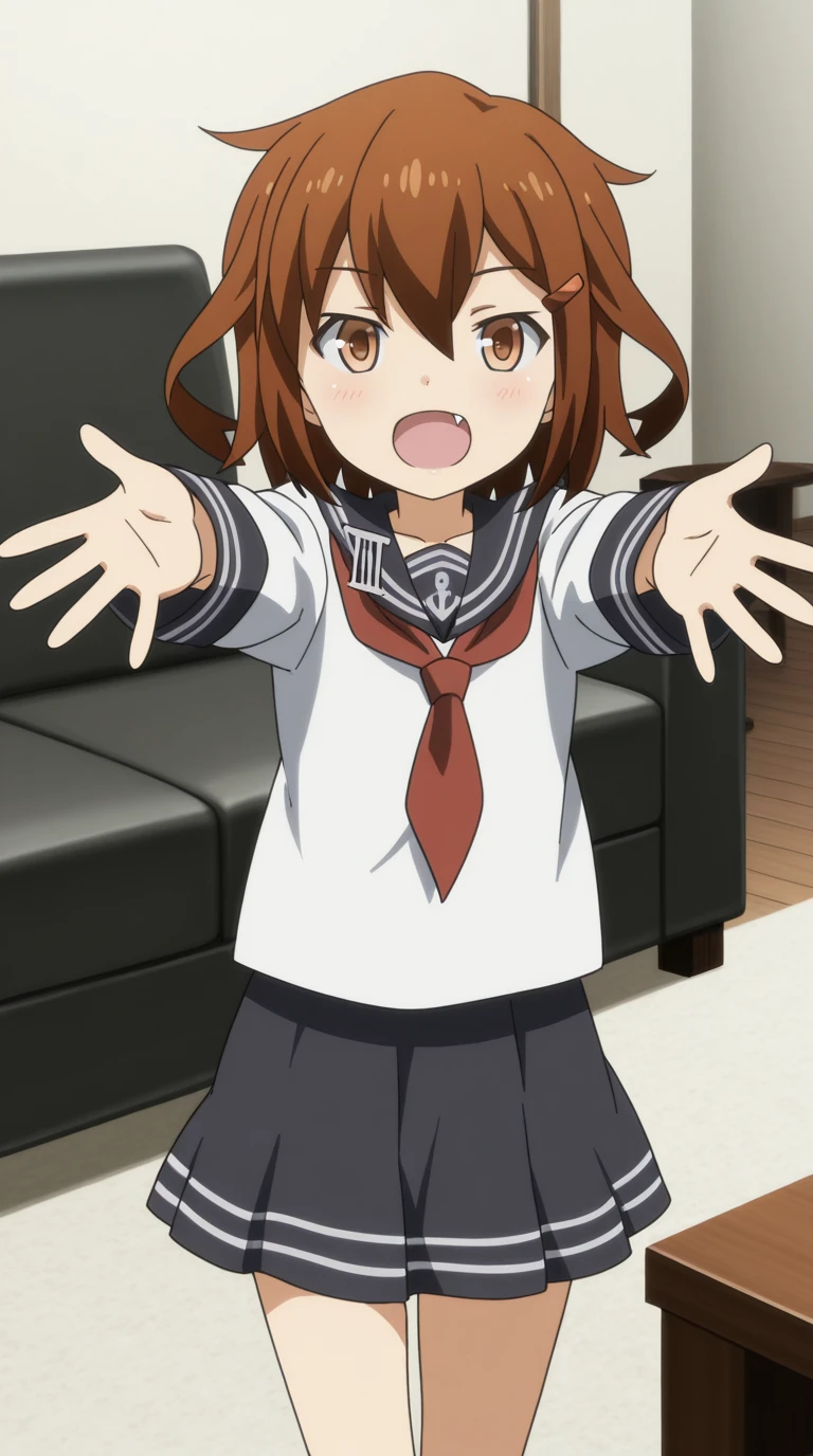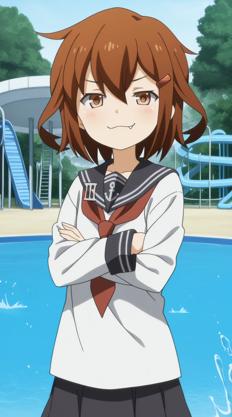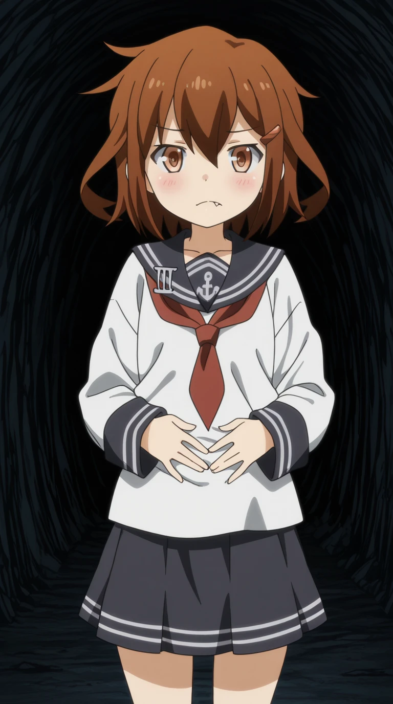 ikazuchi, ikazuchi (kancolle), short hair, brown hair, hair ornament, brown eyes, hairclip, fang, anime screencap