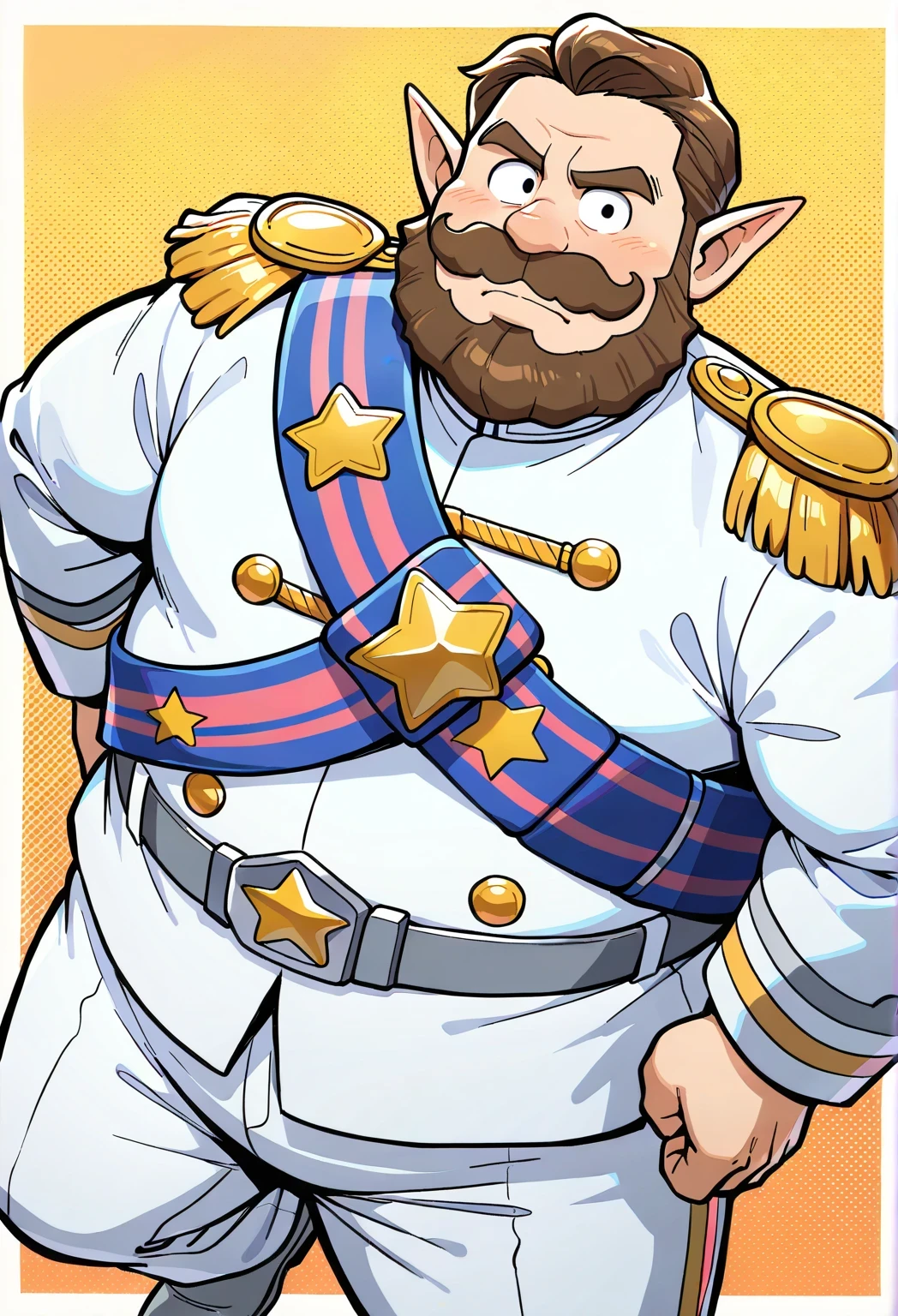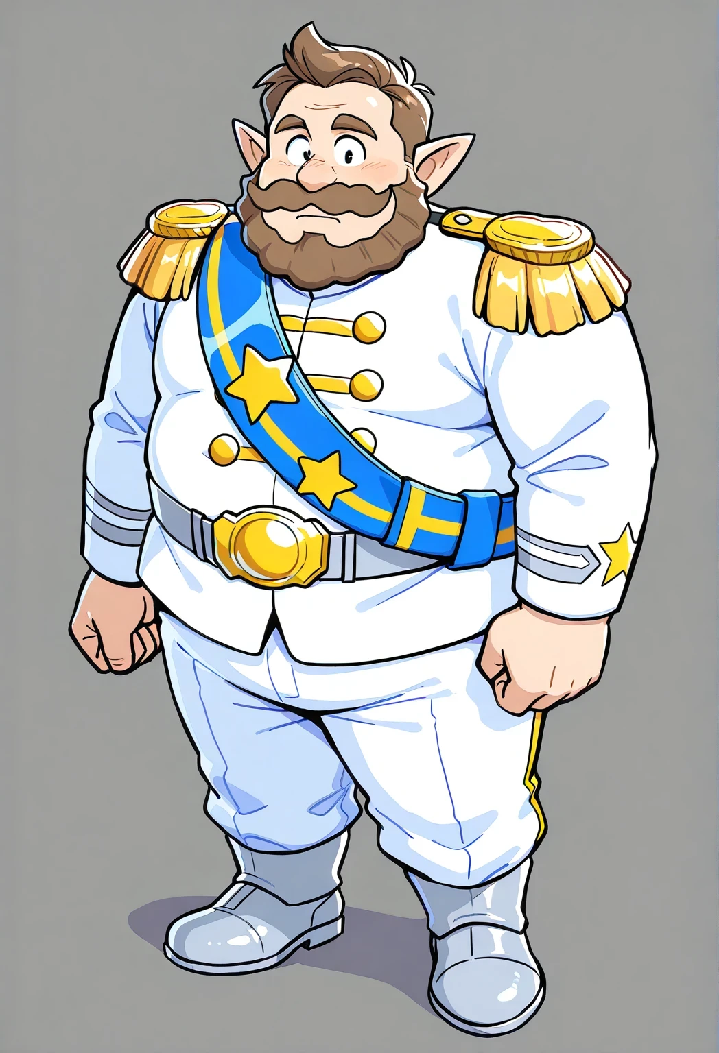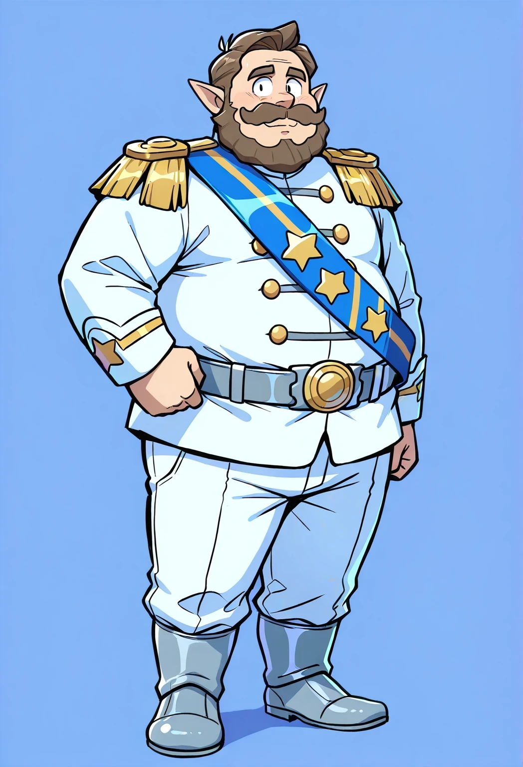PresidentOVA, 1boy, military-style white uniform, gold shoulder epaulette, vibrant blue sash featuring yellow stars, large bushy brown mustache, brown beard, pointed ears, gray belt, white pants, gray shoes, black eyes, fat, chubby,