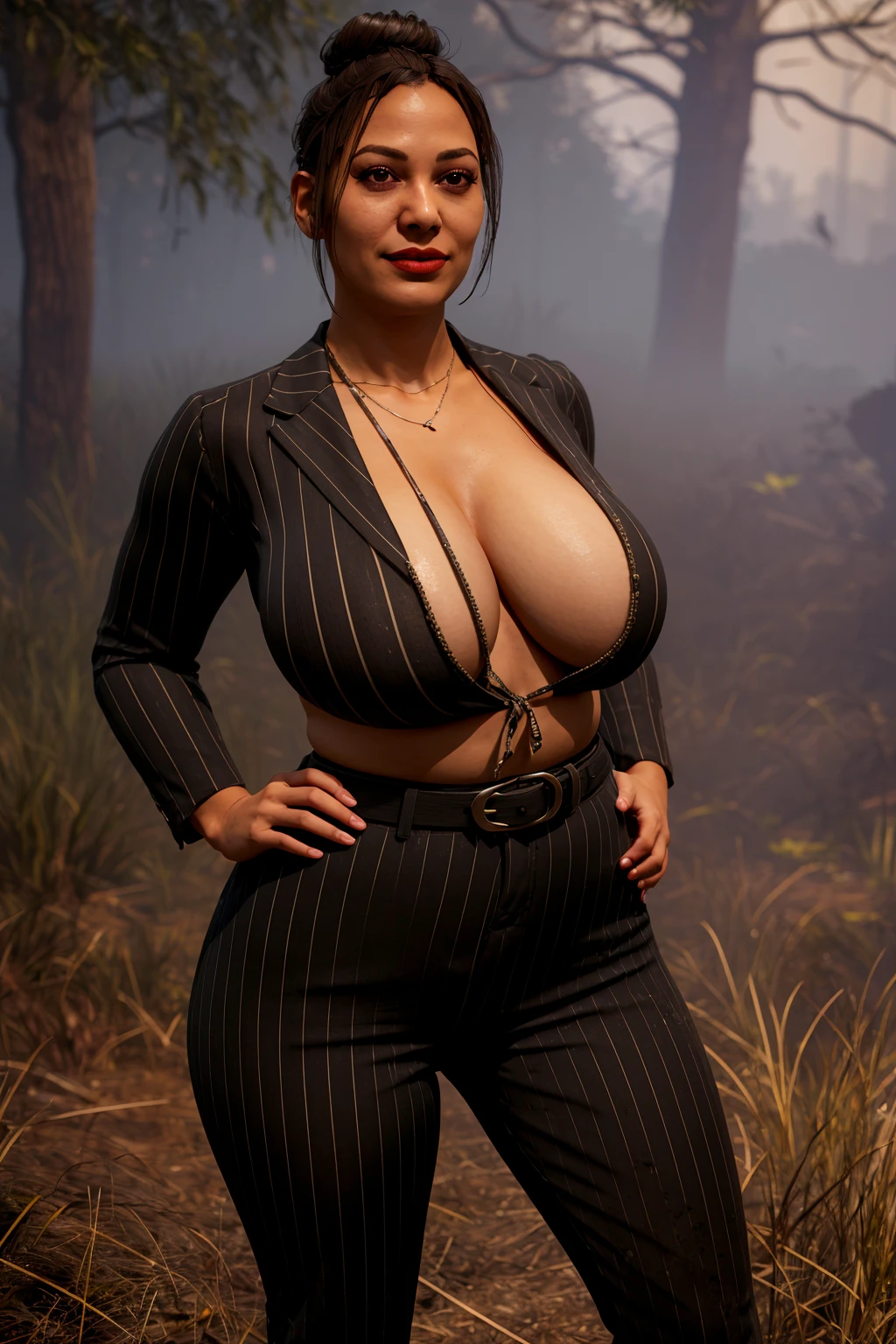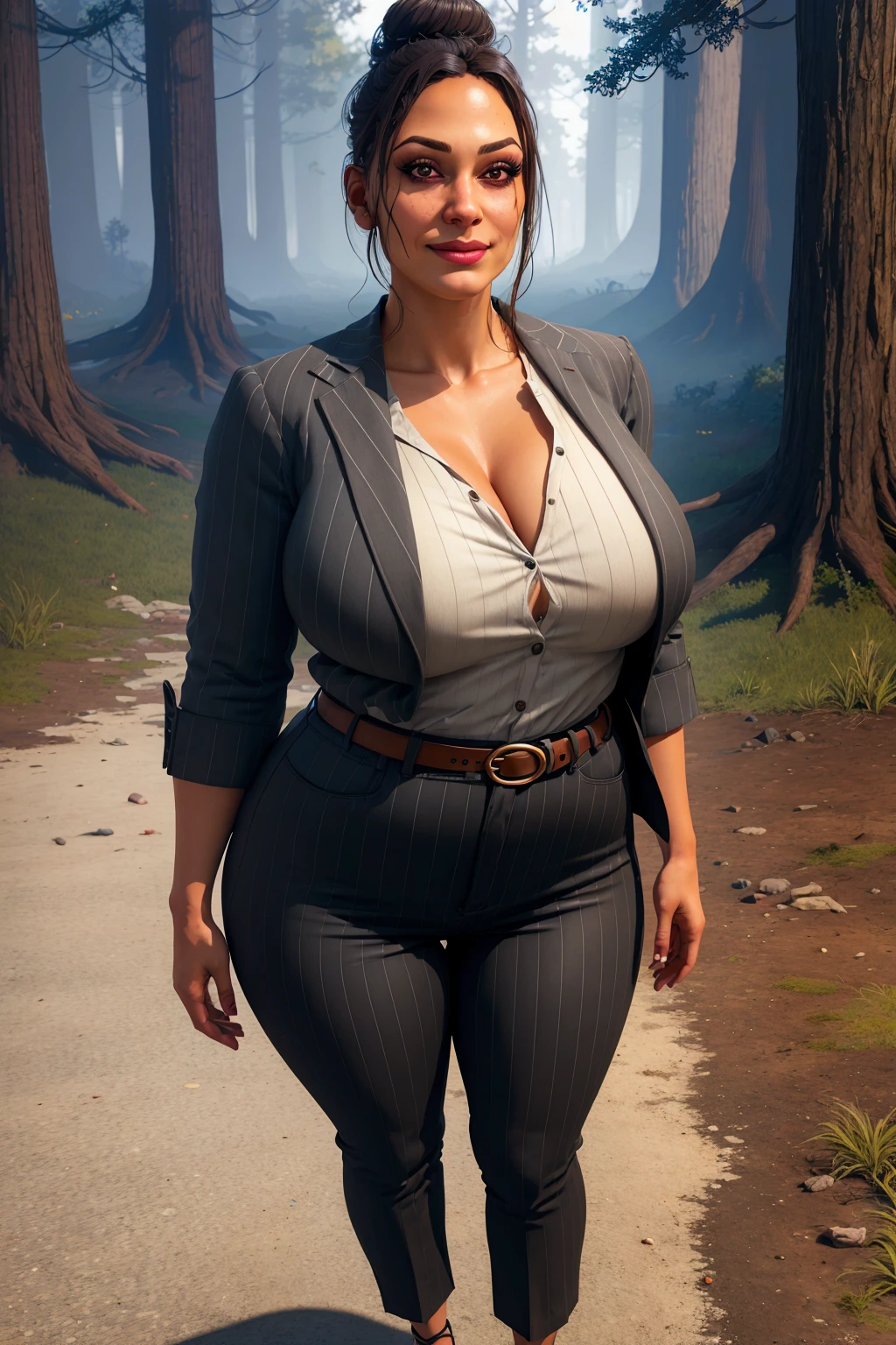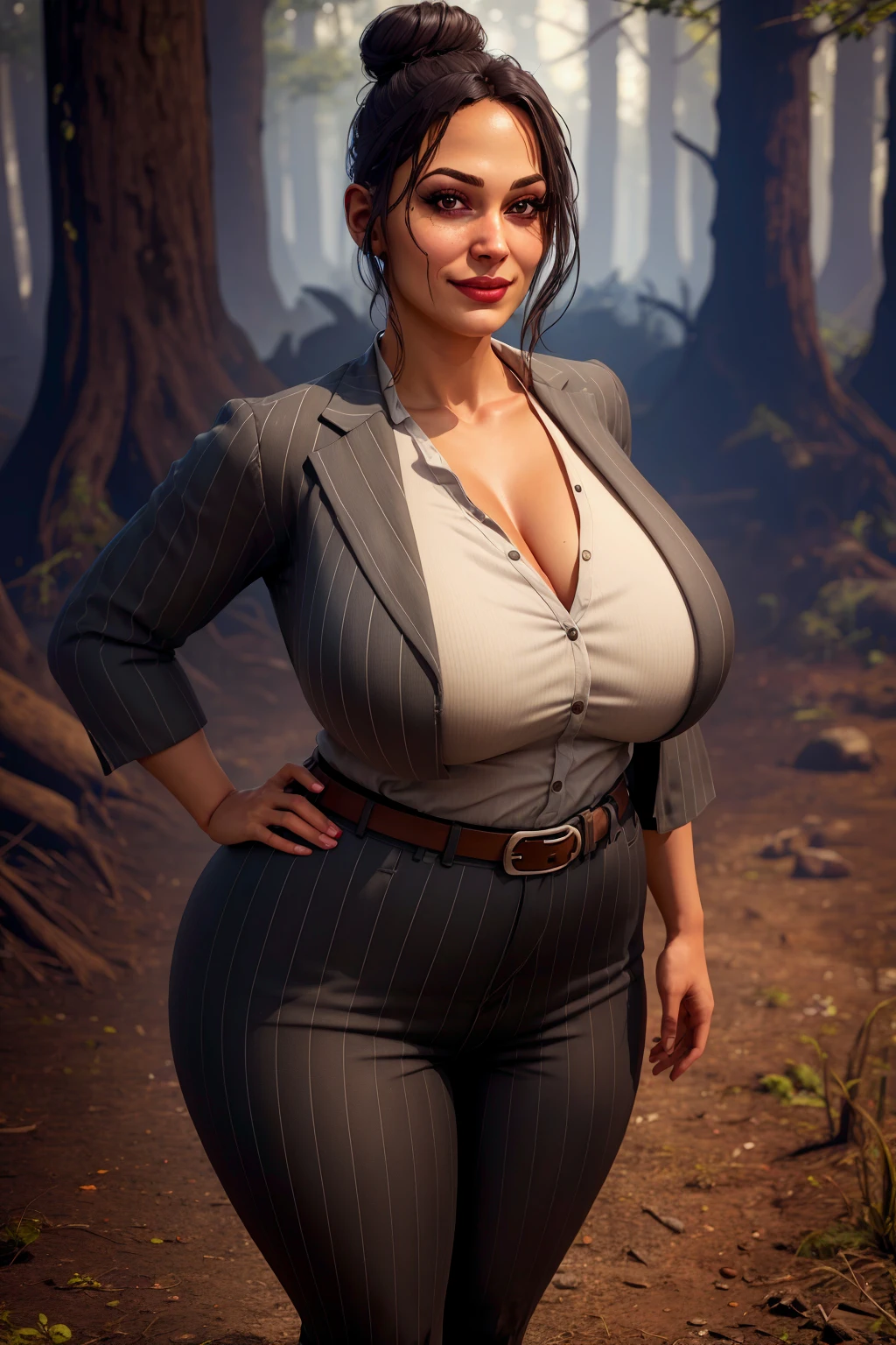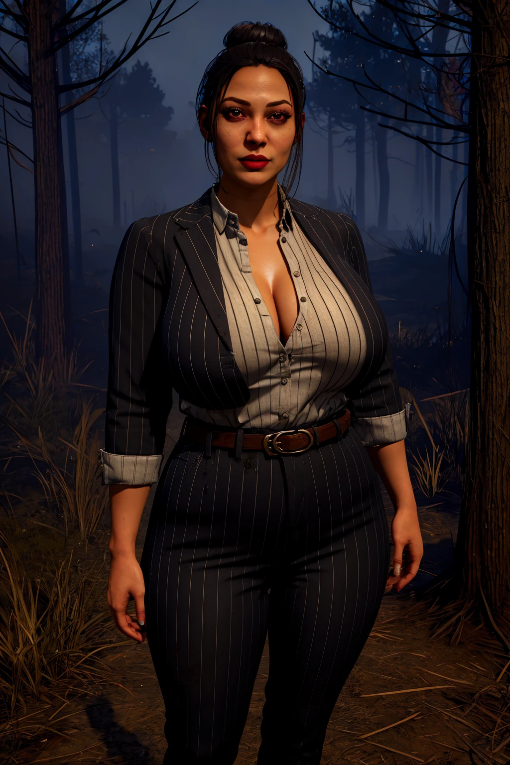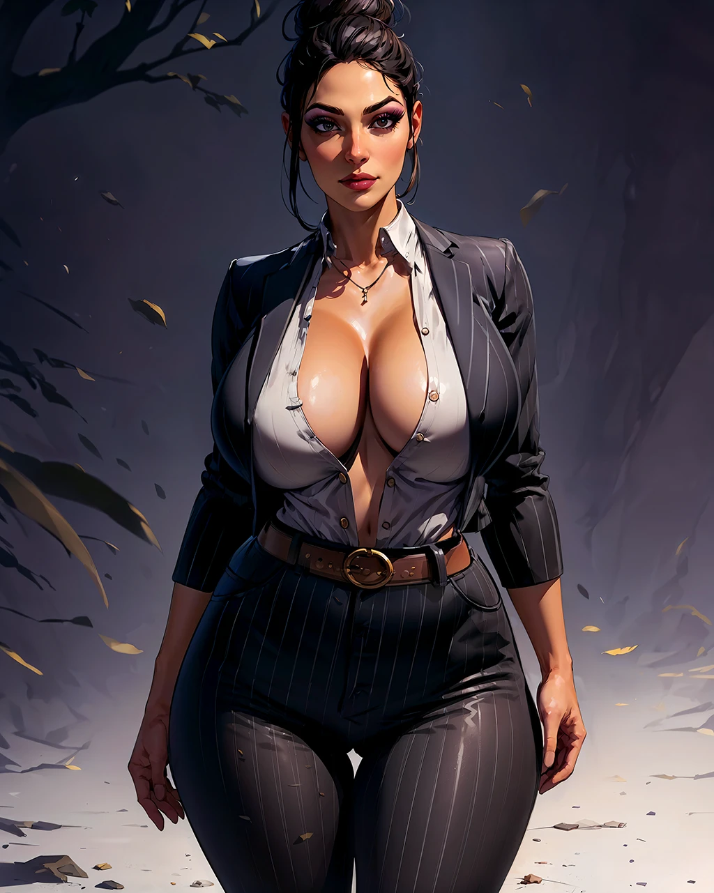 pinstripe jacket, pinstripe pants, shirt, high-waist pants, belt, black hair, single hair bun, dirty clothes, blood stained clothes, eyeshadow
