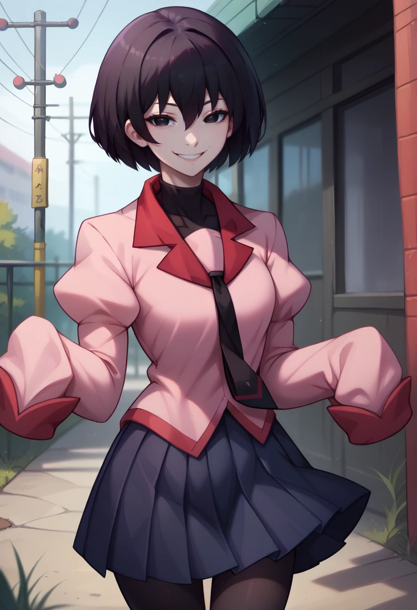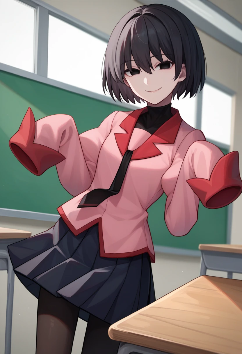 Default Outfit: oshinodef, pale skin, bob cut, empty eyes, naoetsu high school uniform, pink shirt, turtleneck, black necktie, long sleeves, sleeves past fingers, puffy sleeves, black undershirt, black skirt, pleated skirt, black pantyhose