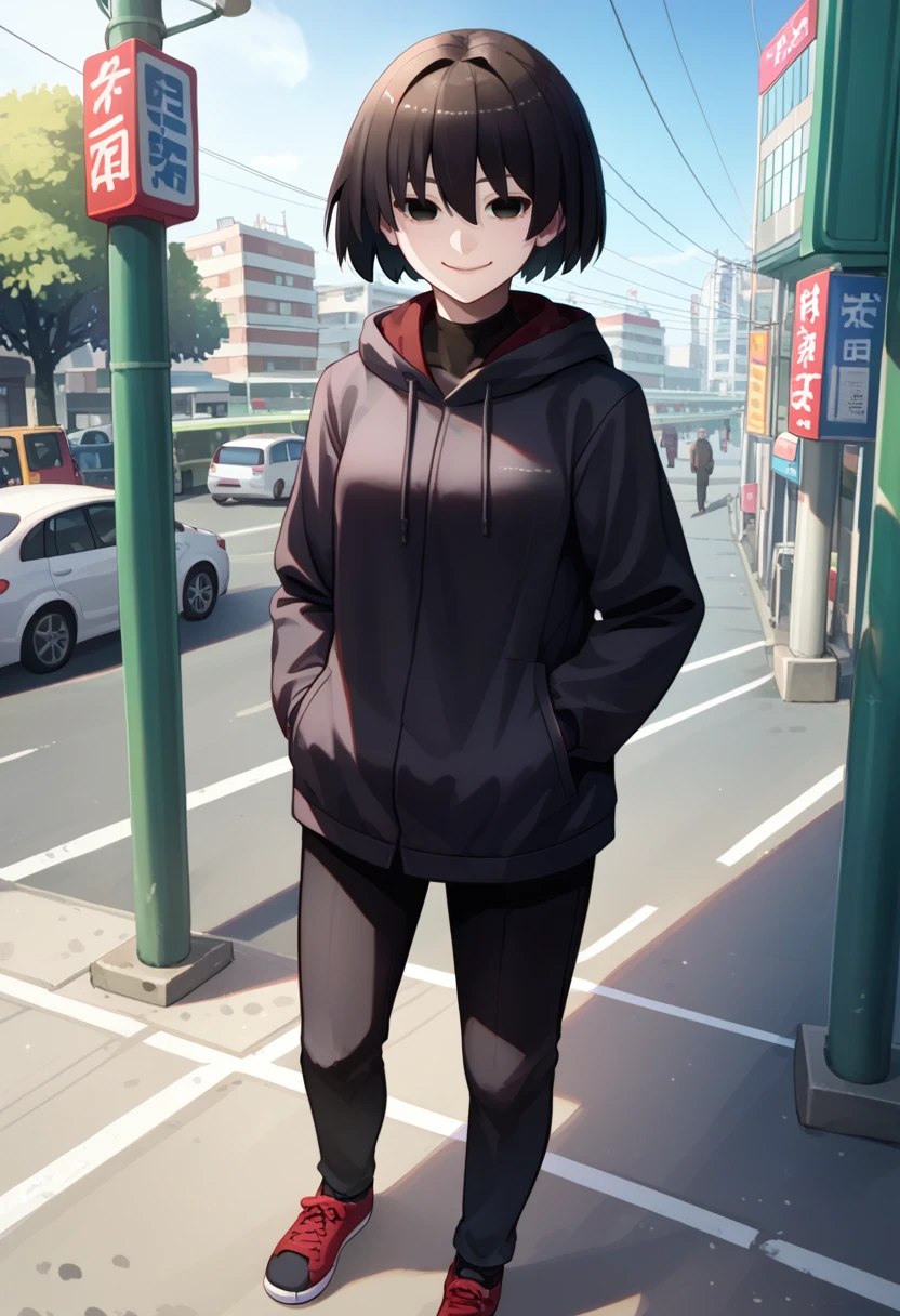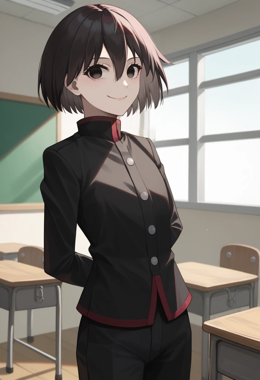 Gakuran: oshinogakuran, pale skin, bob cut, empty eyes, naoetsu high school uniform, gakuran, black jacket, long sleeves, black gloves, black pants