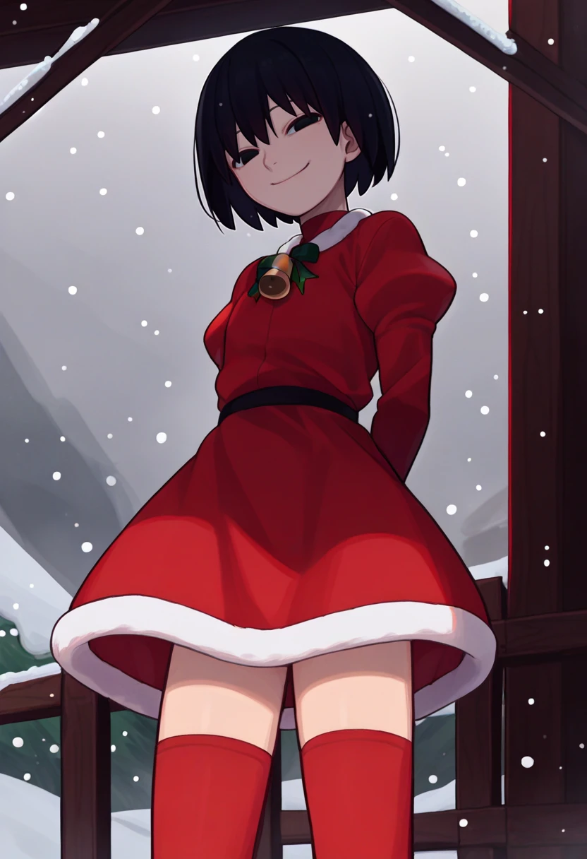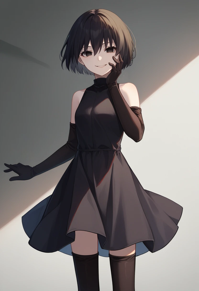 Dress: oshinodress, pale skin, bob cut, empty eyes, black dress, sleeveless dress, turtleneck dress, black gloves, elbow gloves, two-sided skirt, black thighhighs, bare shoulders