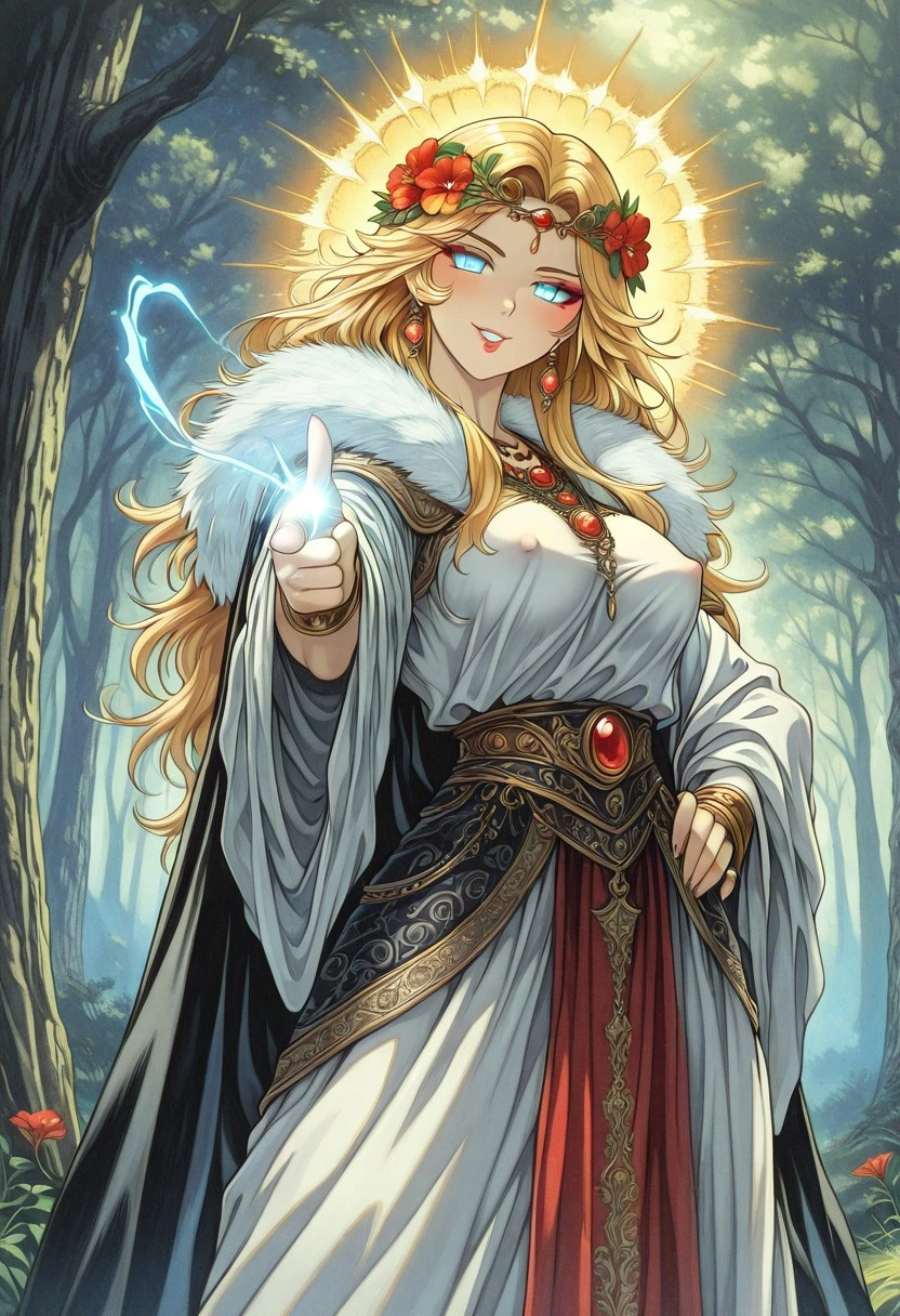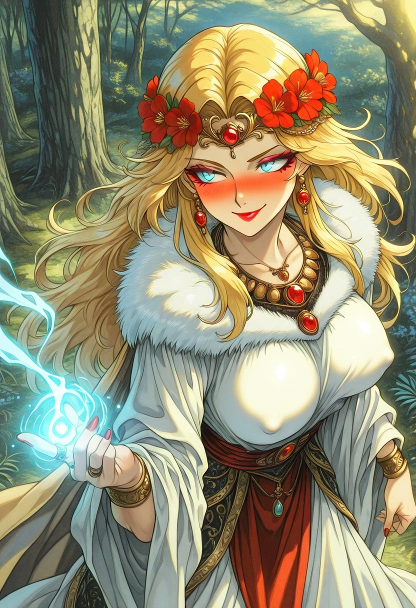 FantasySlavicMS, 1girl, solo, curvy body, pale skin, very long hair, blonde hair, hair ornament, hair flower, headdress, single braid, messy hair, earrings, blue eyes, full lips, makeup, large breast, necklace, long dress, wide sleeves, dress ornament, bracelet, thick thighs, jewelry, rings, armor, beads, fur trim, gem, cape, magic,