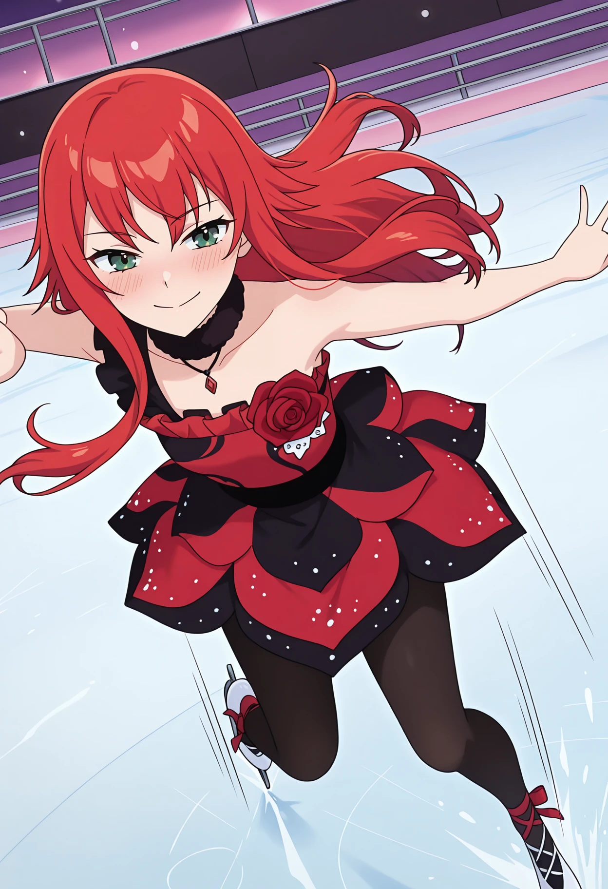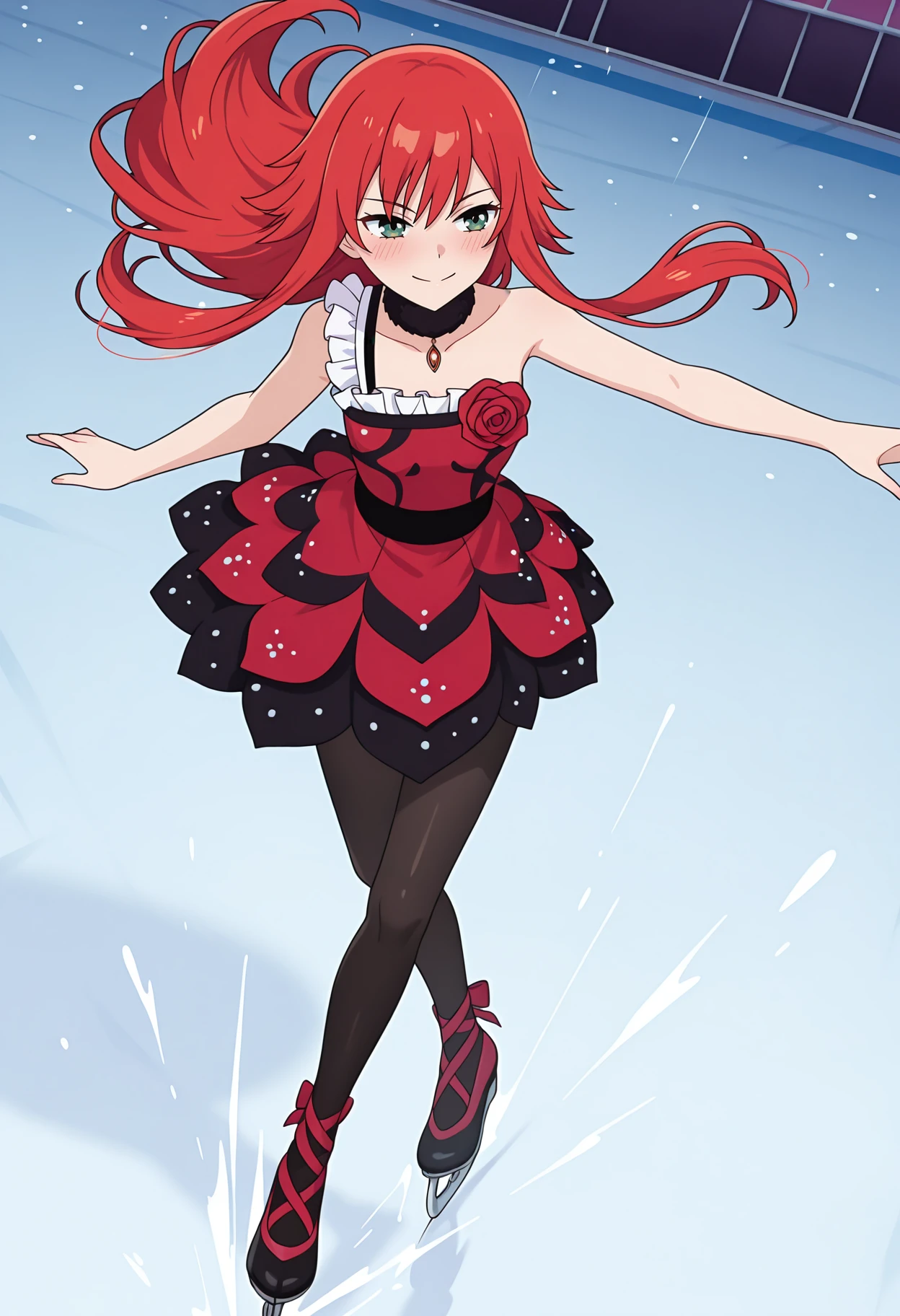 pbersdbs, two-tone dress, fur-trimmed choker, fur-trimmed choker, black choker, necklace, black dress, red dress, red rose, single strap, frilled straps, bare shoulders, black pantyhose,