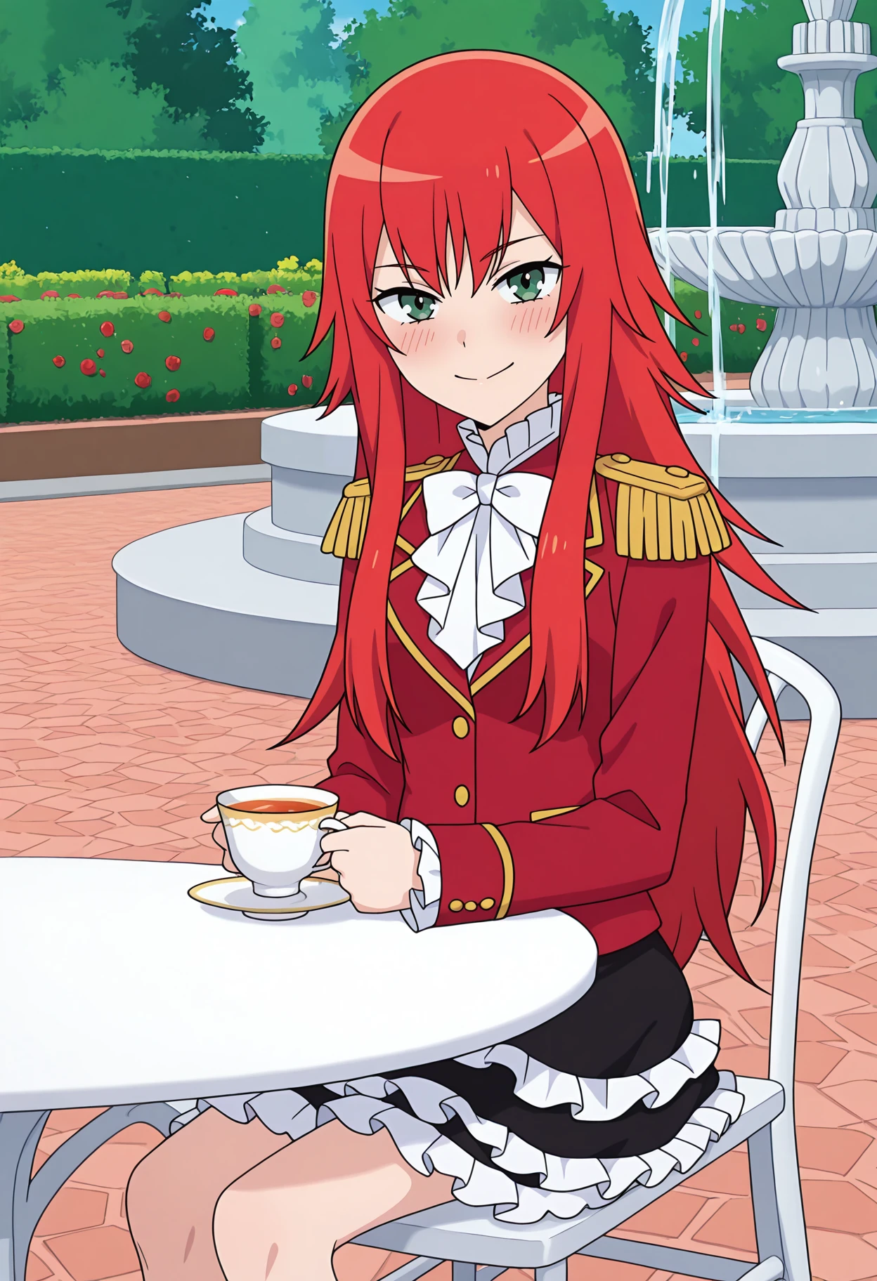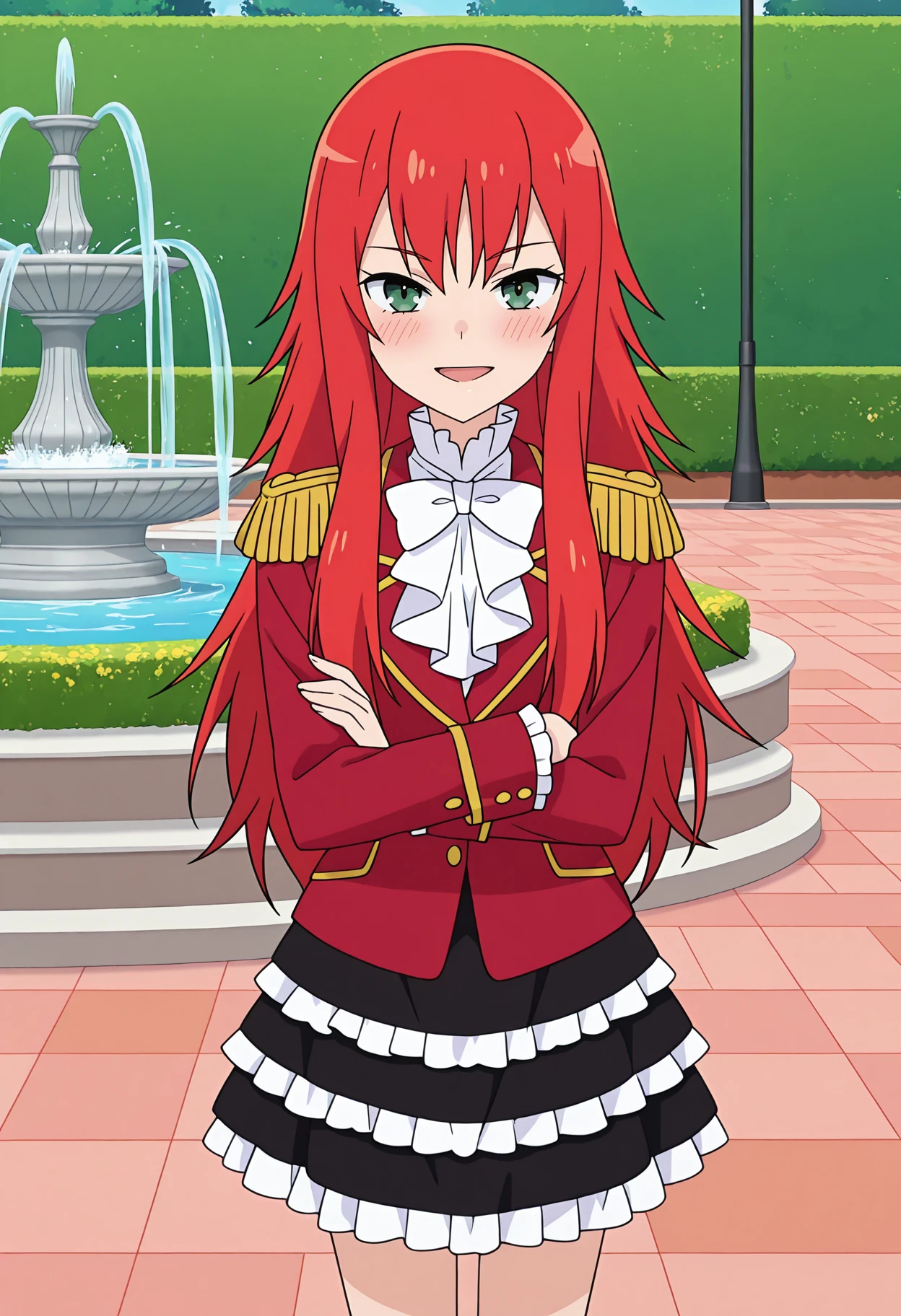 pberedel, epaulettes, aiguilette, red jacket, white ascot, frills, long sleeves, black skirt, layered skirt, frilled skirt,
