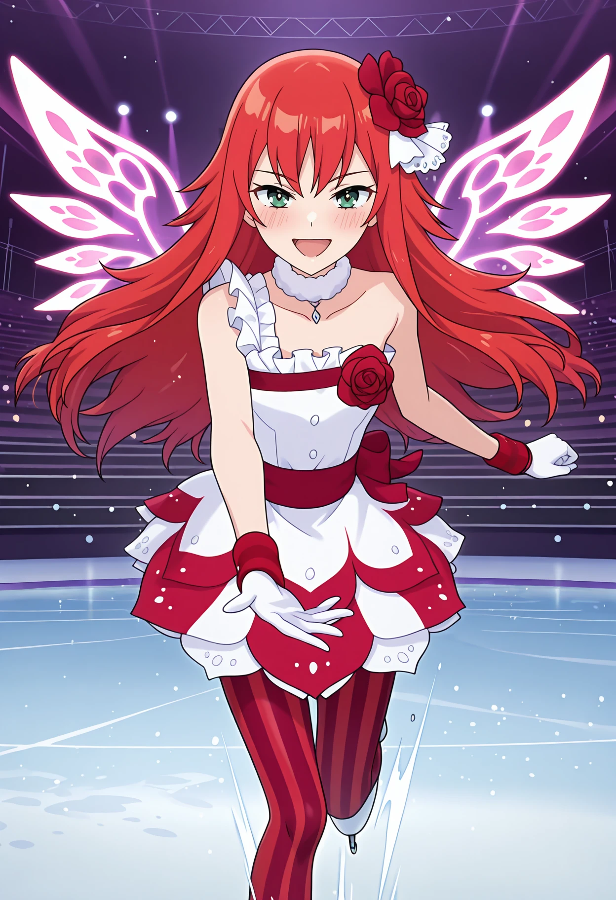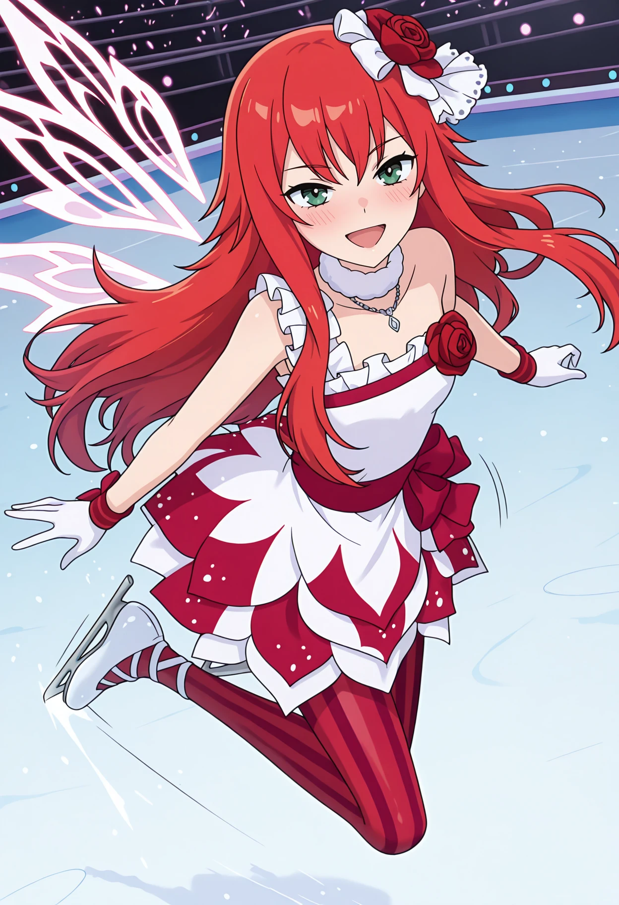 pbersdpc, red rose, hair flower, two-tone dress, fur-trimmed choker, white choker, necklace, white dress, red dress, red rose, single strap, frilled straps, bare shoulders, white gloves, red wristband, red pantyhose, striped pantyhose, vertical-striped pantyhose, holographic wings,