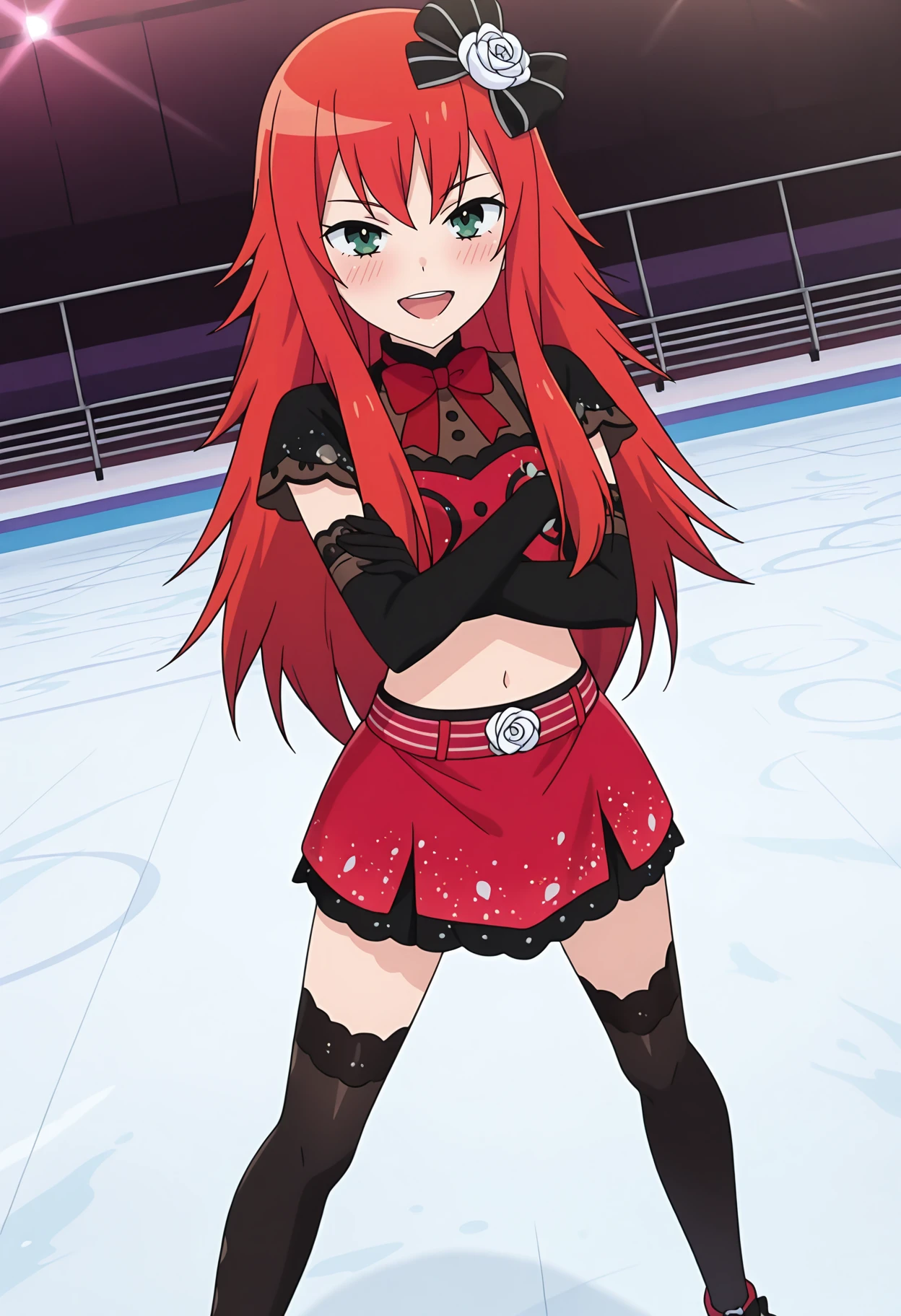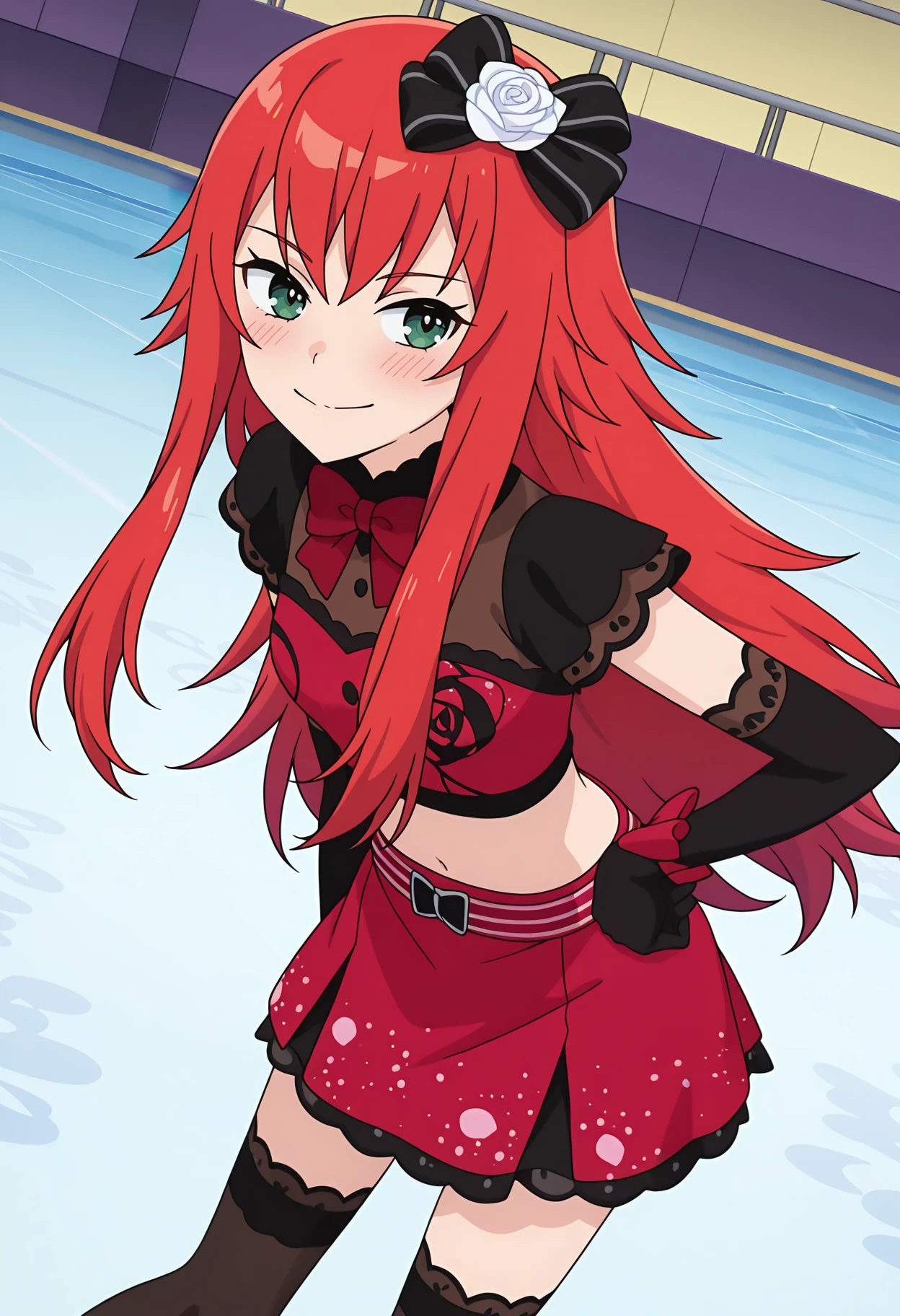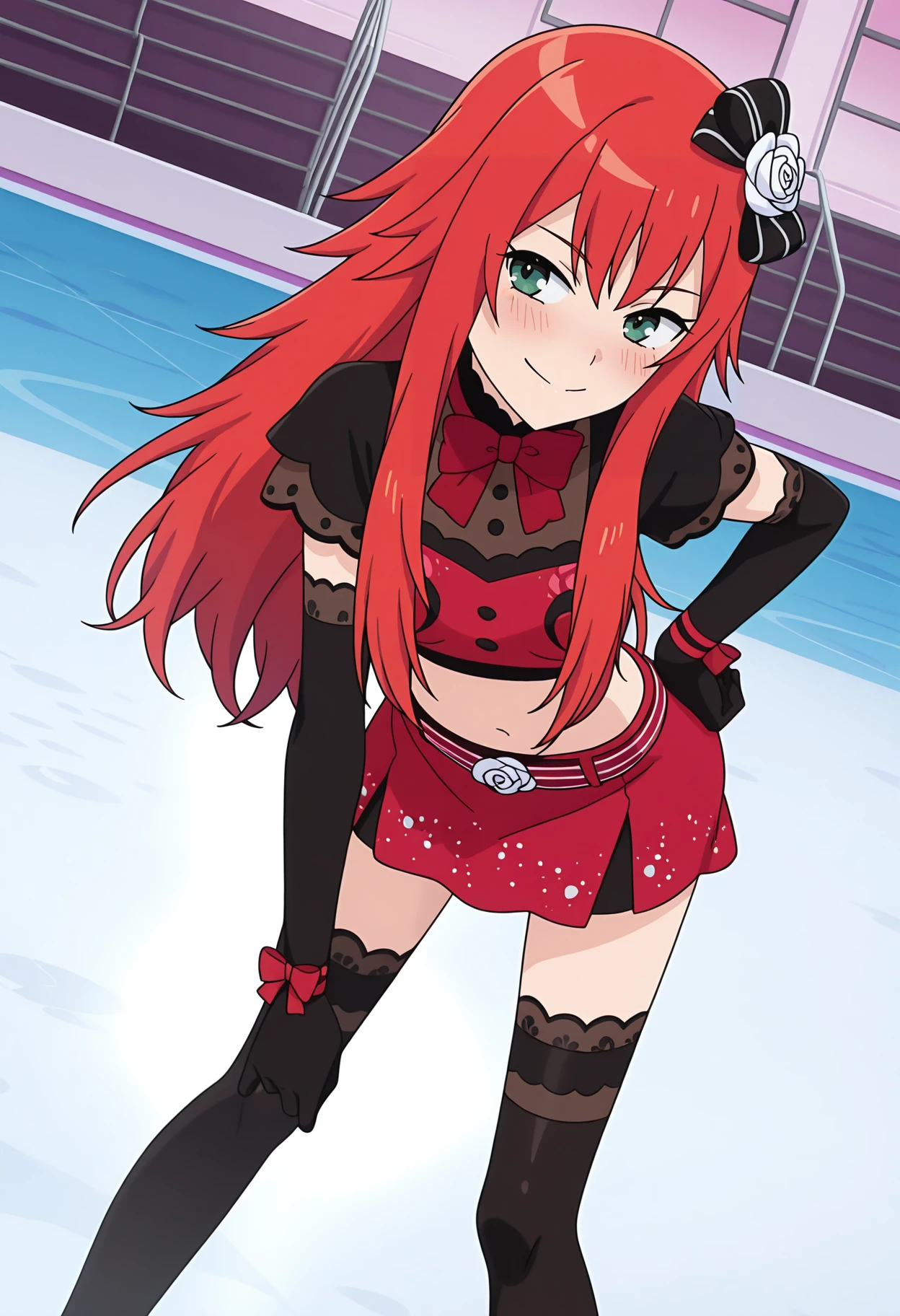 pberwnrd, hair ornament, black bow, hair bow, white rose, red crop top, print shirt, midriff, red bowtie, red skirt, striped belt, miniskirt, black sleeves, elbow gloves, black gloves, black thighhighs,