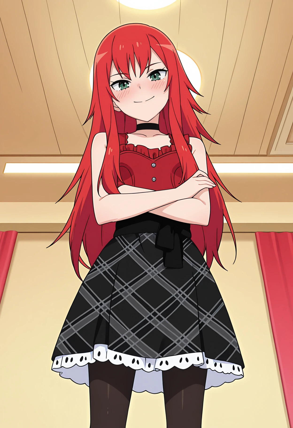 pberrord, black choker, sleeveless shirt, red shirt, bare shoulders, buttons, black skirt, plaid skirt, frills, black pantyhose,