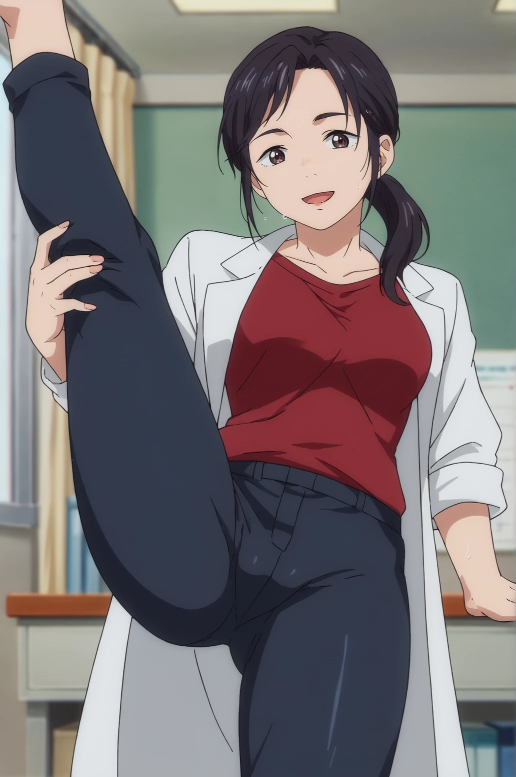 lab coat, red shirt, black pants