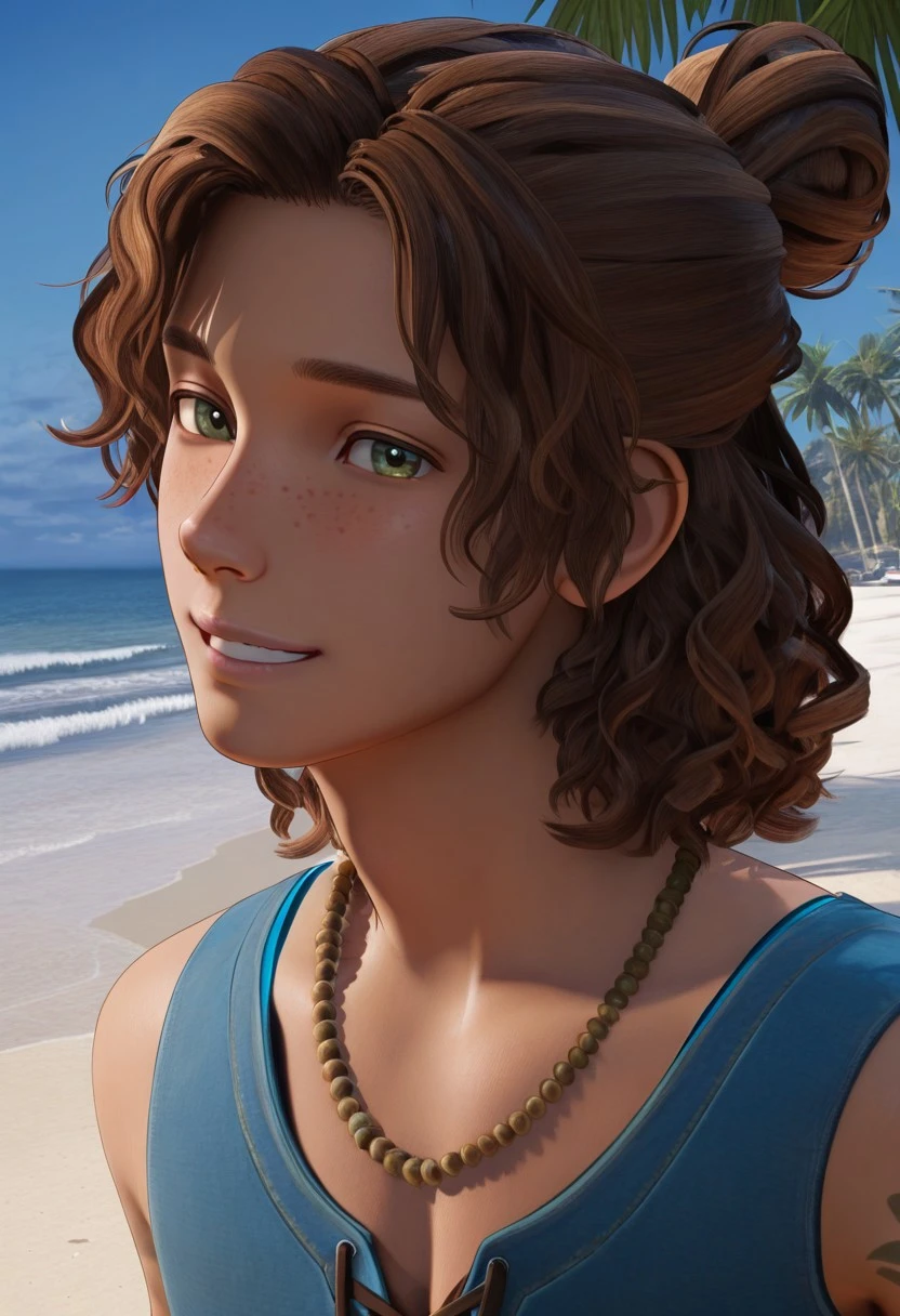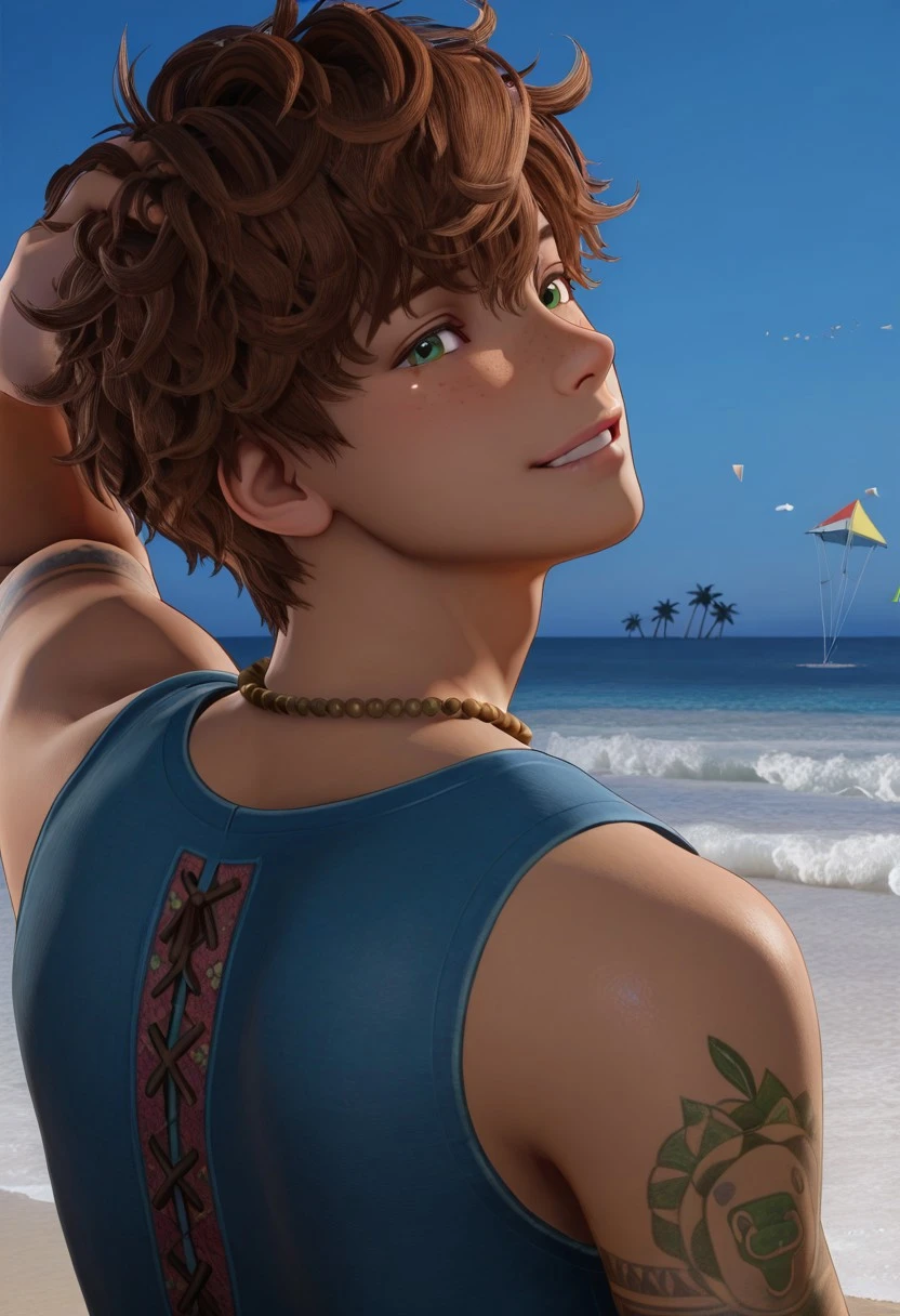 renato_lyra, olive green eyes, freckles, medium skin tone, colorful granny square crochet pants in yellow purple green red pattern, blue tank top with lace-up front, beaded necklaces, arm tattoos, sandals,