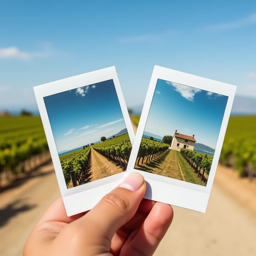 1. The image shows a person holding up a polaroid photo of a /text image/. The person's hand is visible on the left side of the image. In the background /text image/