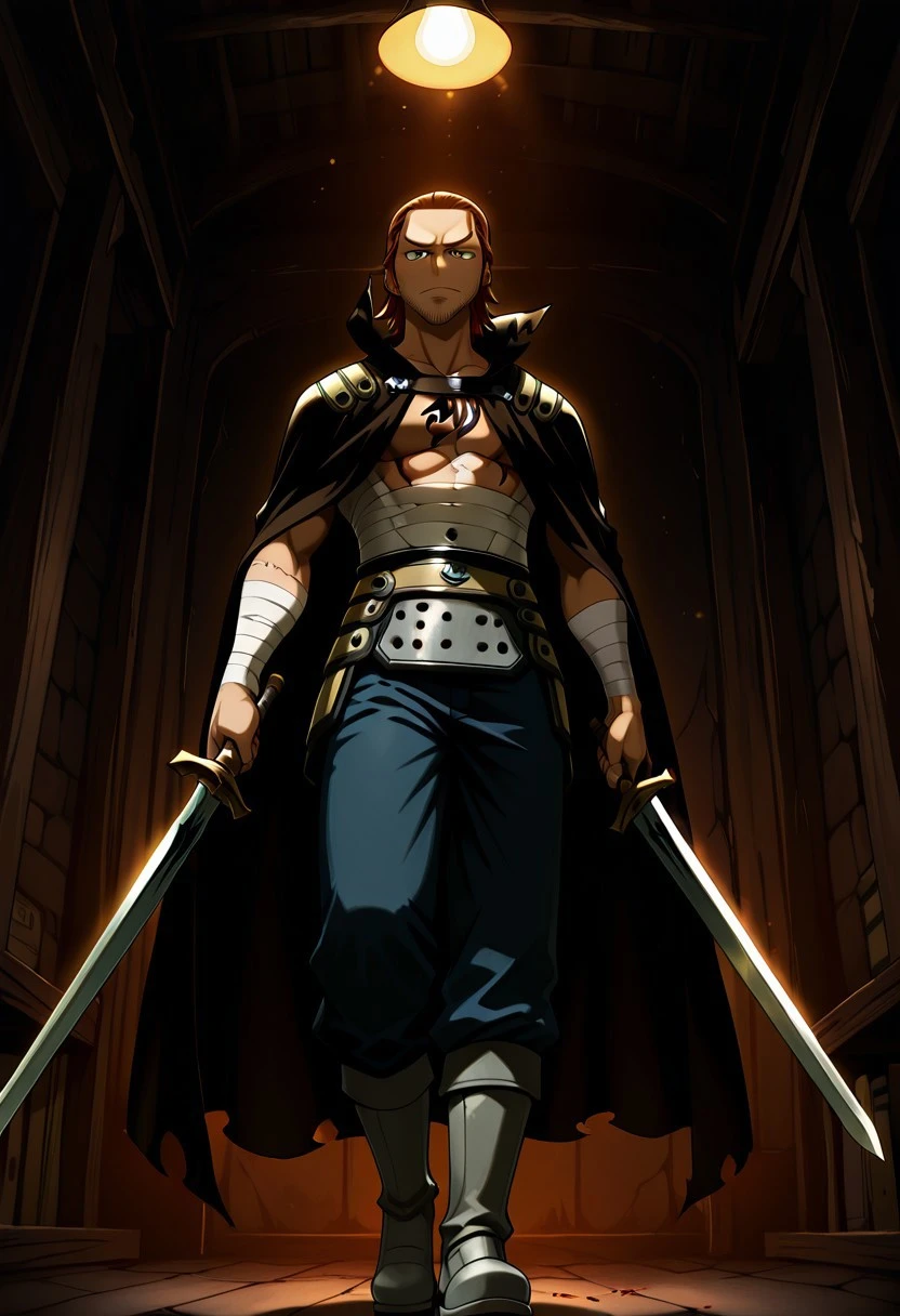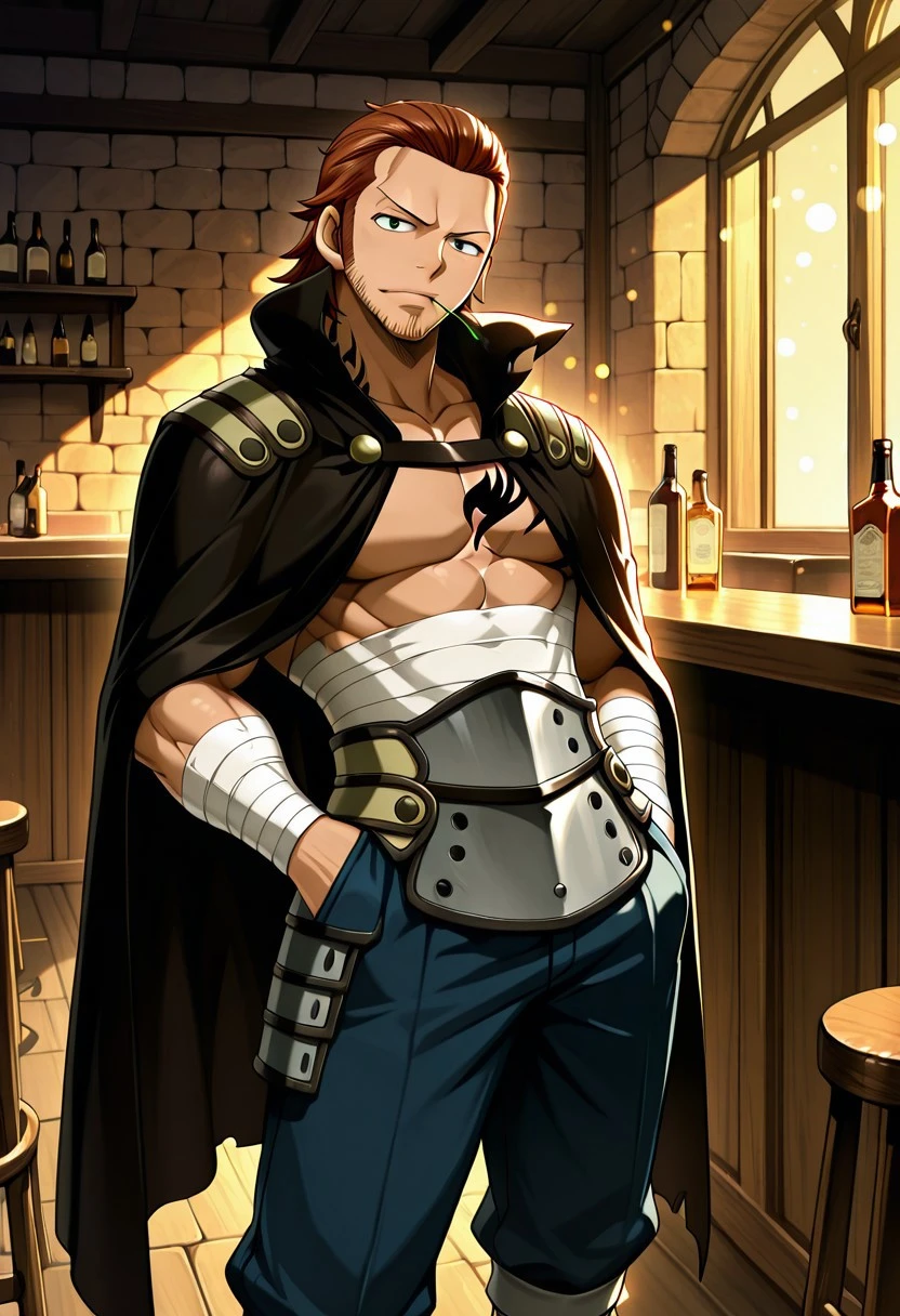 Character's basic outfit: bandaged chest, bondaged arm, chest tattoo, scar on chest, pectorals, blue pants, gray boots, mechanical arm, open clothes, black cape, armored belt, waist armor