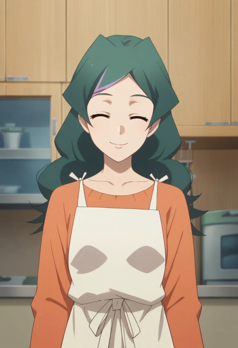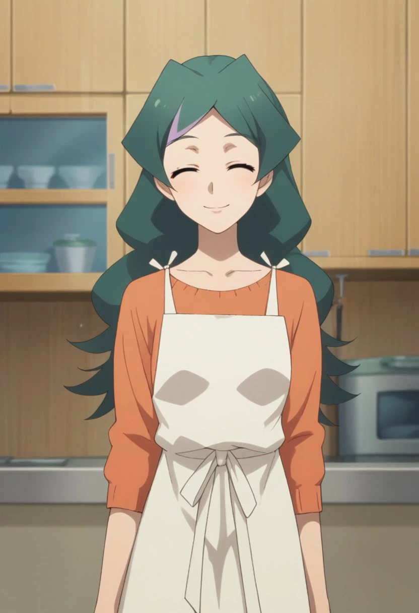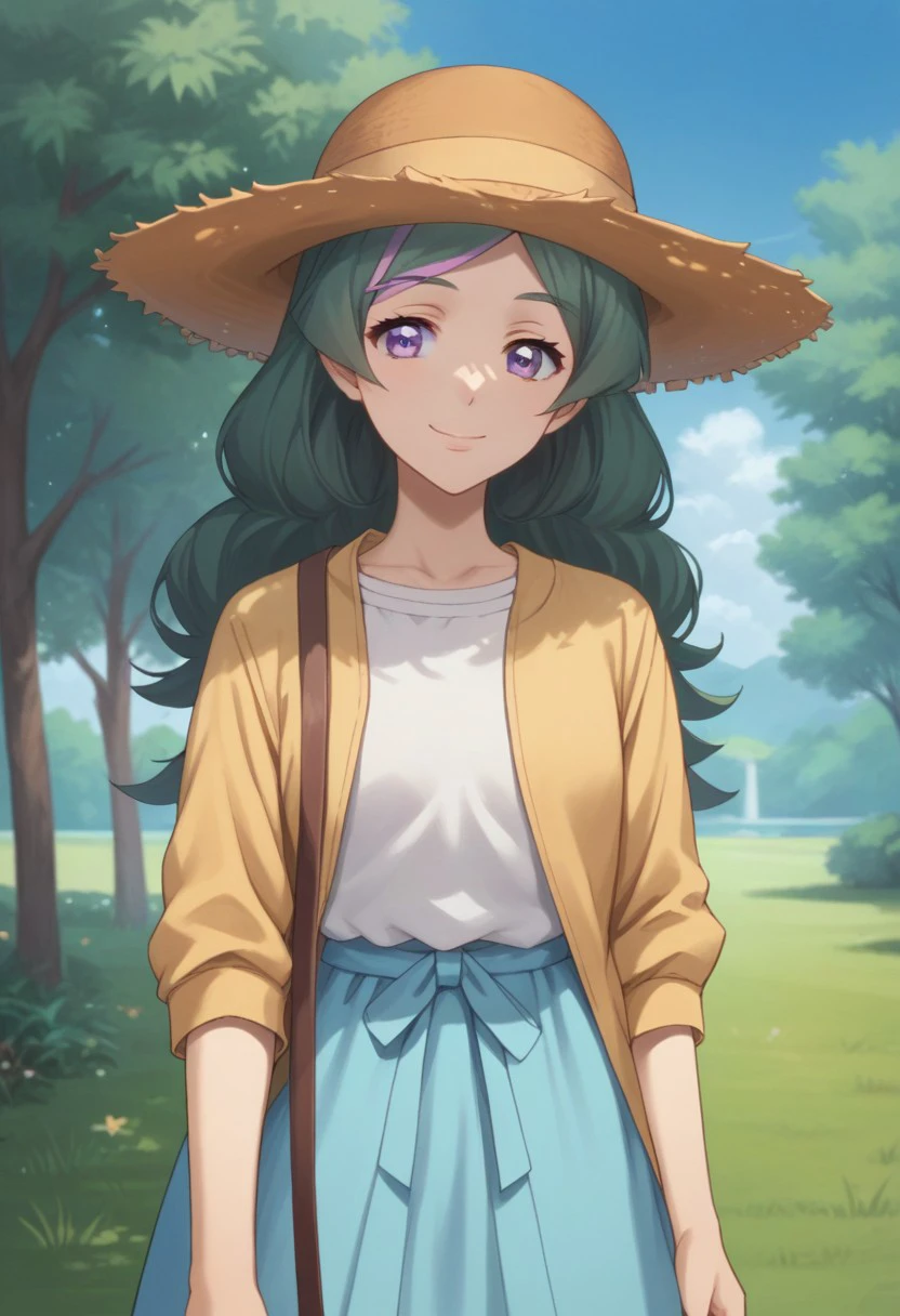 toki, 1girl, purple eyes, green hair, long hair, hair ornament, hairclip, skirt, long skirt,