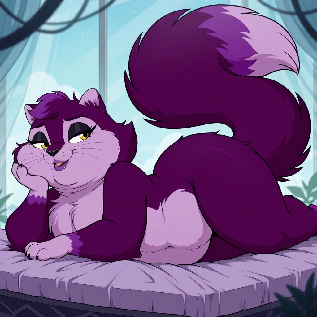 cat female, solo, dark purple fur with light purple accent, yellow eyes, dark purple lips, black nose, small purple tuft of hair, black claws, chubby, large puffy tail, light purple paws, black eyeshadow, chubby,