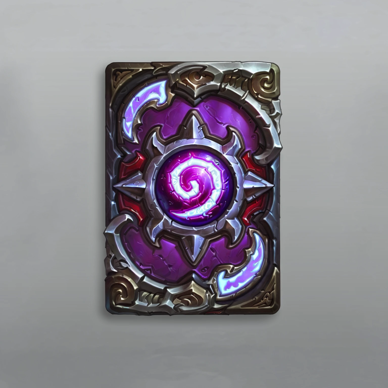 Example prompt: a card back that reflects the shield of the warrior of darkness, in the center is the purple glowing hearthstone logo, solid light grey background