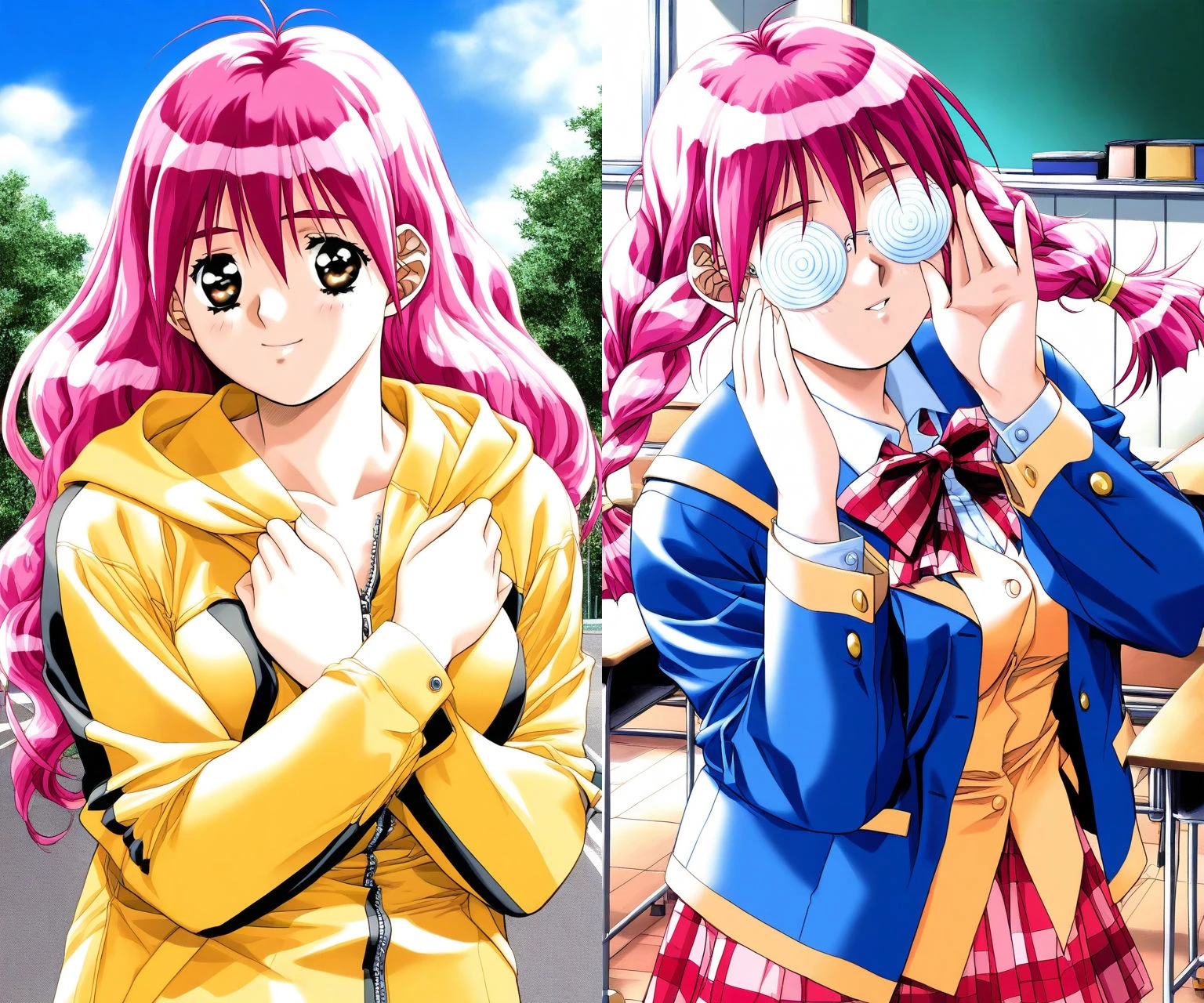 Kato_Minori(Doukyuusei2), 1girl, solo, pink hair, coke-bottle glasses, twin braids, twintails, medium breasts,