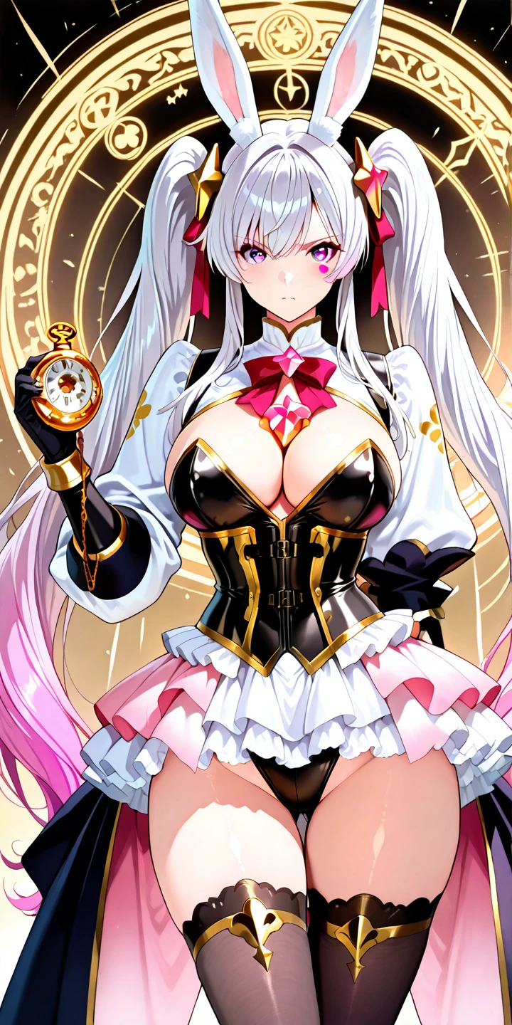 - Outfit: Black corset bodysuit + gold trim, red star gemstone, red bow tie, white puffy skirt, black thigh-high stockings with gold armor