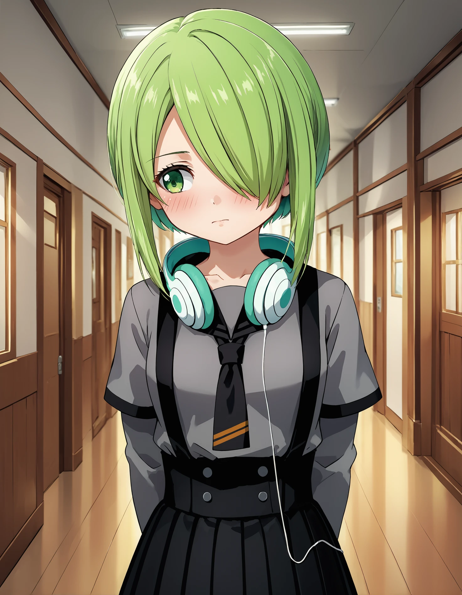 mgrcshiguremiyabi, shgcsl, green hair, short hair, green eyes, one eye covered, aqua headphones around neck, grey shirt, black sailor collar, black tie, short over long sleeves, black suspenders, black pleated skirt