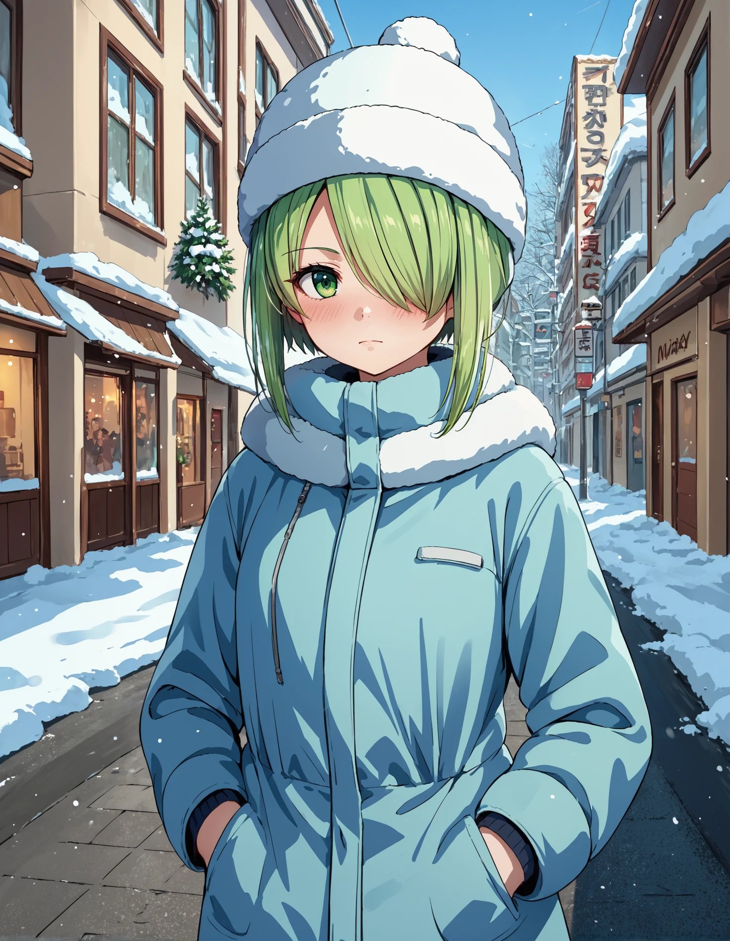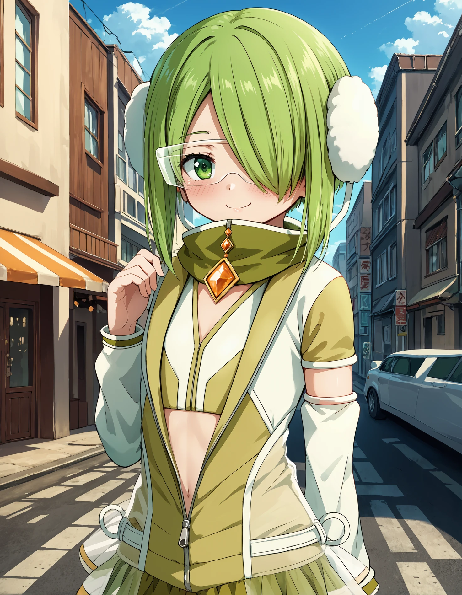 mgrcshiguremiyabi, shgmgc, green hair, short hair, green eyes, one eye covered, goggles, white earmuffs, green high collar, orange gem, white top, green partially unzipped jacket, white detached sleeves, green skirt, see-through overskirt
