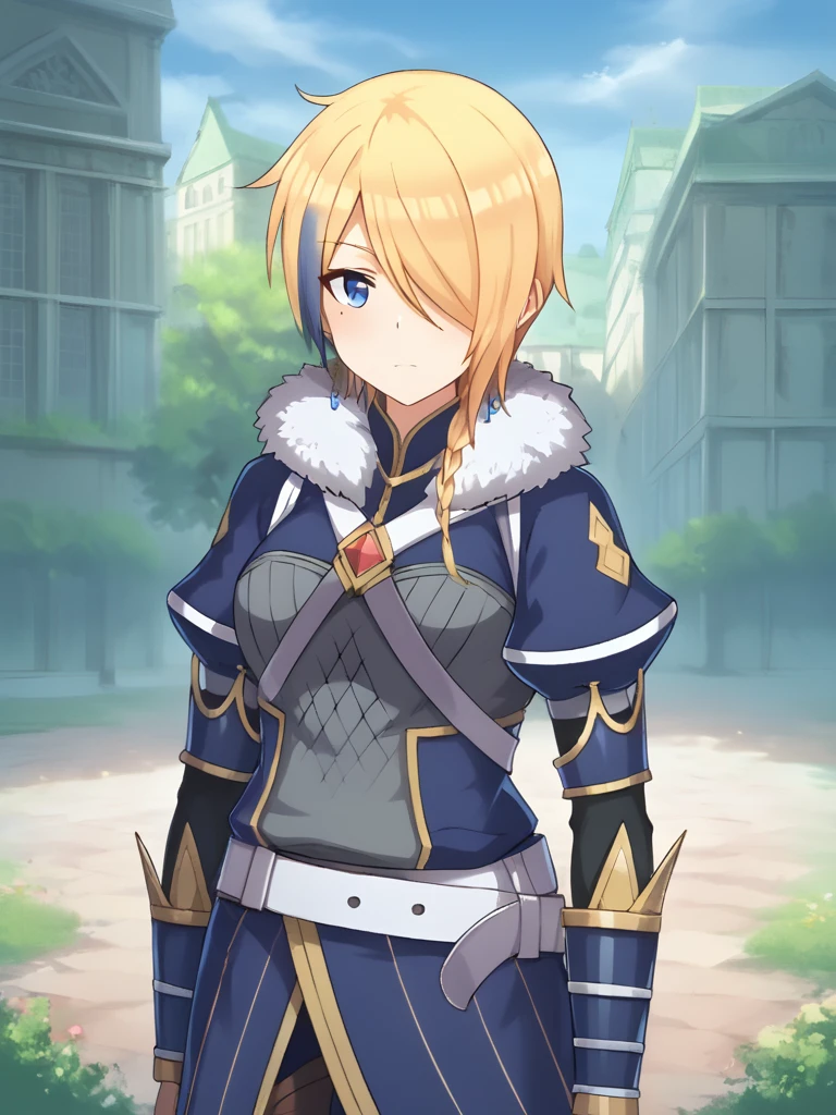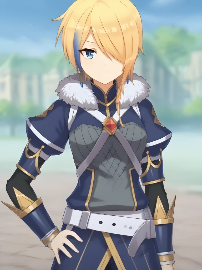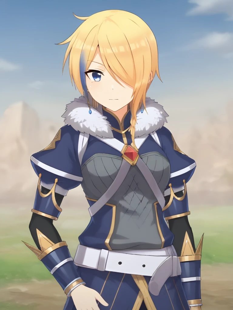 Prompt: claire-liver020-wattpad, solo, 1girl, blonde hair, blue hair, hair over one eye, multicolored hair, blue eyes, armor, short hair, mole, mole under eye, fur trim, braid, jewelry, streaked hair, earrings, belt