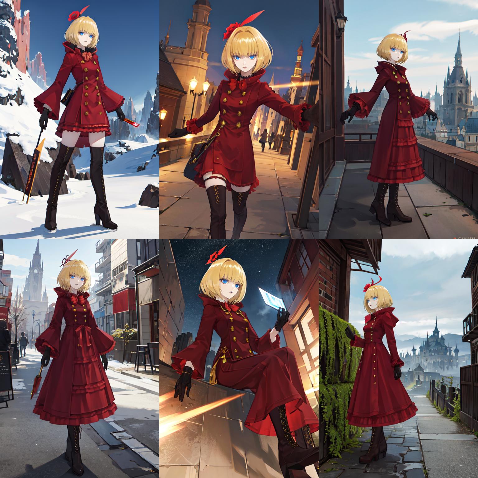 chizurusmt, blonde hair, short hair, blue eyes, hair ornament, long dress, boots, gloves,