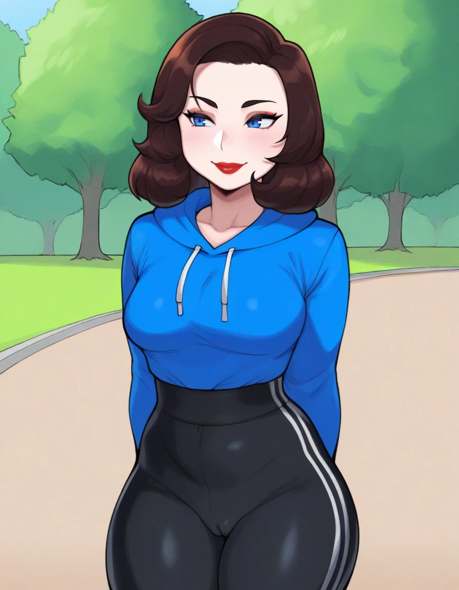 elizabeth bas, 1girl, brown hair, red lips, blue eyes, breasts, lips, makeup, lipstick, medium breasts, medium hair