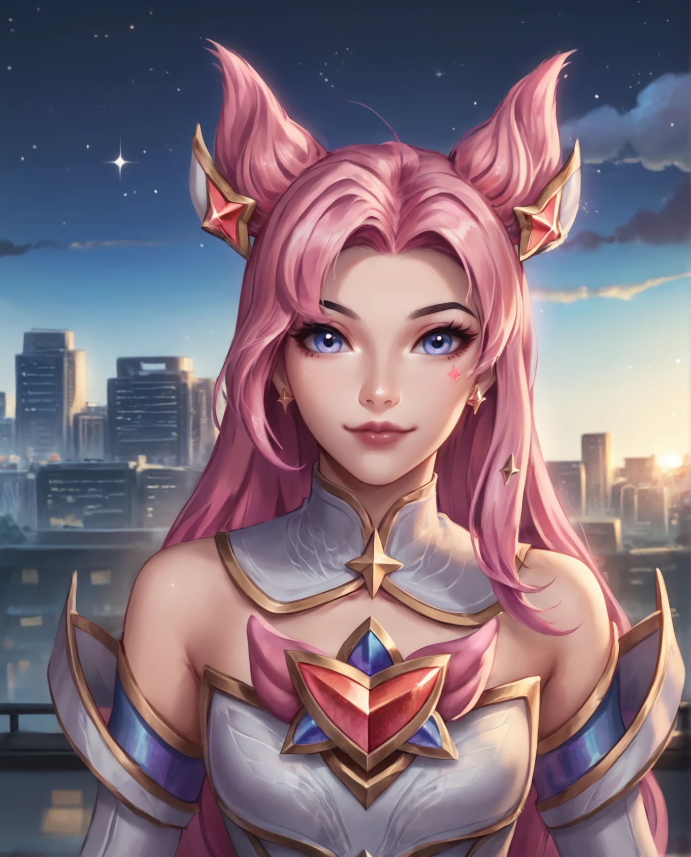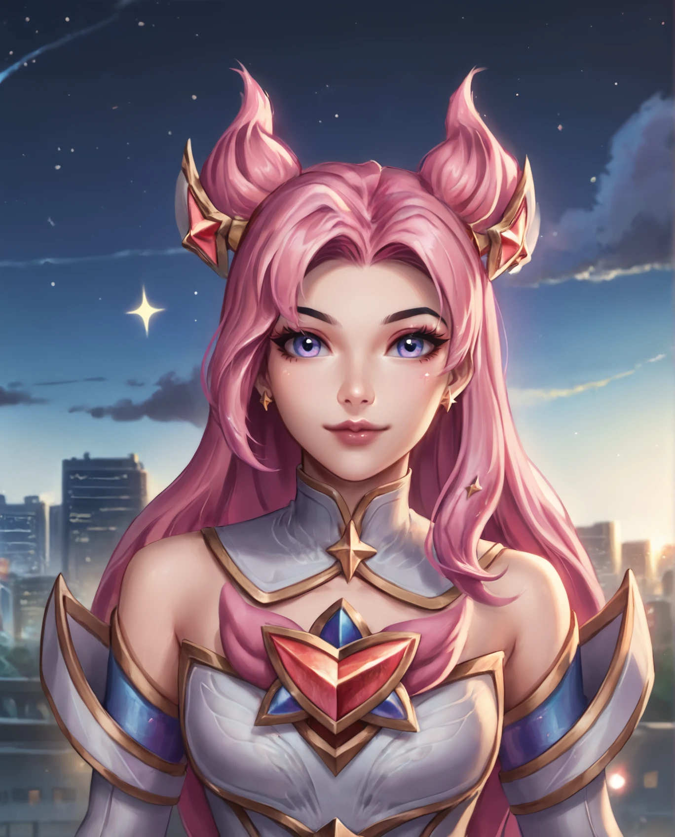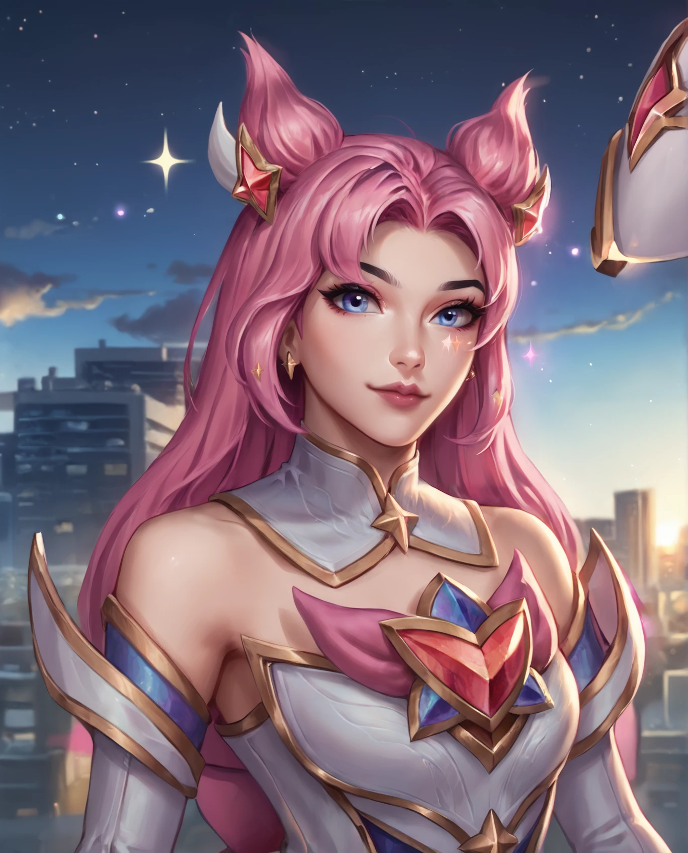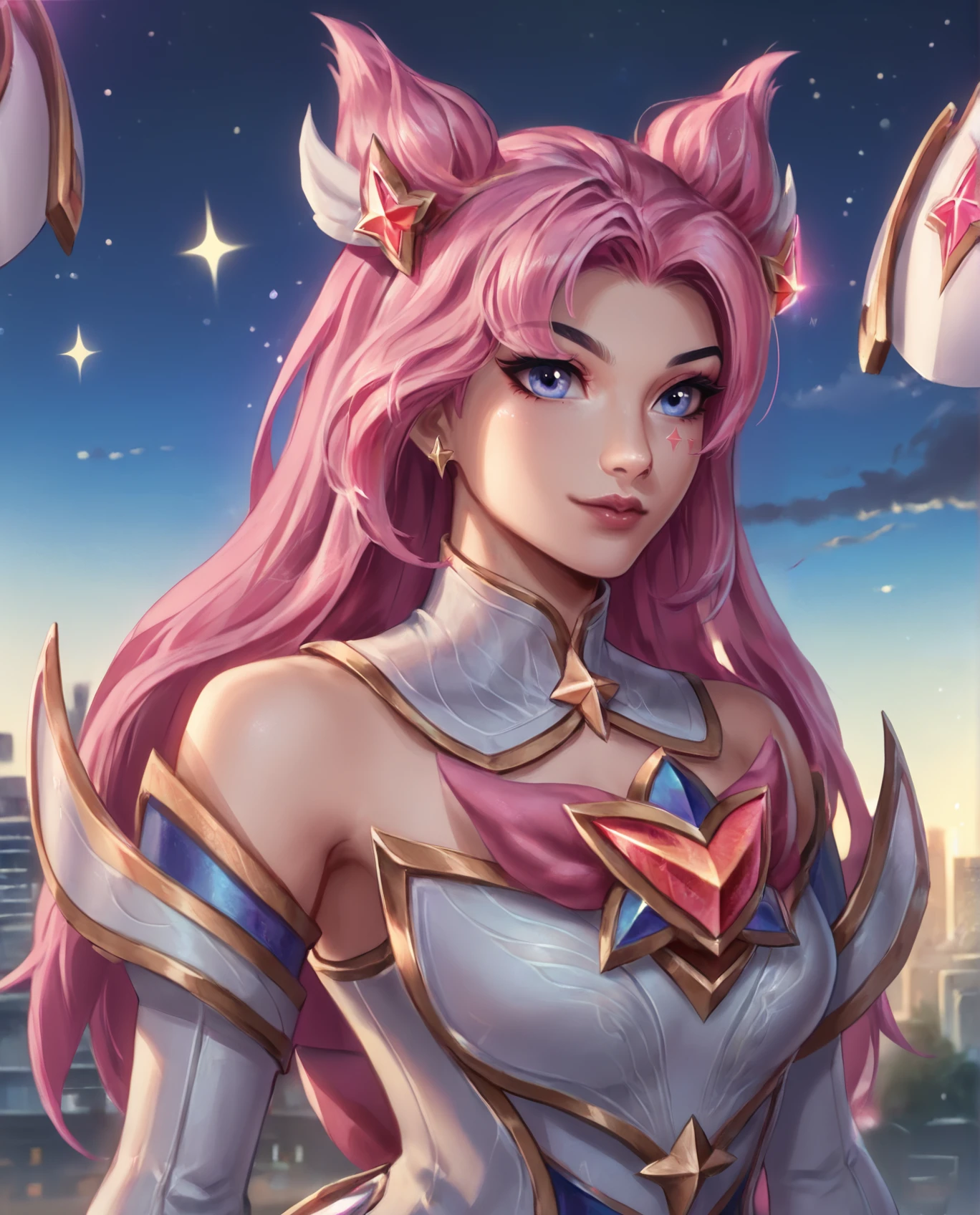 star guardian \(league of legends\), pink hair, pink eyes, twin cone buns, long hair, detached collar, detached sleeves, sailor outfit,