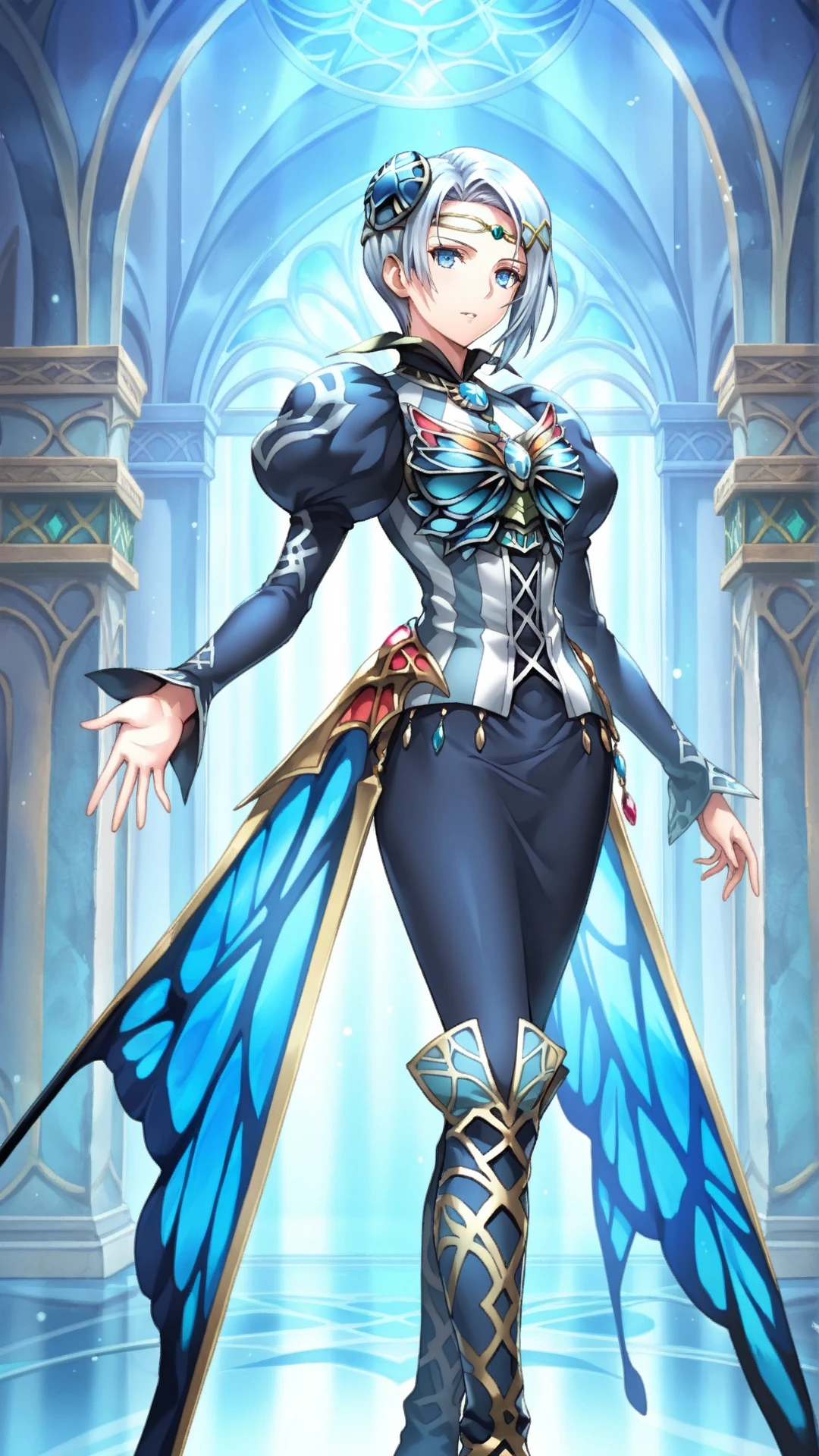 butterfly wings, long sleeves, puffy sleeves, circlet, boots, gem, dress, hair ornament,