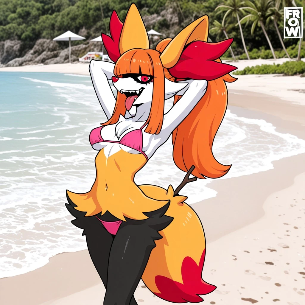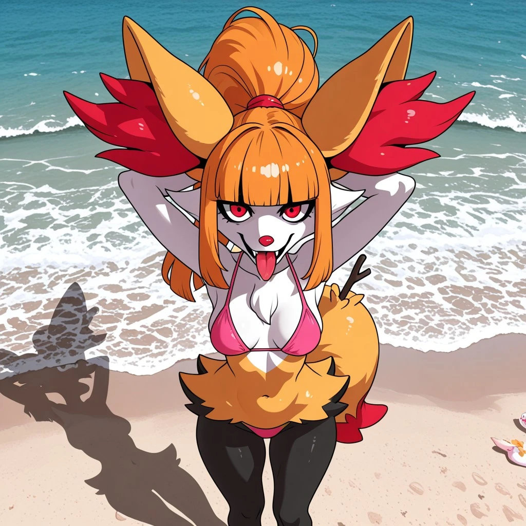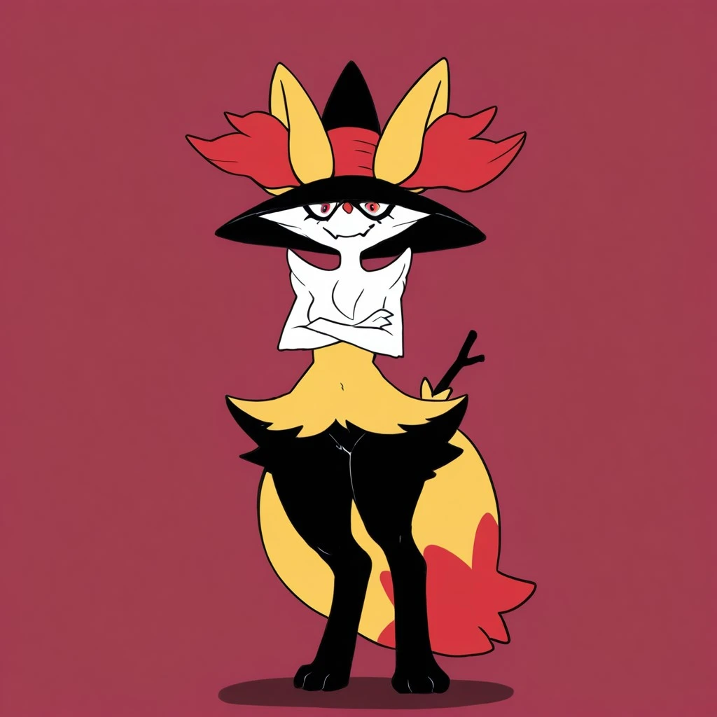 pokemon (creature), braixen, fox, fox girl, fennec fox, white and orange fur, black leg fur, red eyes, shadow around eyes, red nose, large fox ears, red ear fluff, fluffy fox tail, red tail tip, witch hat, ears though hat,