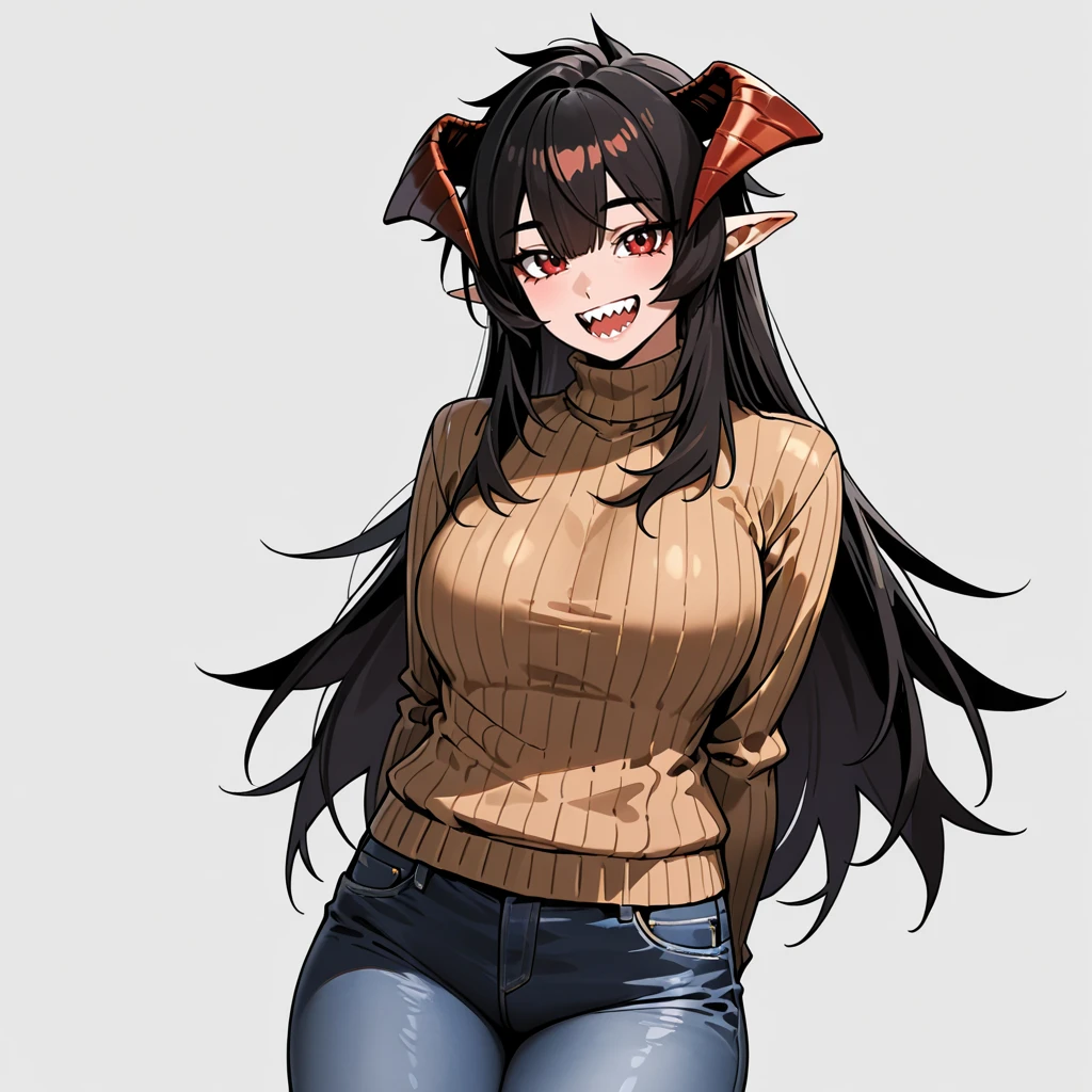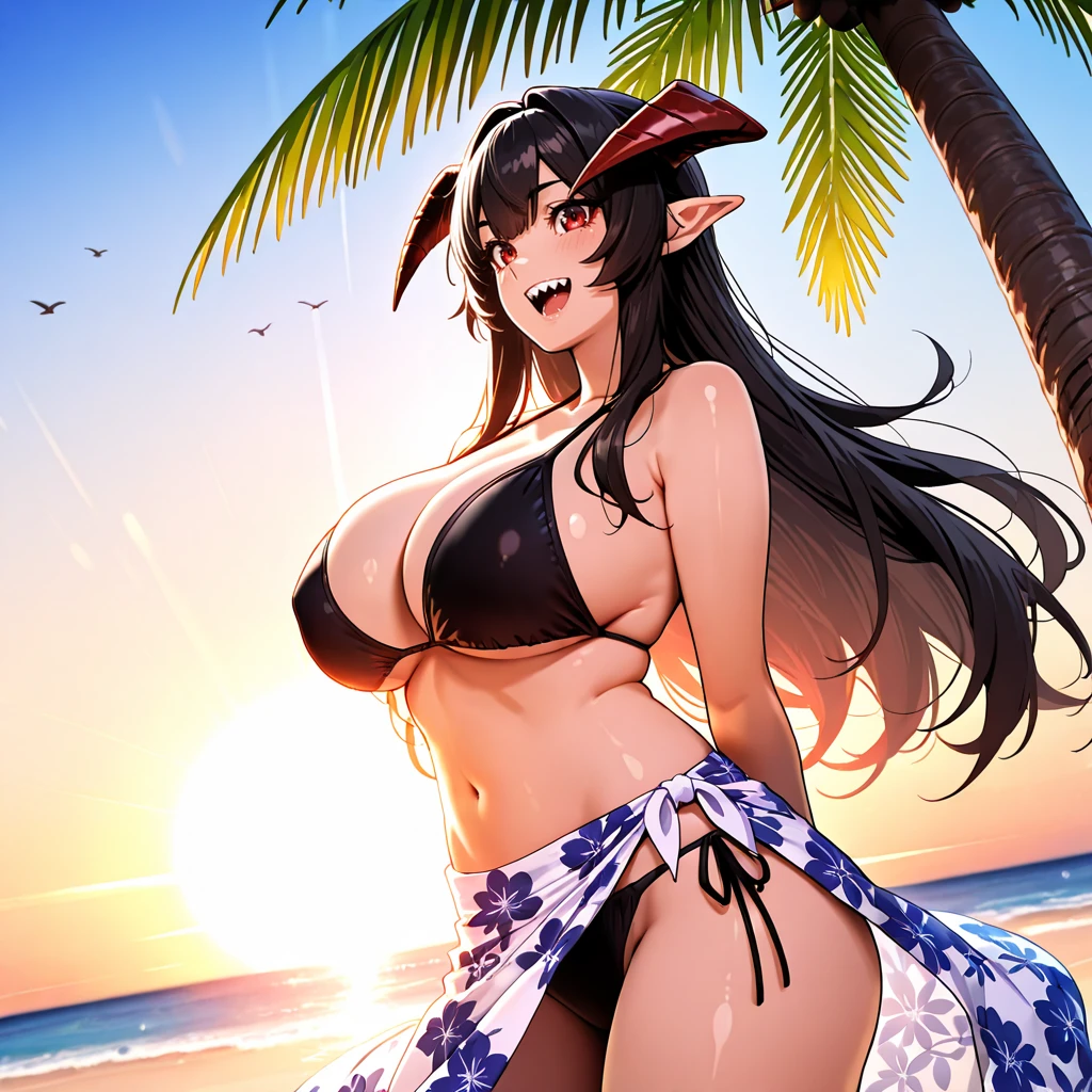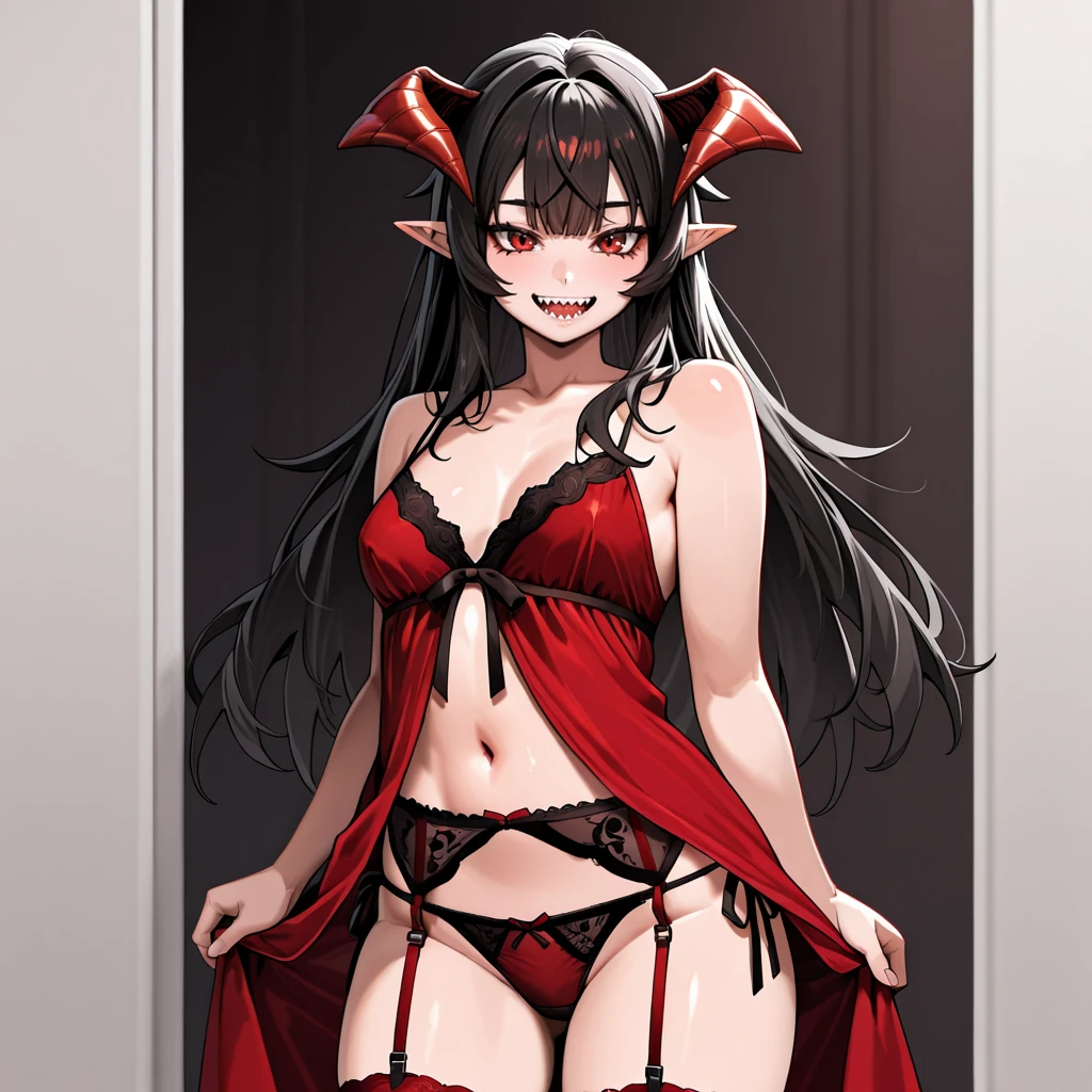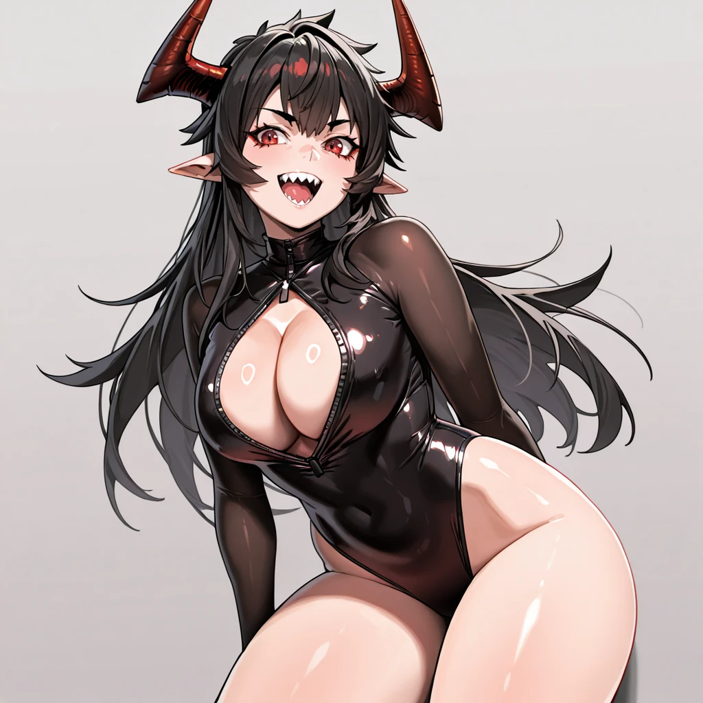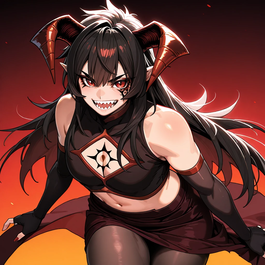 Trigger : DemonKing, 1girl, demon horns, red eyes, elbow gloves, pointy ears, long hair, bare shoulders, clothing cutout, black hair, sharp teeth, fingerless gloves, cleavage cutout, chest tattoo, midriff, navel, facial tattoo, sleeveless, pantyhose, bangs, crop top, skirt, black gloves, cowboy shot